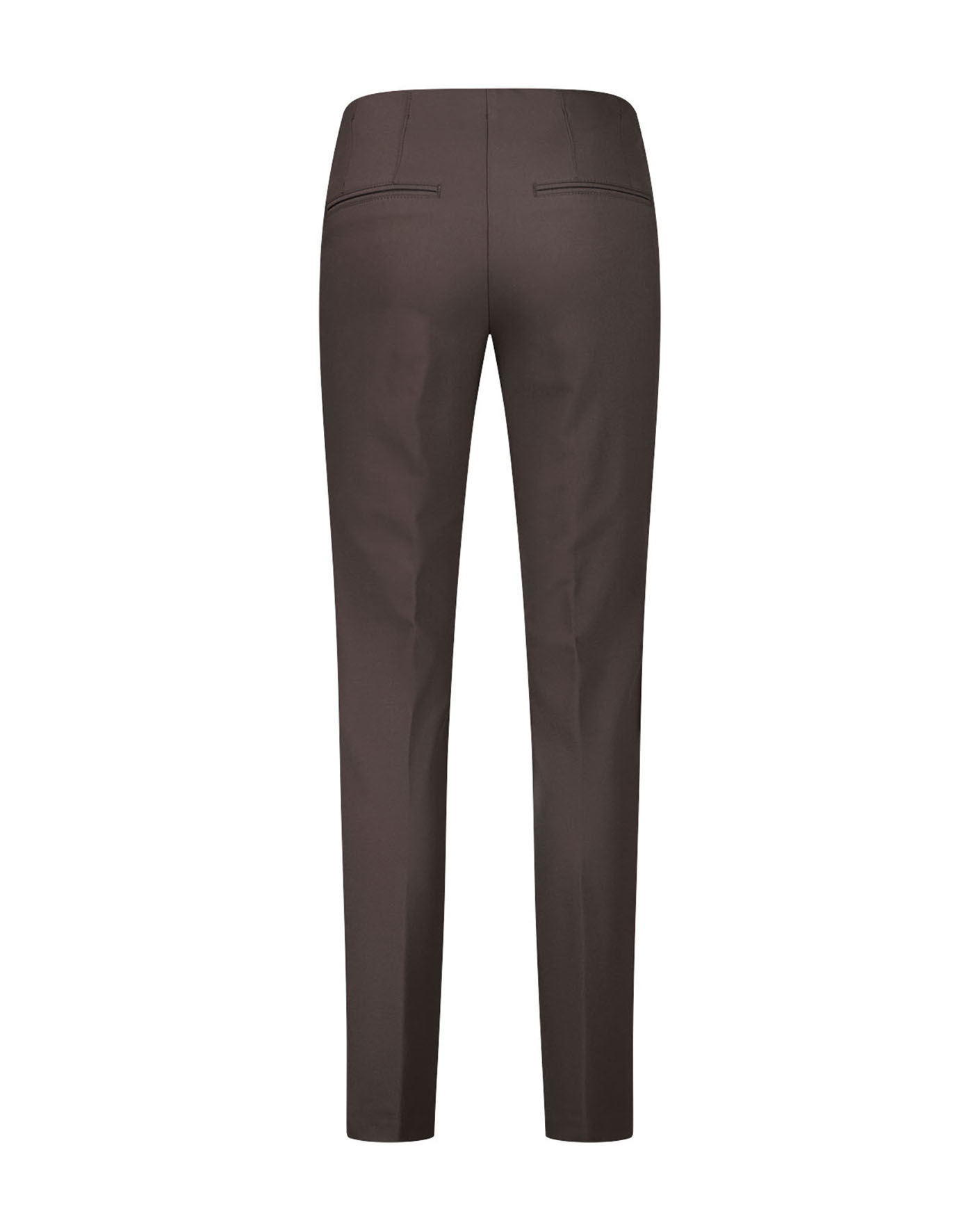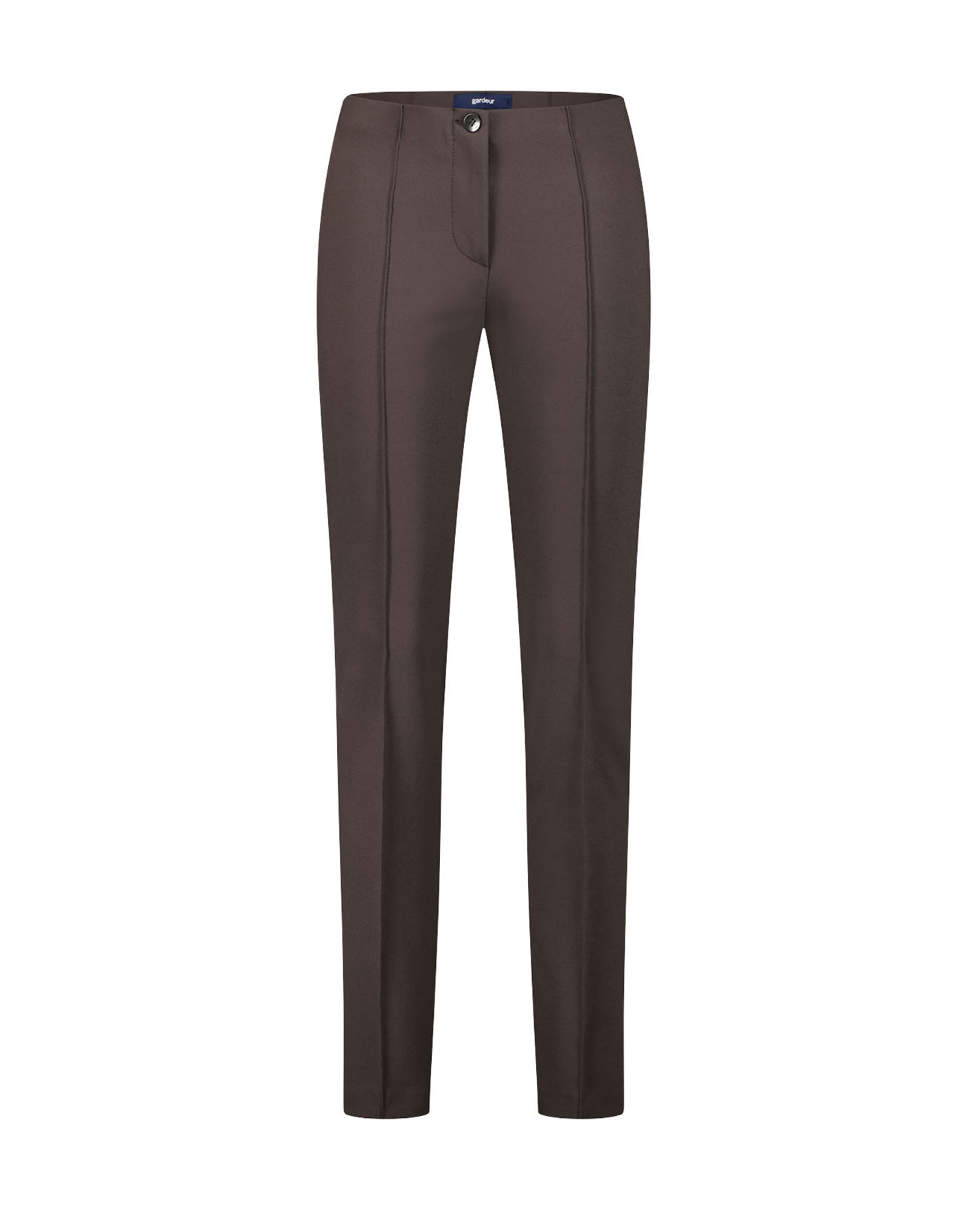 Зауженные брюки Gardeur темно-коричневого цвета. Модель с завышенной талией на стандартной застекже, имеются врезные карманы по бокам и сзади. Также выделенные швы по центру штанин со стрелками. Брюки можно сочетать с блузой, рубашкой, джемпером, кардиганом, жакетом, жилетом.