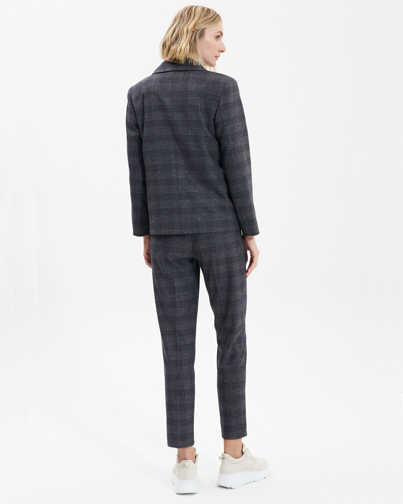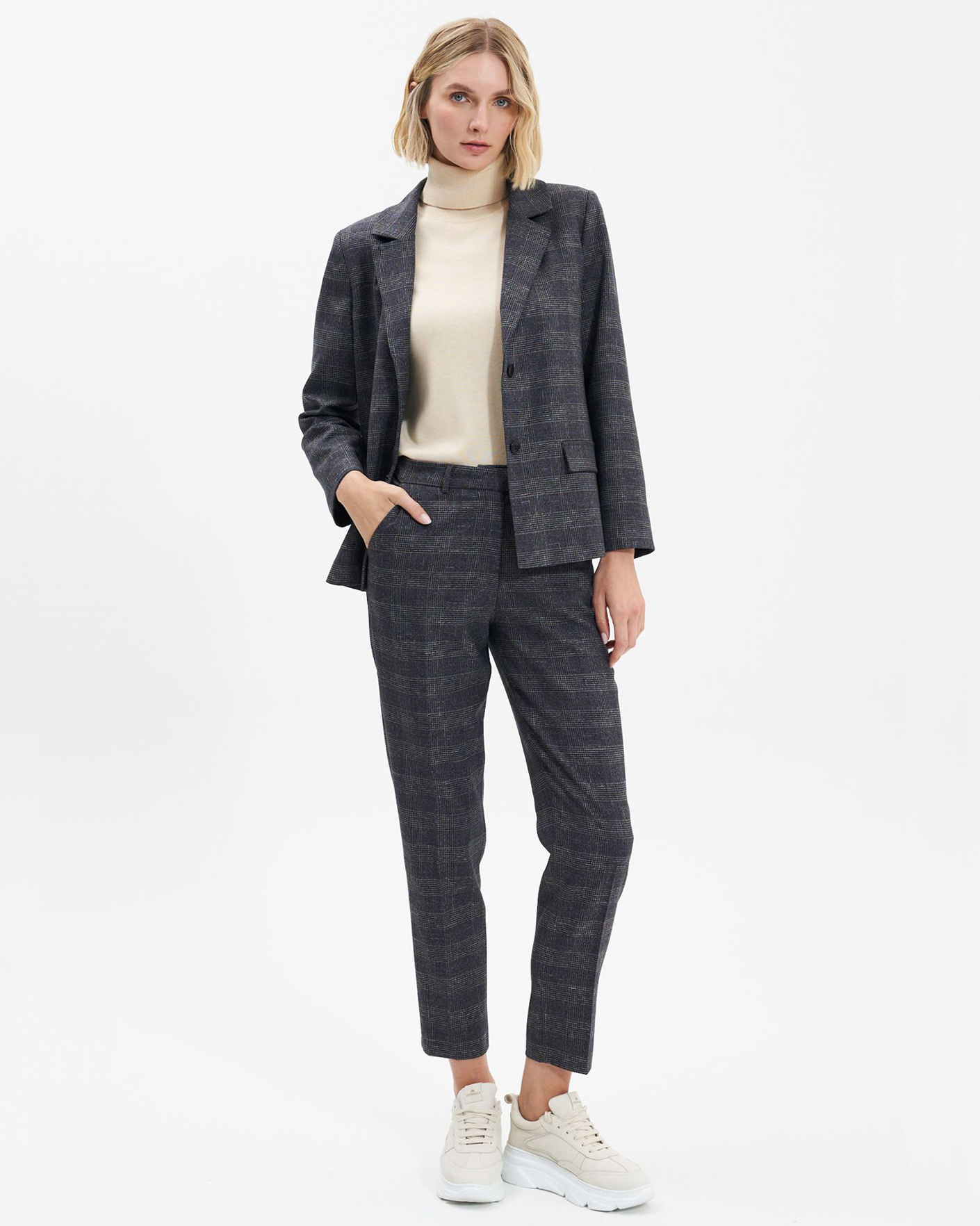 Зауженные брюки UNQ серого цвета в мультиклетку. Модель на скрытой застежке, имеются шлейки под узкий ремешок, а также врезные карманы. Классические брюки можно сочетать с топом, рубашкой, блузой, джемпером, свитером, кардиганом, жакетом и жилетом.