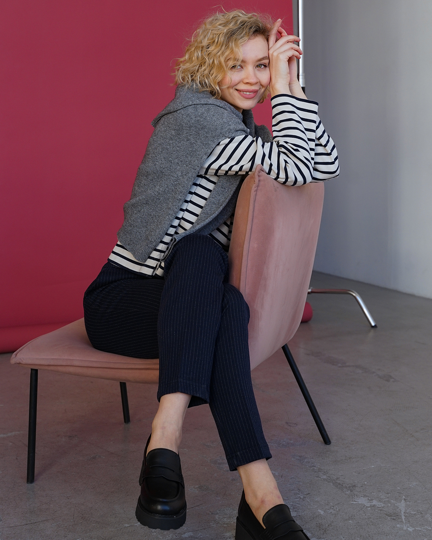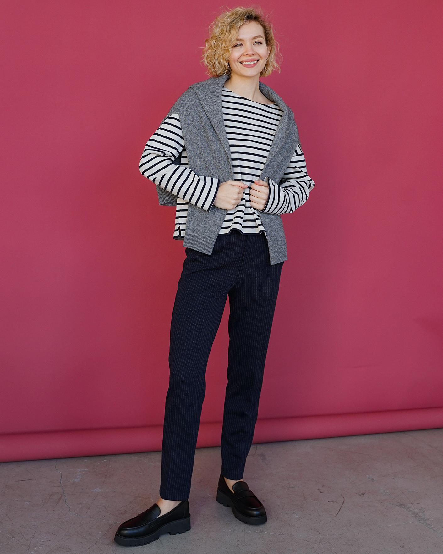 Зауженные брюки OUI темно-синего цвета в узкую вертикальную полосу. Модель на стандартной застежке, имеются врезные карманы по бокам. Классические брюки станут незаменимой вещью на каждый день.