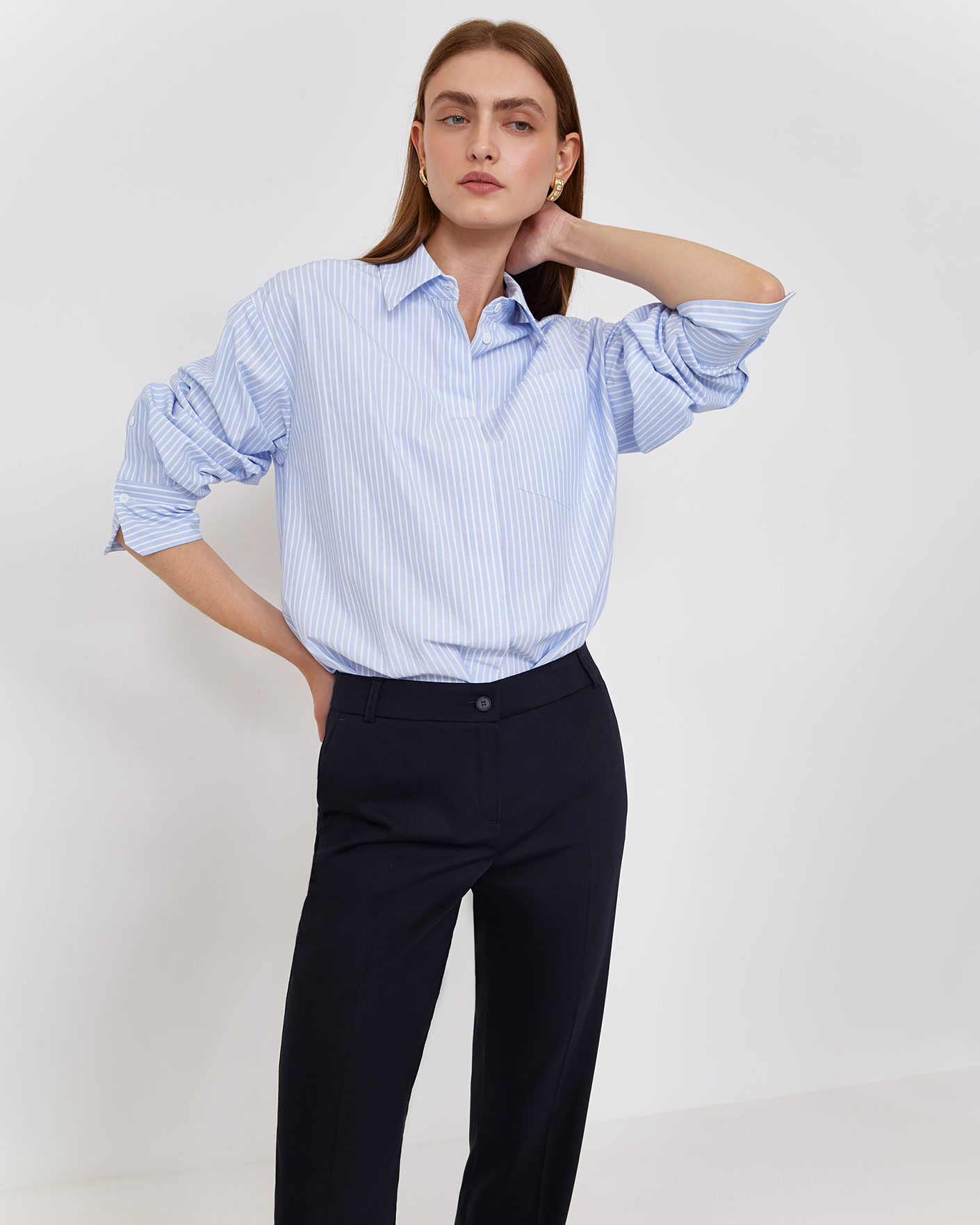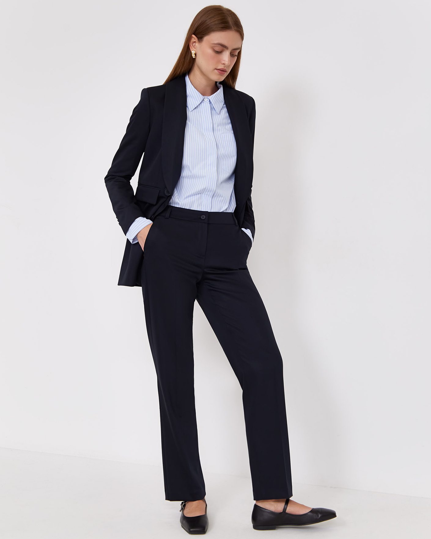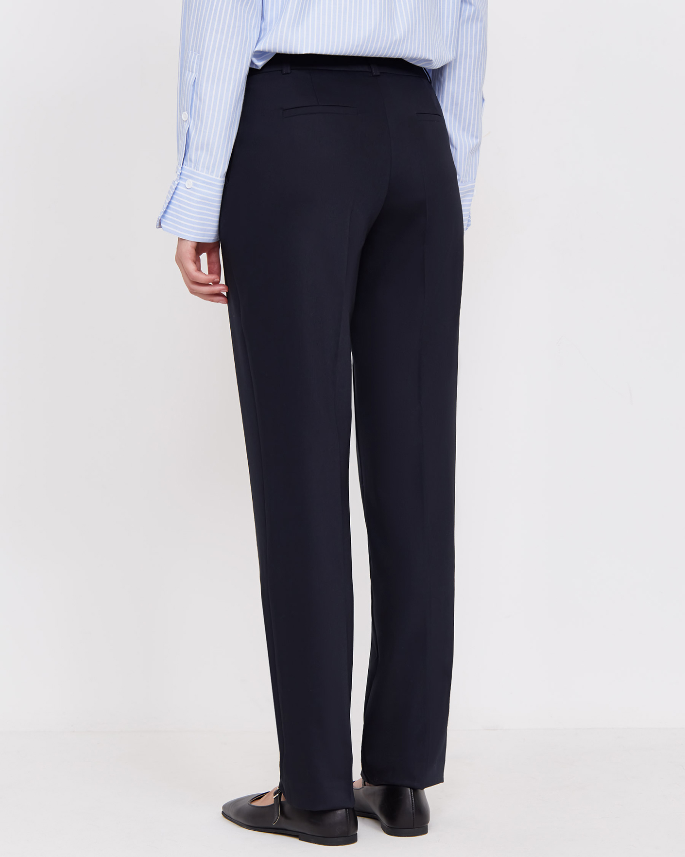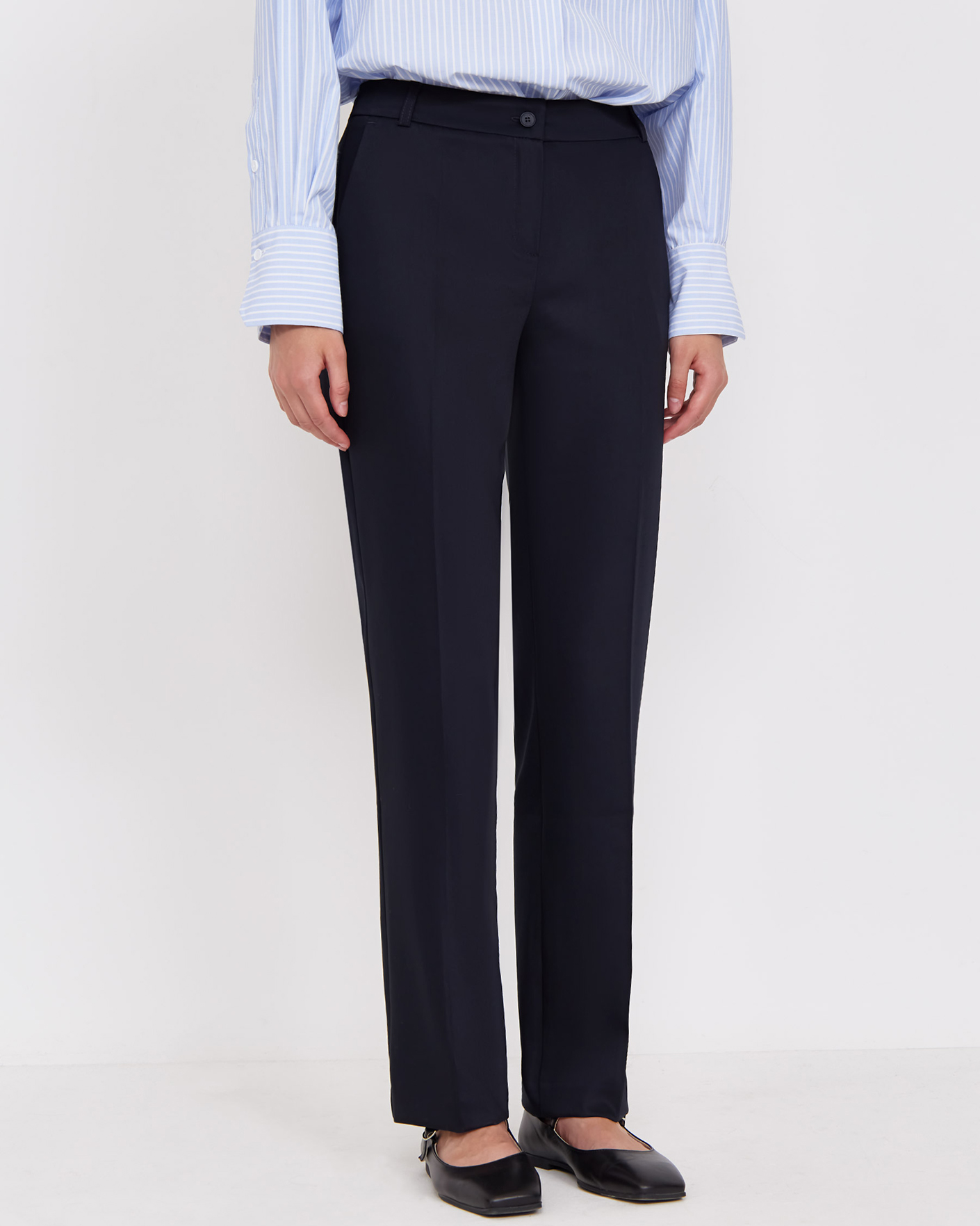 Классические брюки Emka черного цвета со стрелками. Модель на стандартной застежке, имеются врезные карманы по бокам и сзади. Брюки можно сочетать с топом, рубашкой, блузой, джемпером, кардиганом, жилетом и жакетом.