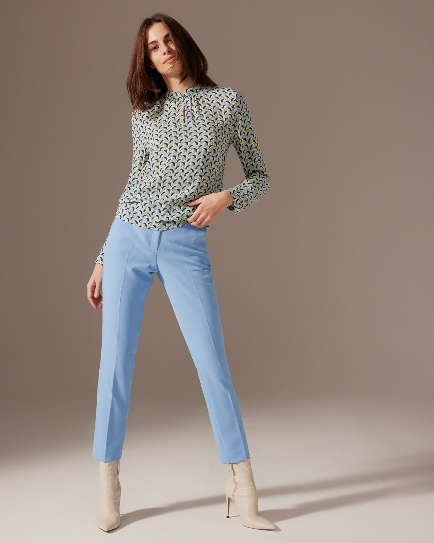 Зауженные брюки More&More голубого цвета со стрелками. Модель комфортной посадки на скрытой застежке, имеются врезные карманы по бокам и сзади. Брюки можно сочетать с топом, футболкой, рубашкой, джемпером, кардиганом и жакетом.