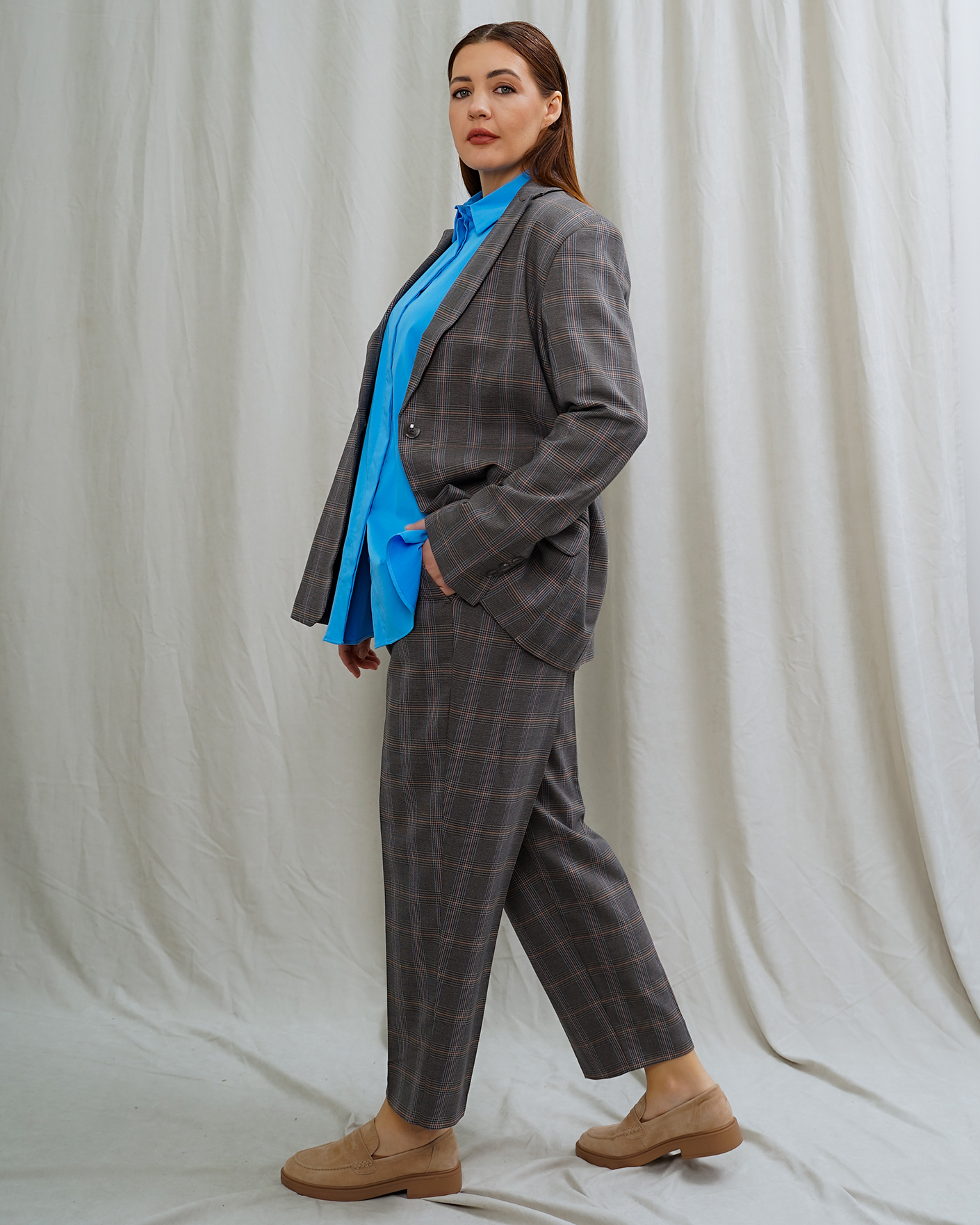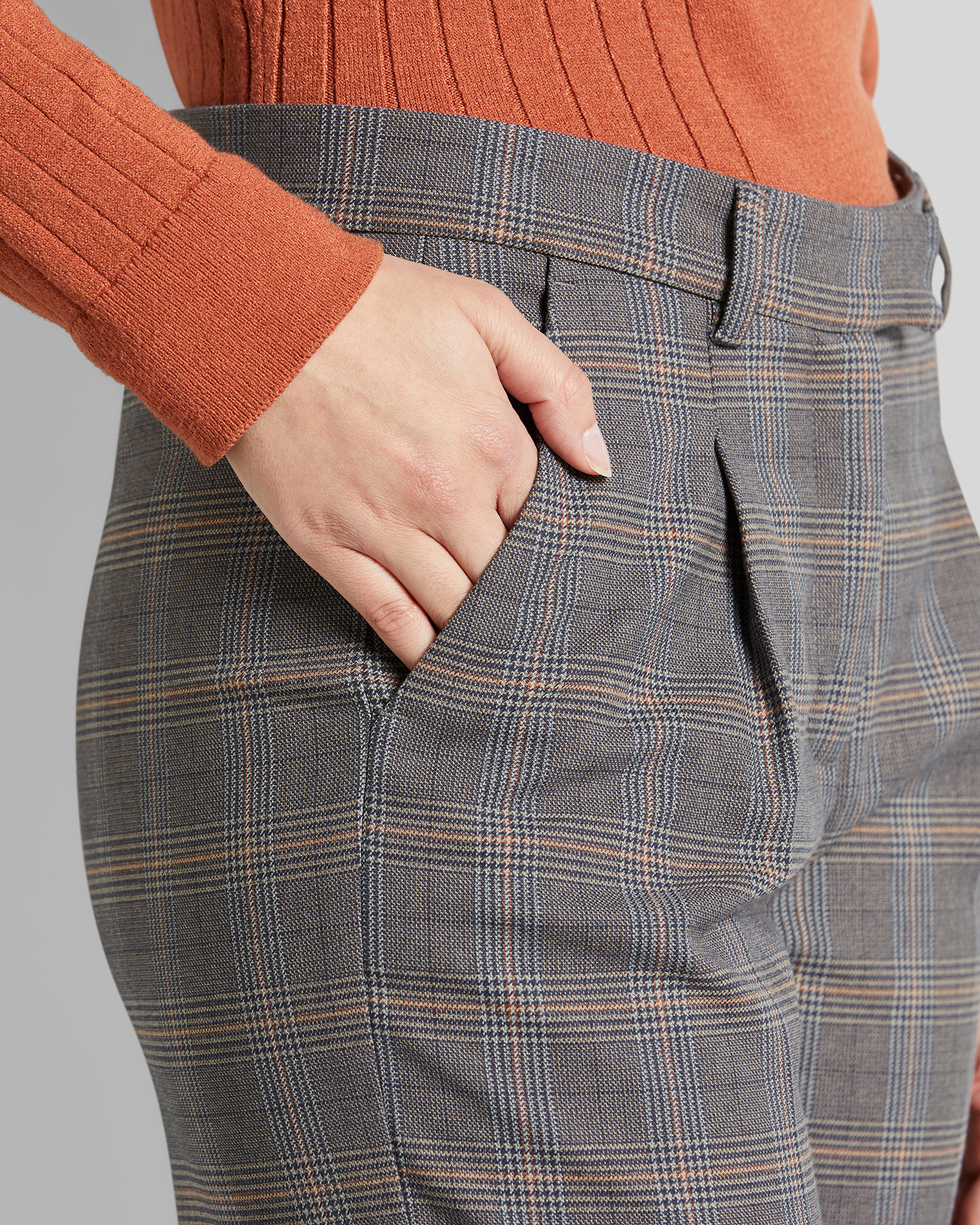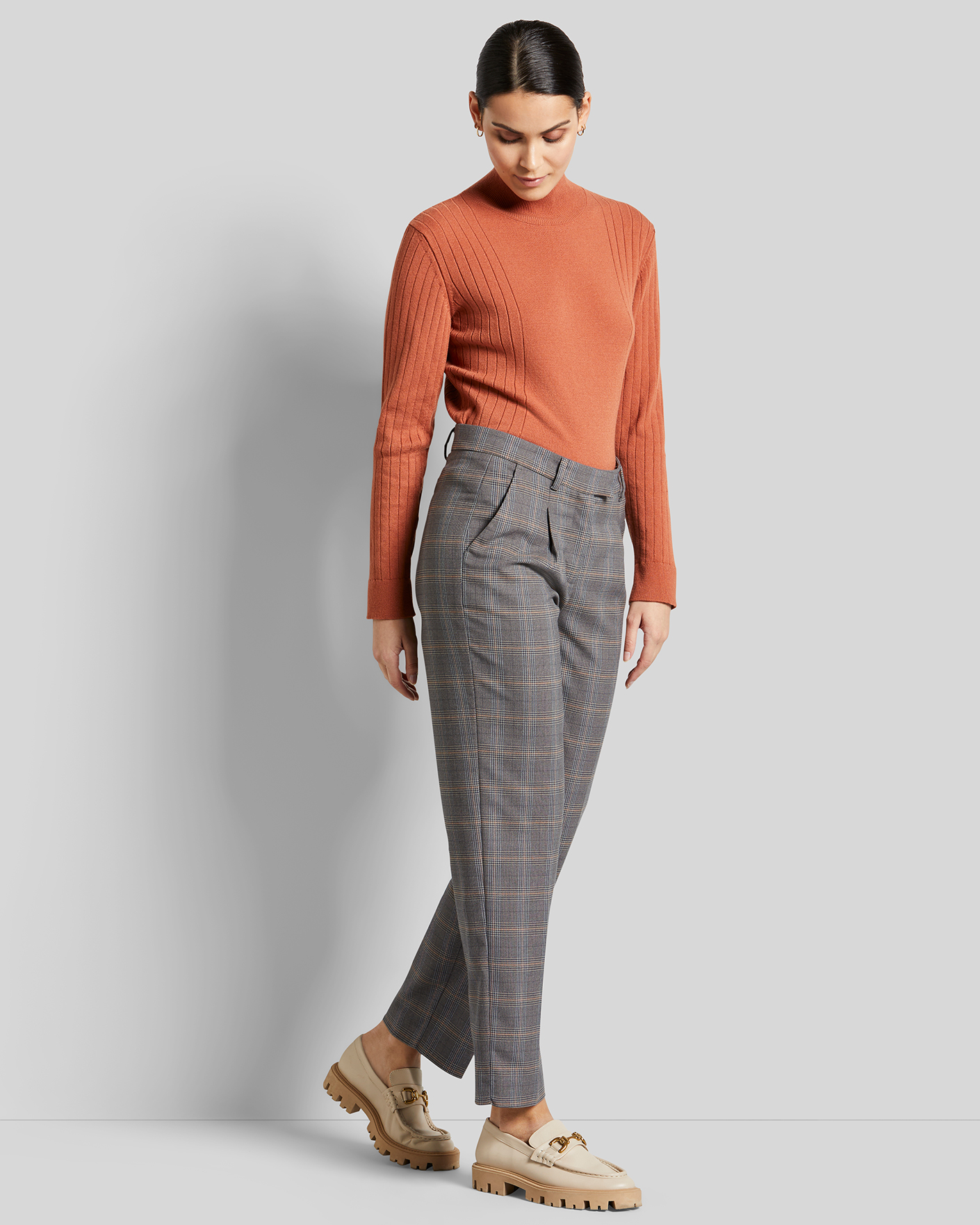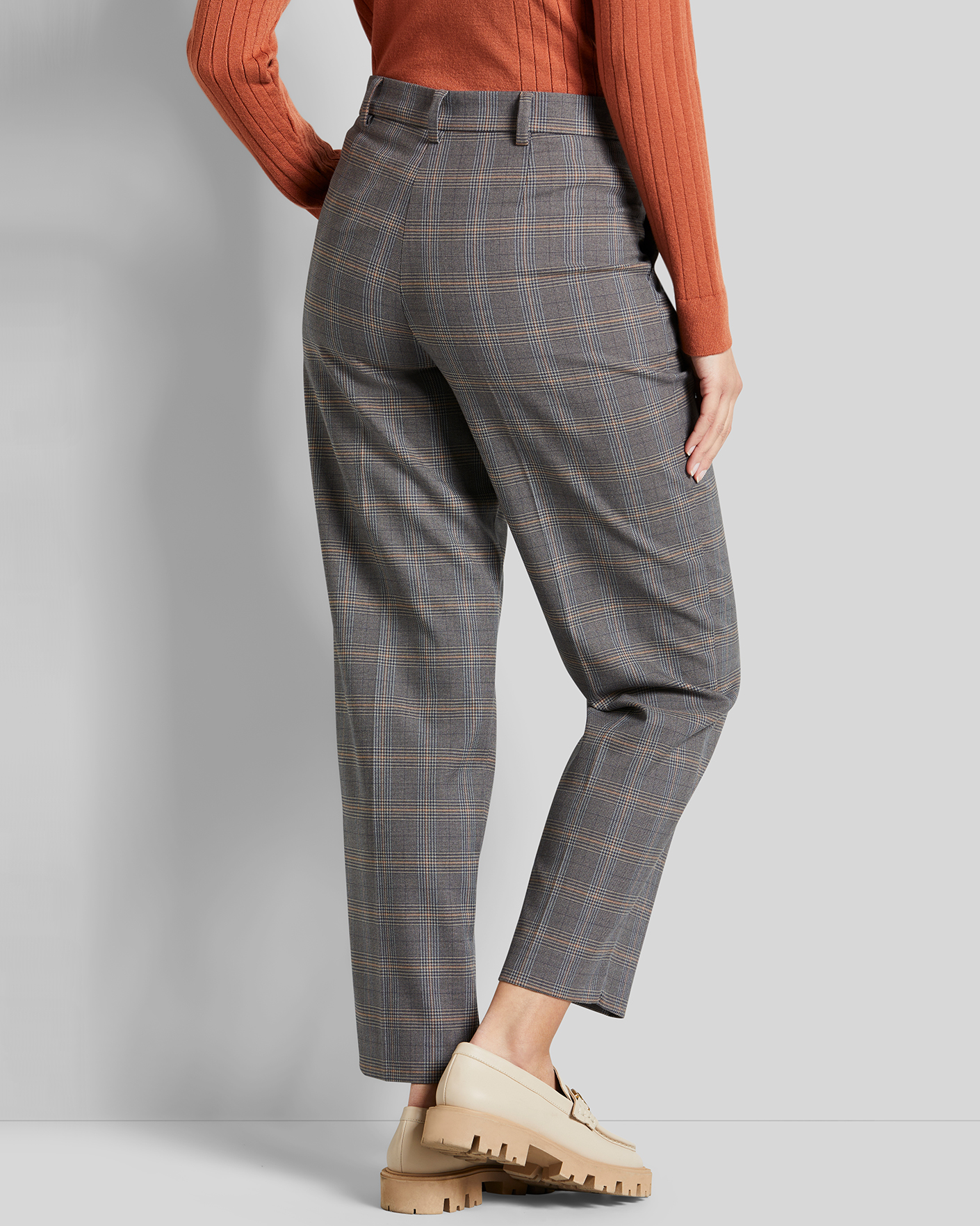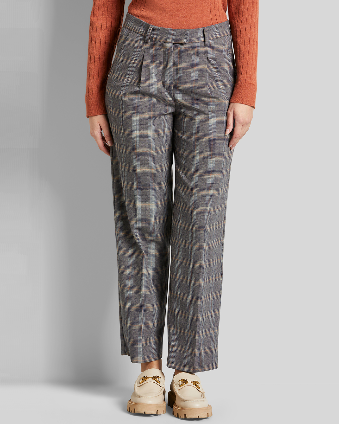 Зауженные брюки Bugatti бежево-серого цвета в клетку. Модель на защипах, скрытая застежка, врезные карманы по бокам. Брюки можно сочетать с футболкой, рубашкой, блузой, водолазкой, джемпером, кардиганом, жакетом и жилетом.