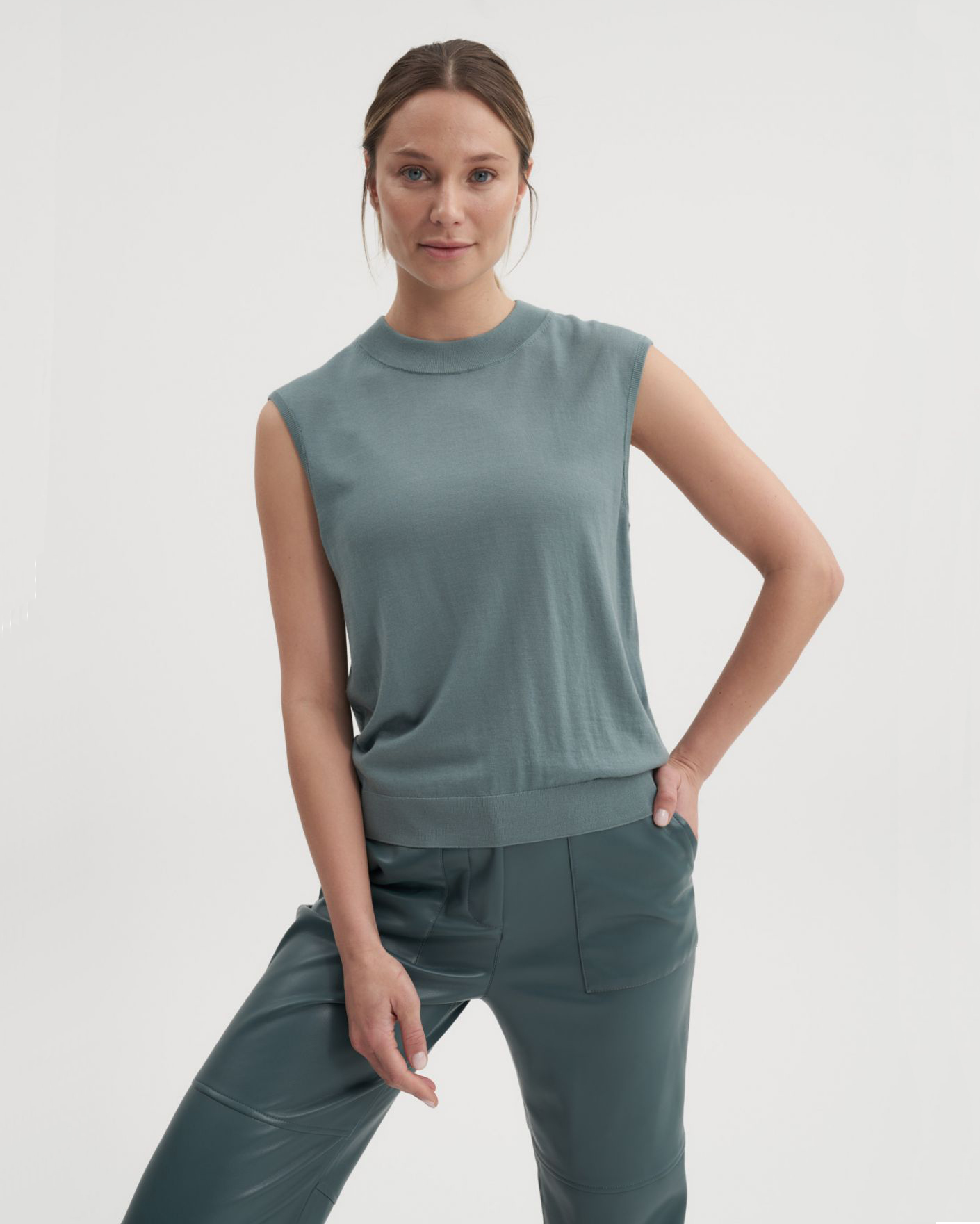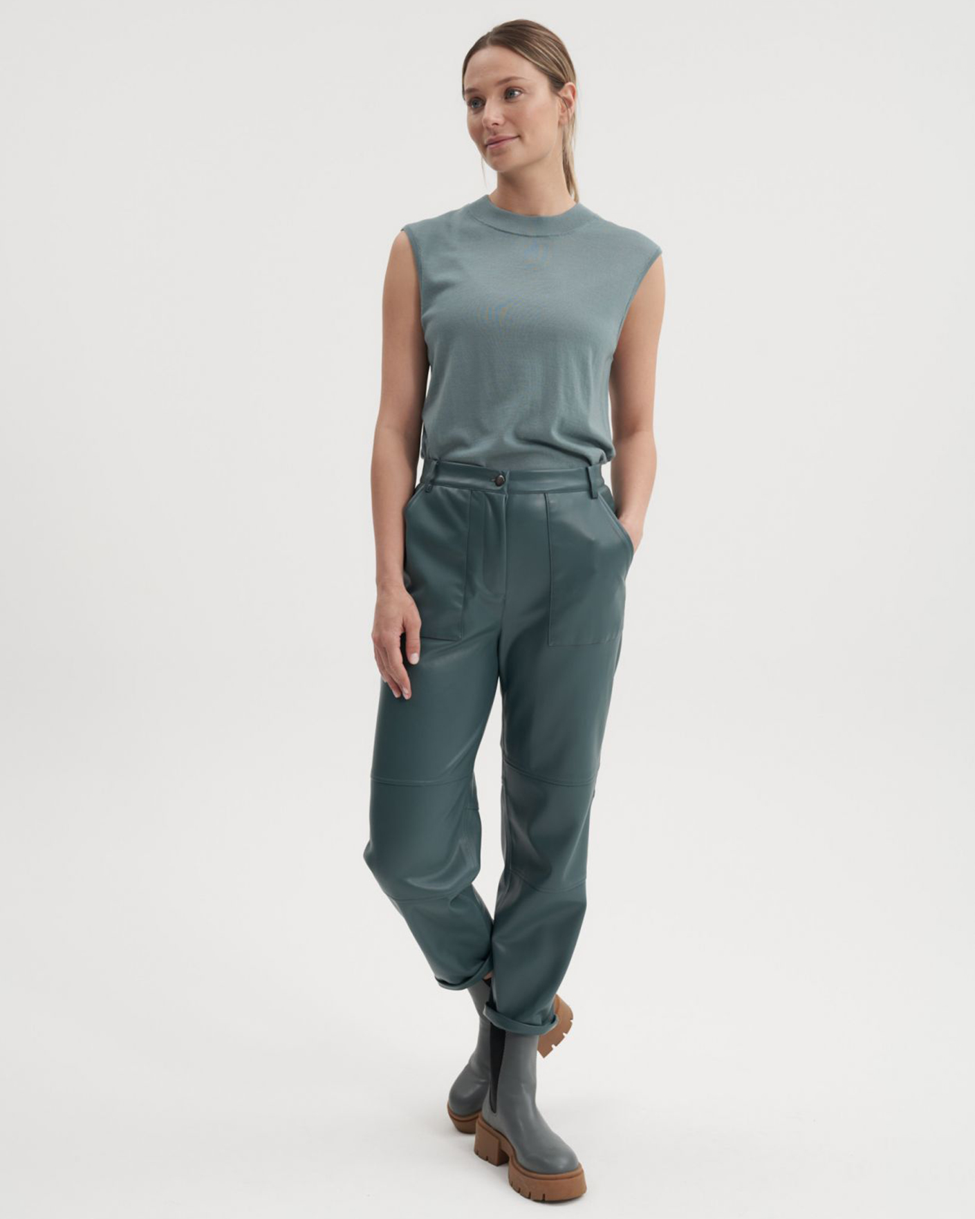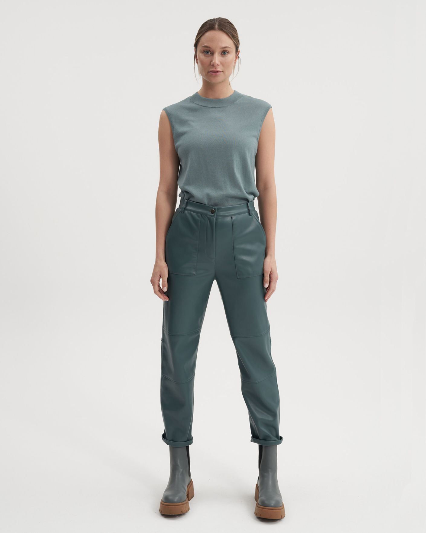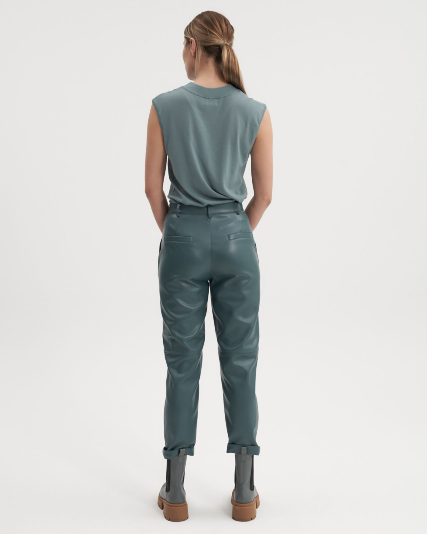 Стильные брюки UNQ бирюзового цвета с покрытием. Модель с завышенной талией на стандартной застежке, имеются накладные карманы по бокам и врезные сзади. Брюки станут фаворитами вашего гардероба на каждый день.