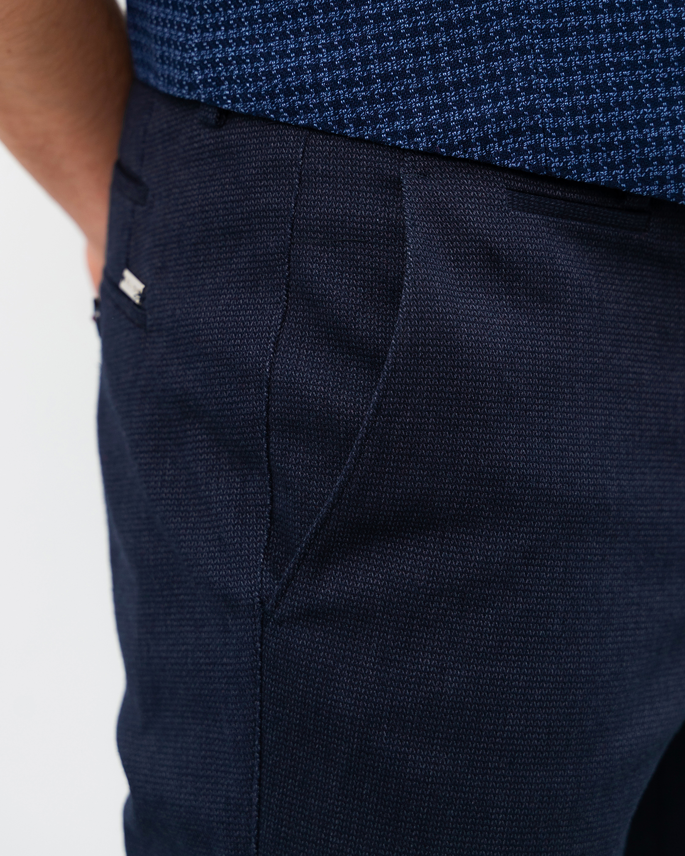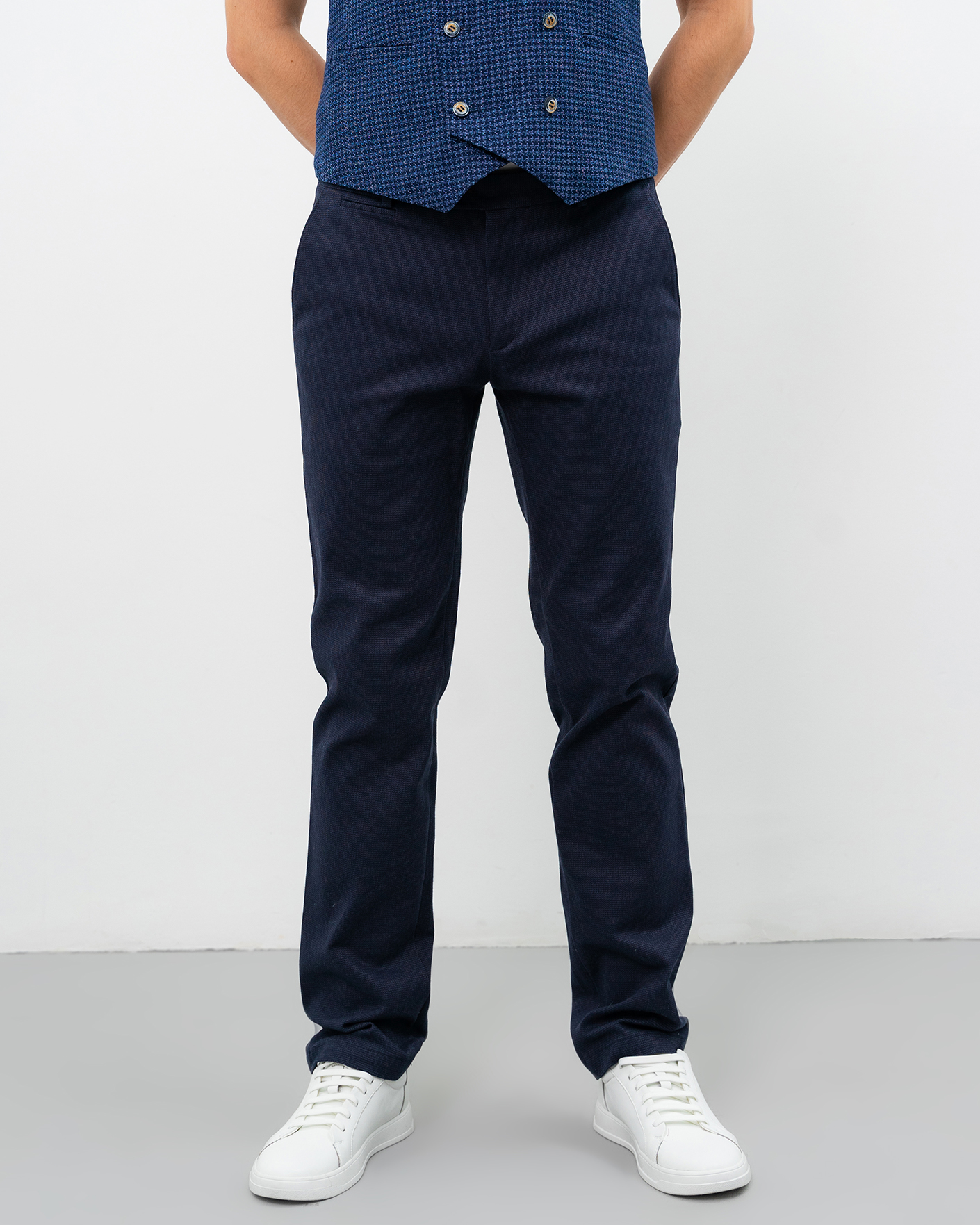 Брюки-чиносы Truvor фиолетово-синего цвета в мелкий рисунок. Модель на стандартной застежке, имеются врезные карманы по бокам и сзади. Чиносы отлично сочетаются с любым гардеробом.