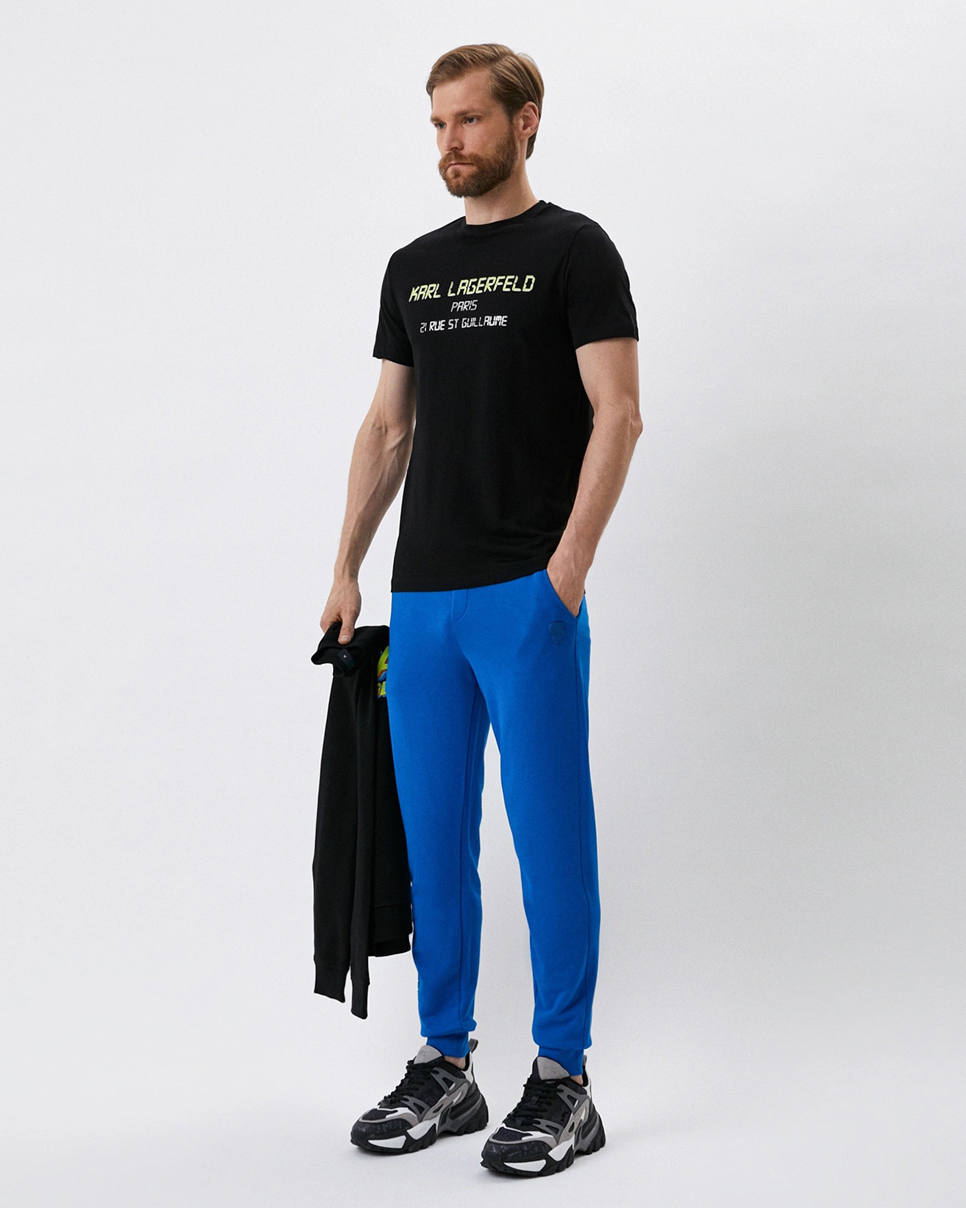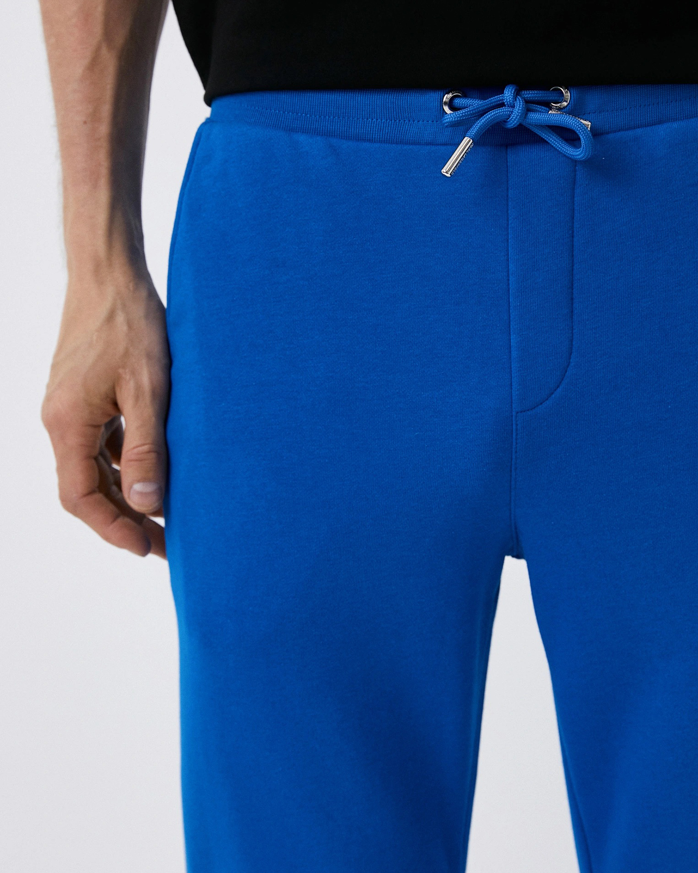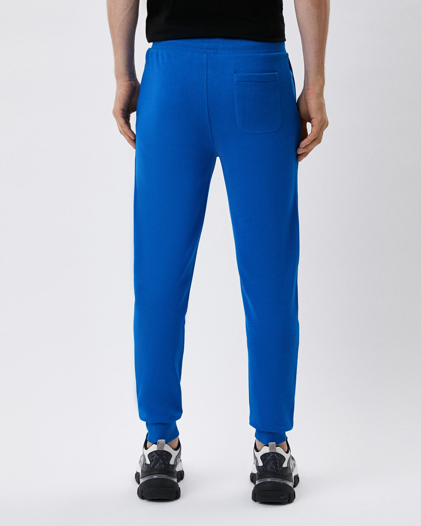 Брюки-джоггеры Karl Lagerfeld ярко-синего цвета. Модель с поясом на ребристой резинке со вставным шнурком. Имеются врезные карманы по бокам и накладной сзади. Манжеты на тонкой резинке. Джоггеры отлично впишутся в ваш гардероб в спортивном стиле.