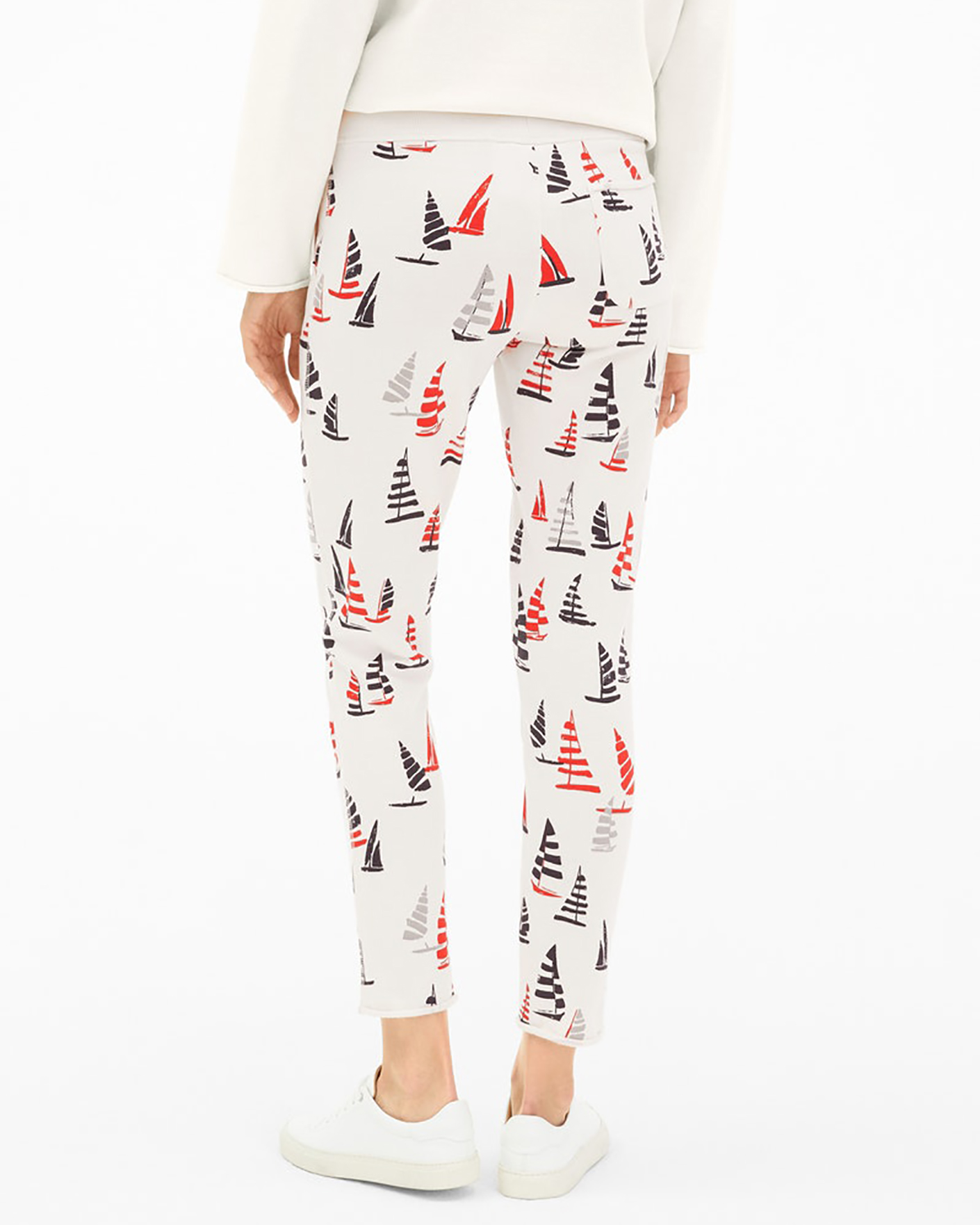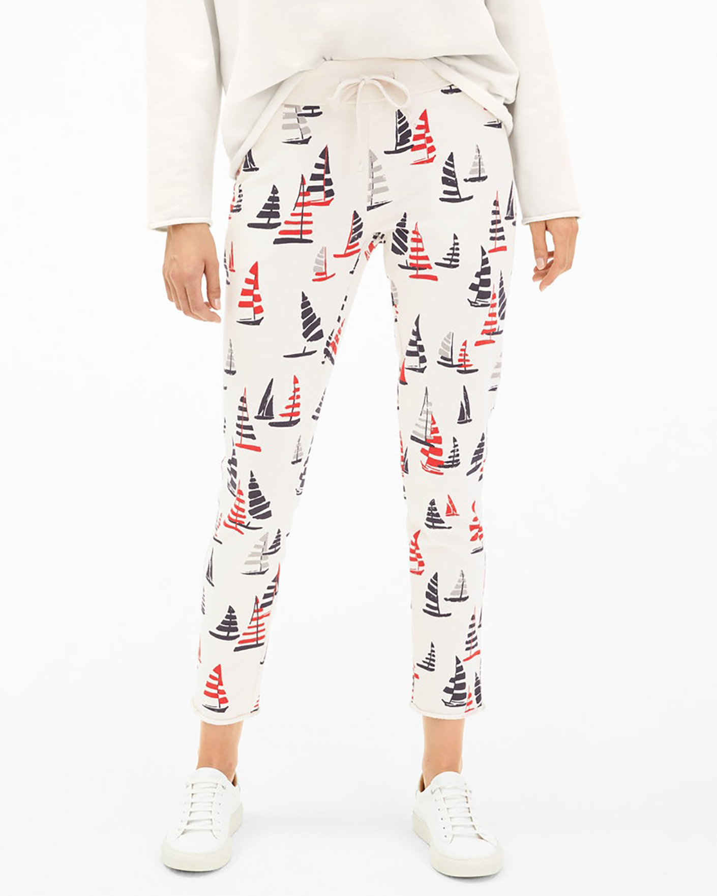 Зауженные брюки-джоггеры Juvia белого цвета с крупным принтом в виде парусников по всему изделию. Модель с завышенной талиейн а ребристой резинке со вставным шнурком. Имеются врезные карманы по бокам и накладные сзади. Джоггеры отлично впишутся в ваш гардероб.