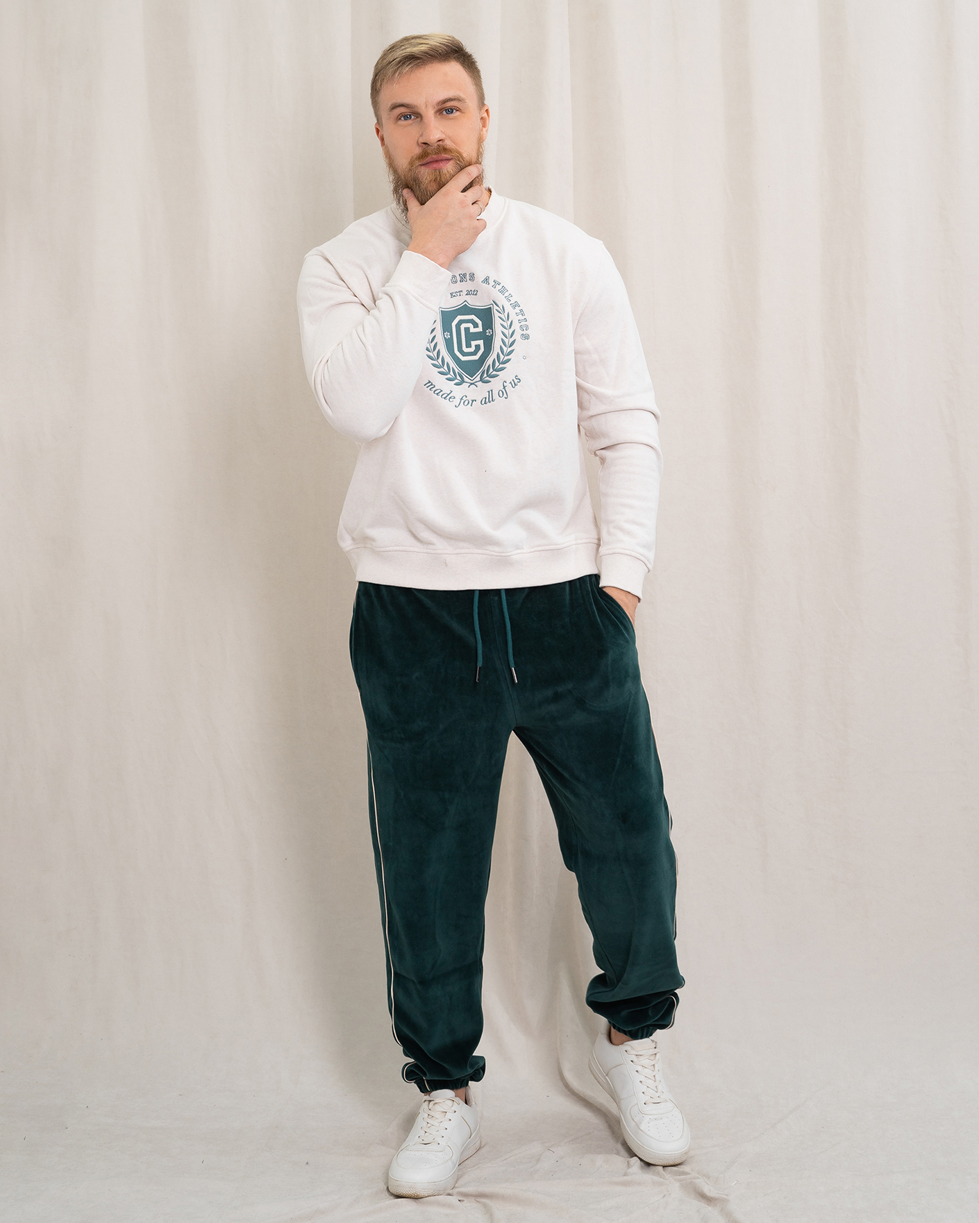 Велюровые брюки-джоггеры Colours&Sons темно-зеленого цвета. Модель с  поясом на резинке и вставном шнурке, имеются контрастные узкие лампасы и врезные карманы по бокам. Стильные джоггеры можно сочетать с футболкой, свитшотом, толстовкой и худи.
