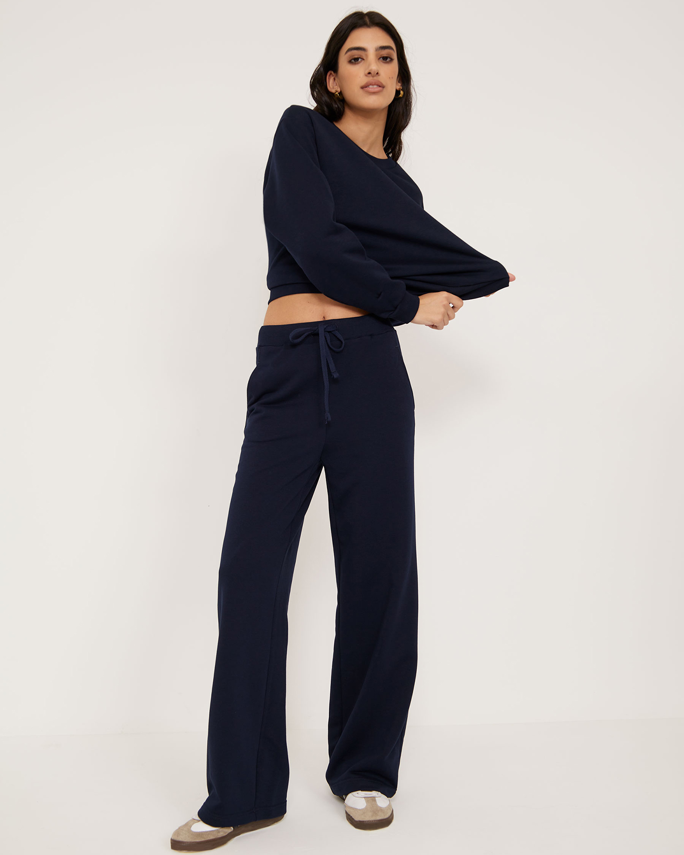 Брюки-джоггеры Emka темно-синего цвета в строчный рисунок. Хлопковая модель на эластичном поясе со вставным шнурком. Имеются врезные карманы по бокам. Комфортные джоггеры отлично впишутся в ваш гардероб.