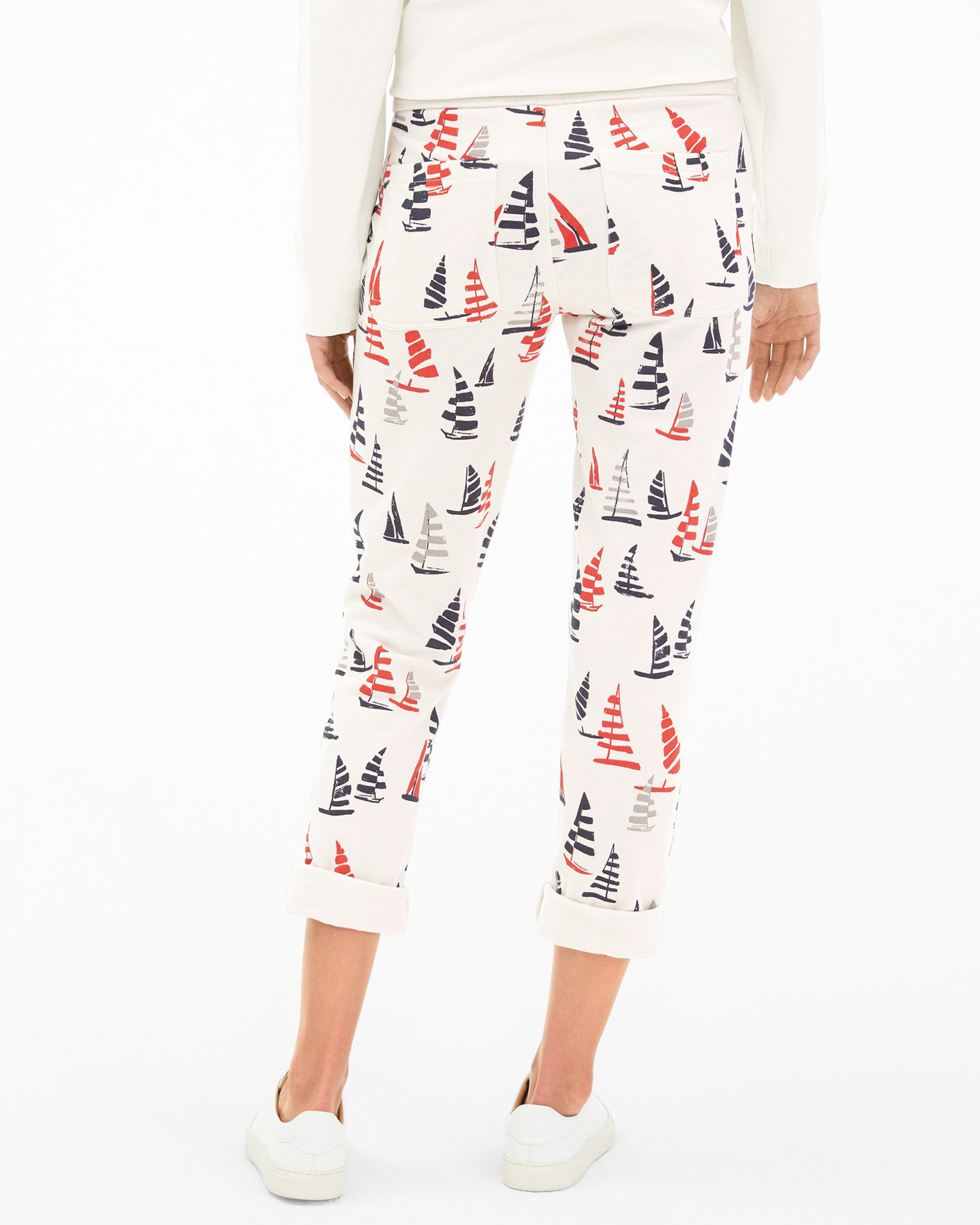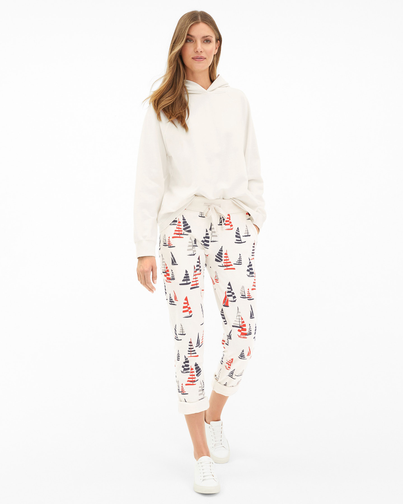 Зауженные брюки-джоггеры Juvia белого цвета с крупным принтом в виде парусников по всему изделию. Модель с завышенной талией на ребристой резинке со вставным шнурком,а также манжеты с отворотами. Имеются врезные карманы по бокам и накладные сзади. Джоггеры отлично впишутся в ваш гардероб.
