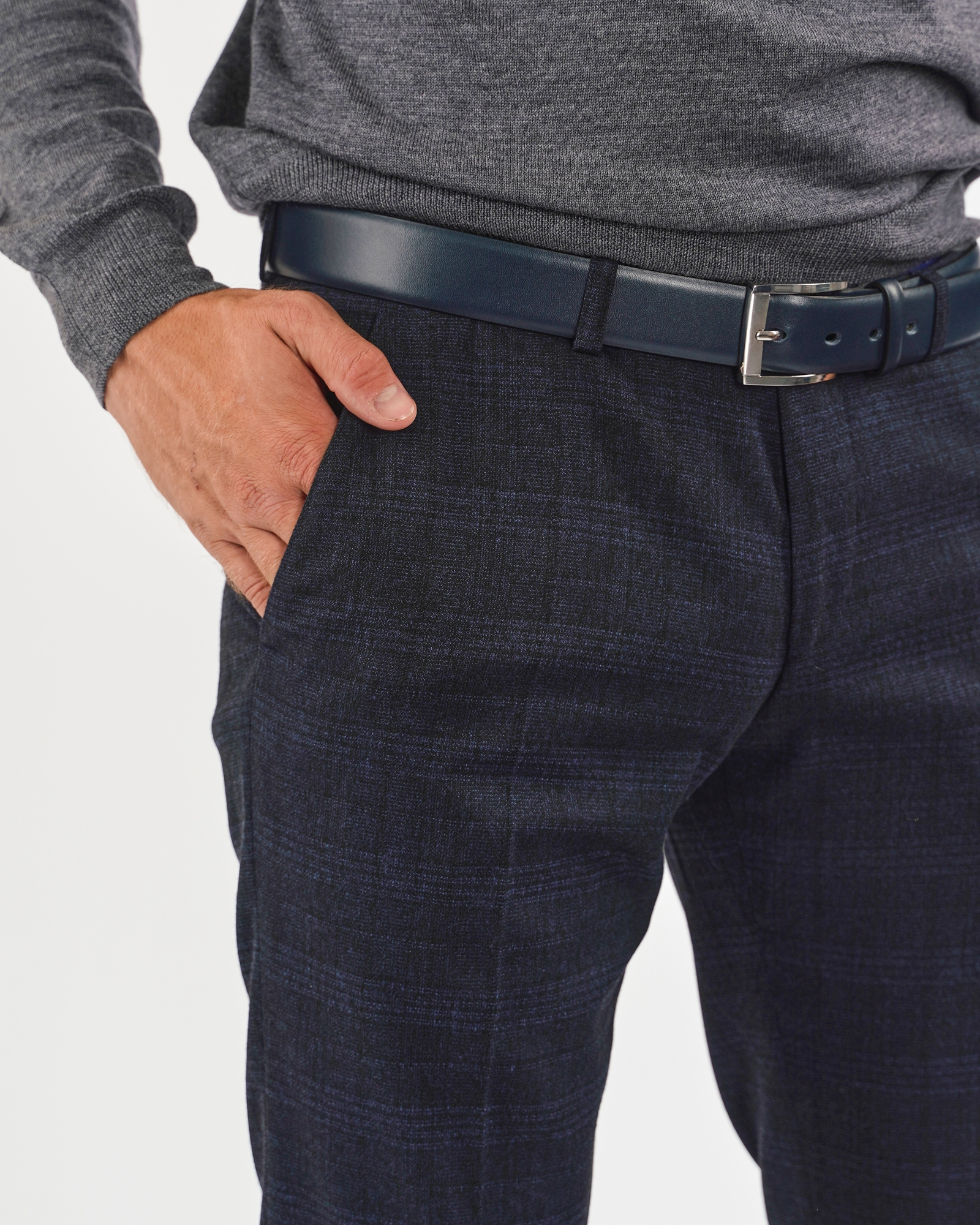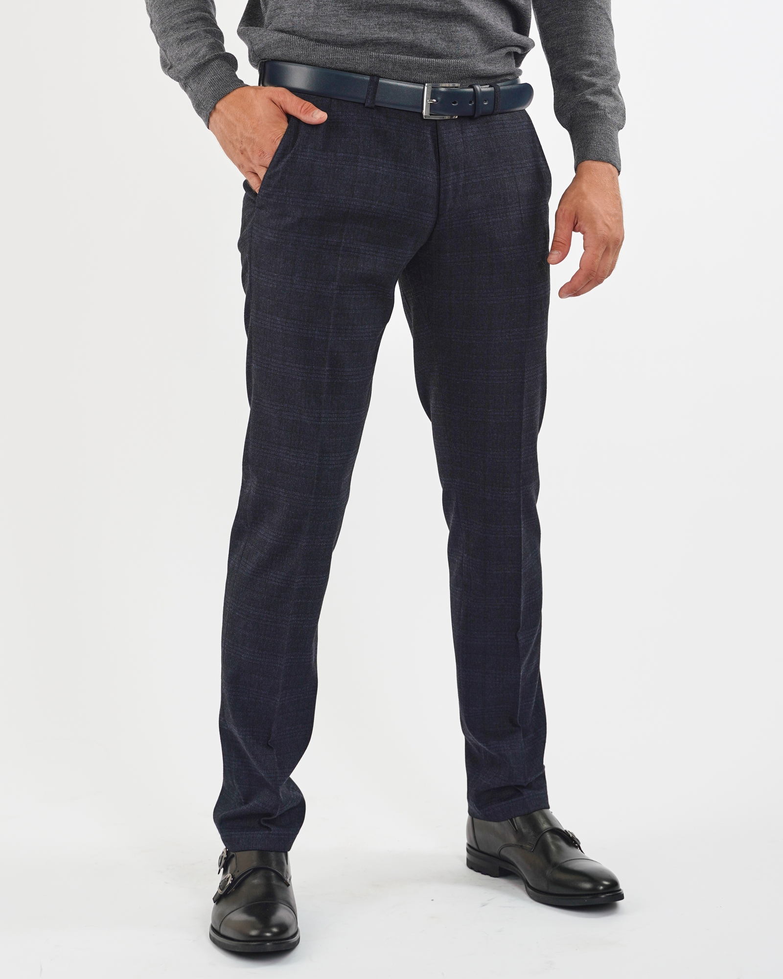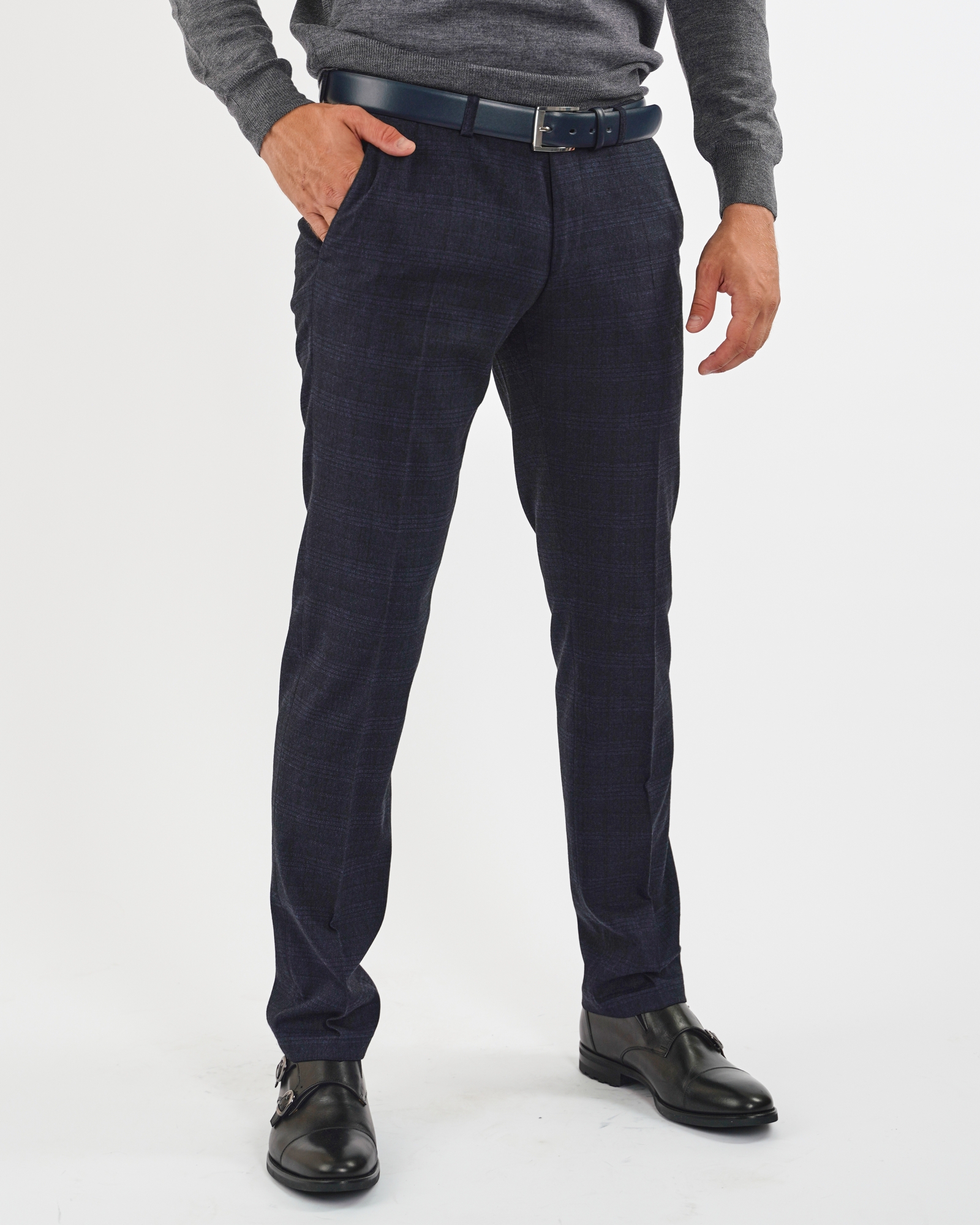 Фиолетово-синие брюки Digel в клетку. Застежка на пуговицу и молнию. Брюки можно сочетать с рубашкой, джемпером, свитером и пиджаком.