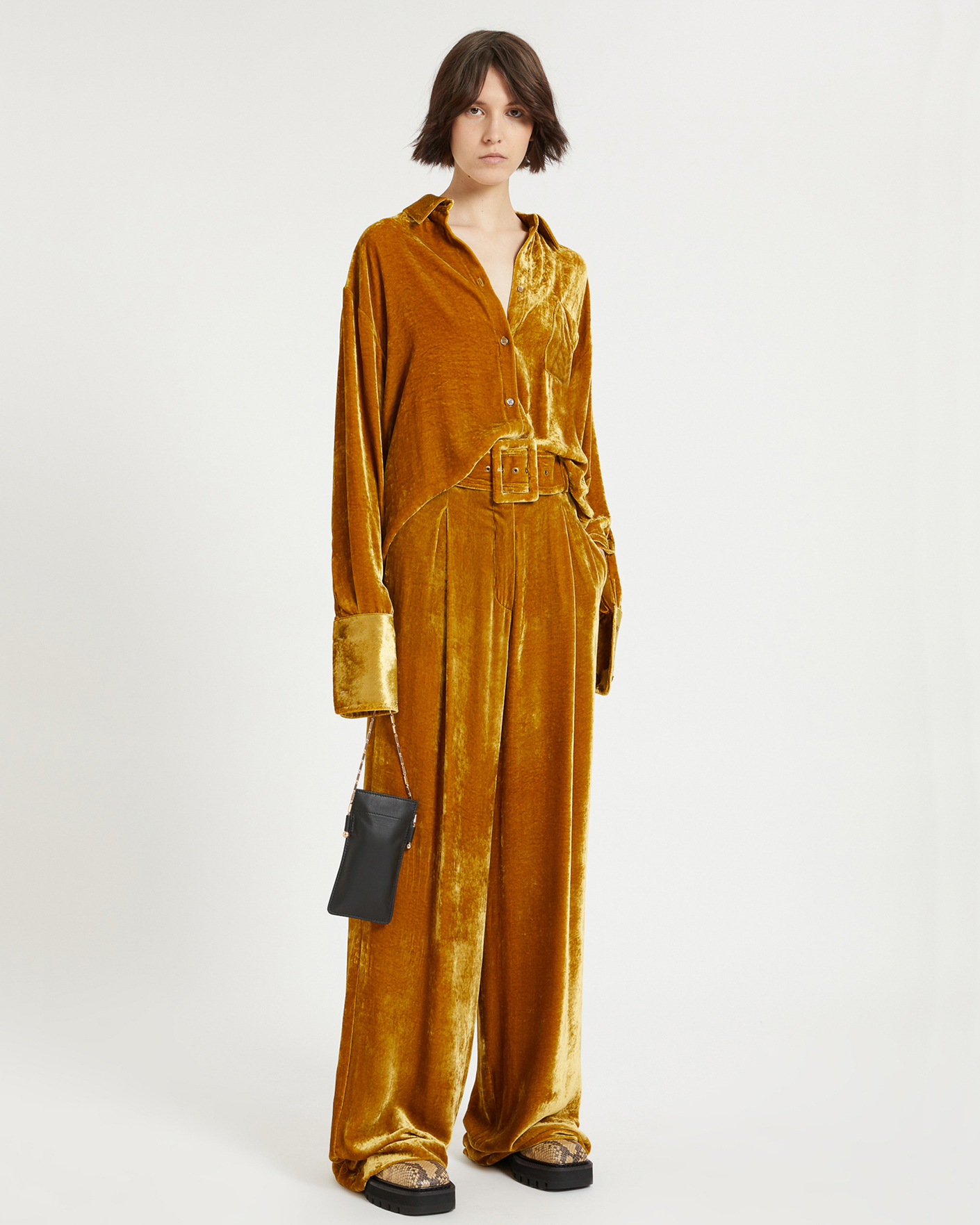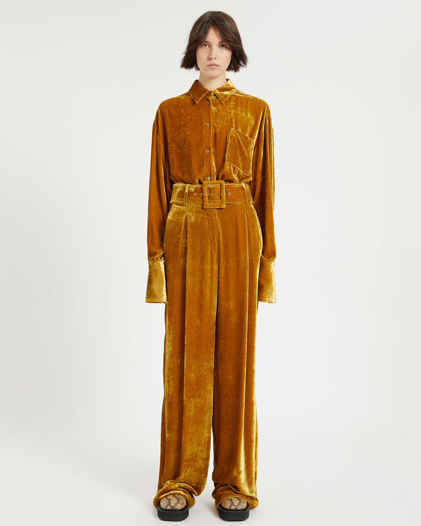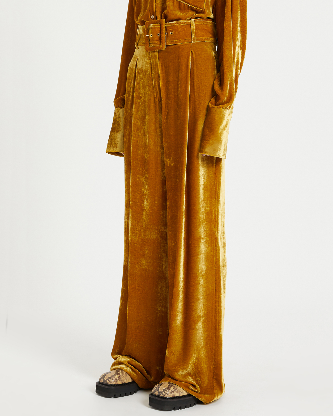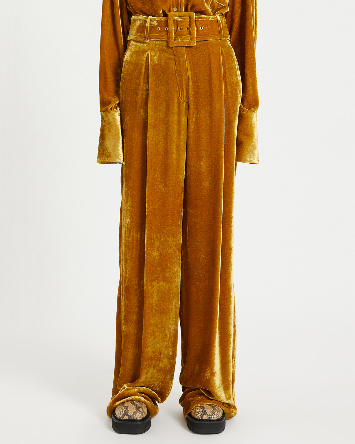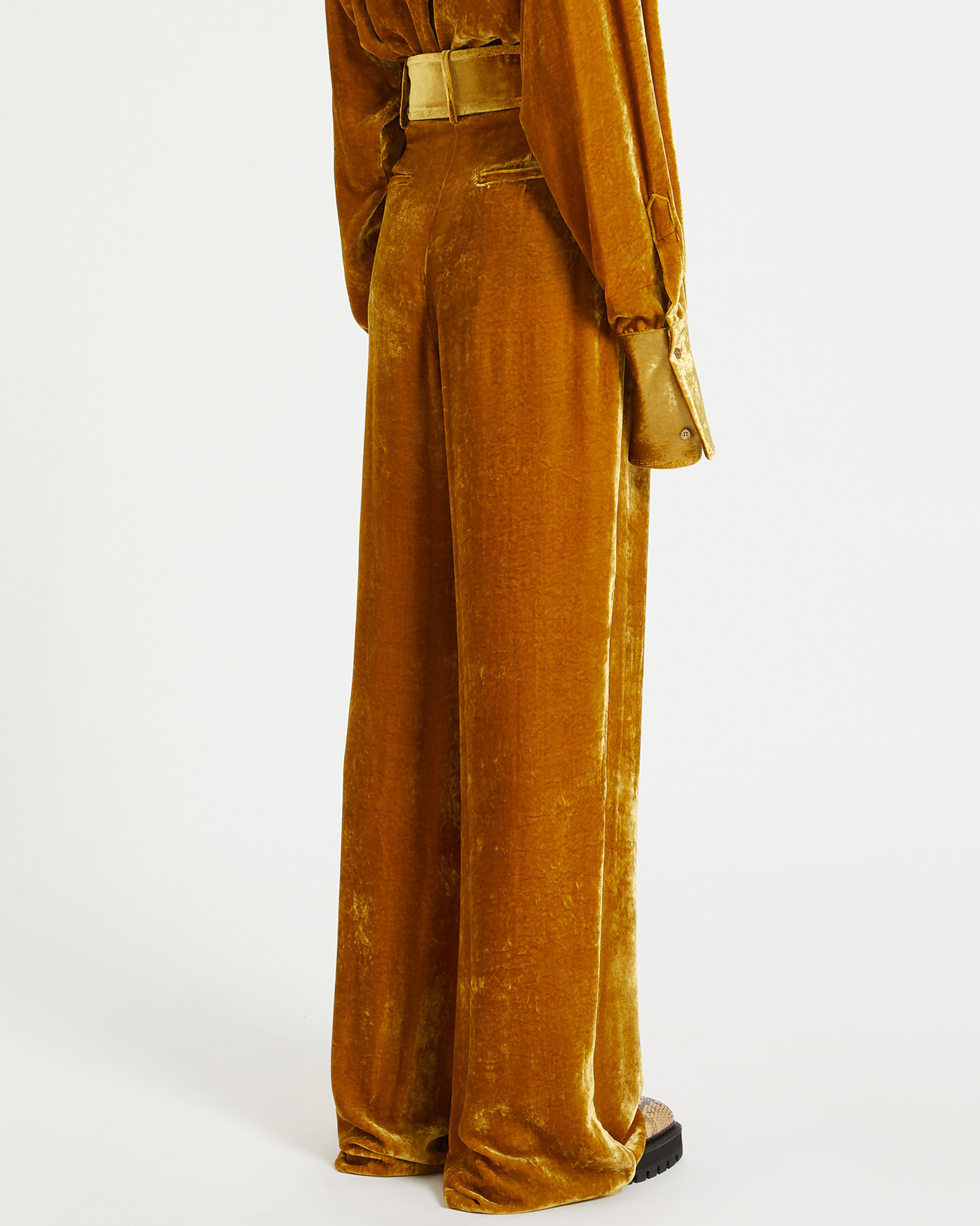 Яркие брюки-палаццо Sportmax горчичного цвета с аккуратными складками. Модель выполнена из гладкой вискоза с шелковым бархатом и матовым эффектом. Высокая талия со вставным поясом обеспечивают идеальную посадку. Стильный брюки-палаццо не оставят вас незамеченными.