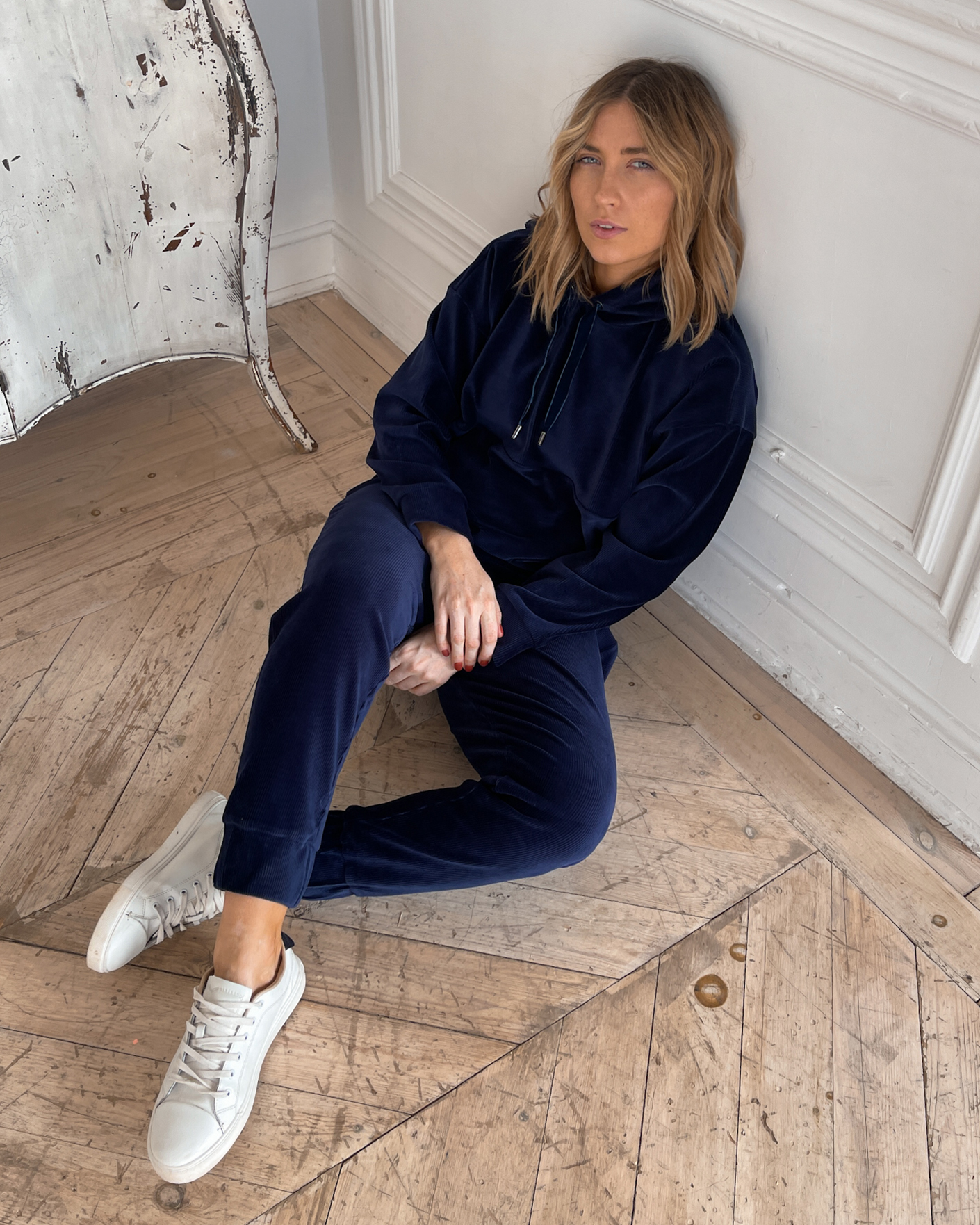 Брюки-джоггеры-бананы UNQ темно-синего цвета в вельветовую текстуру. Модель с завышенной талией на резинке обеспечивает идеальную посадку. ИМеются врезные карманы по бокам. Джоггеры-бананы можно сочетать с футболкой, свитшотом, худи и толстовкой.