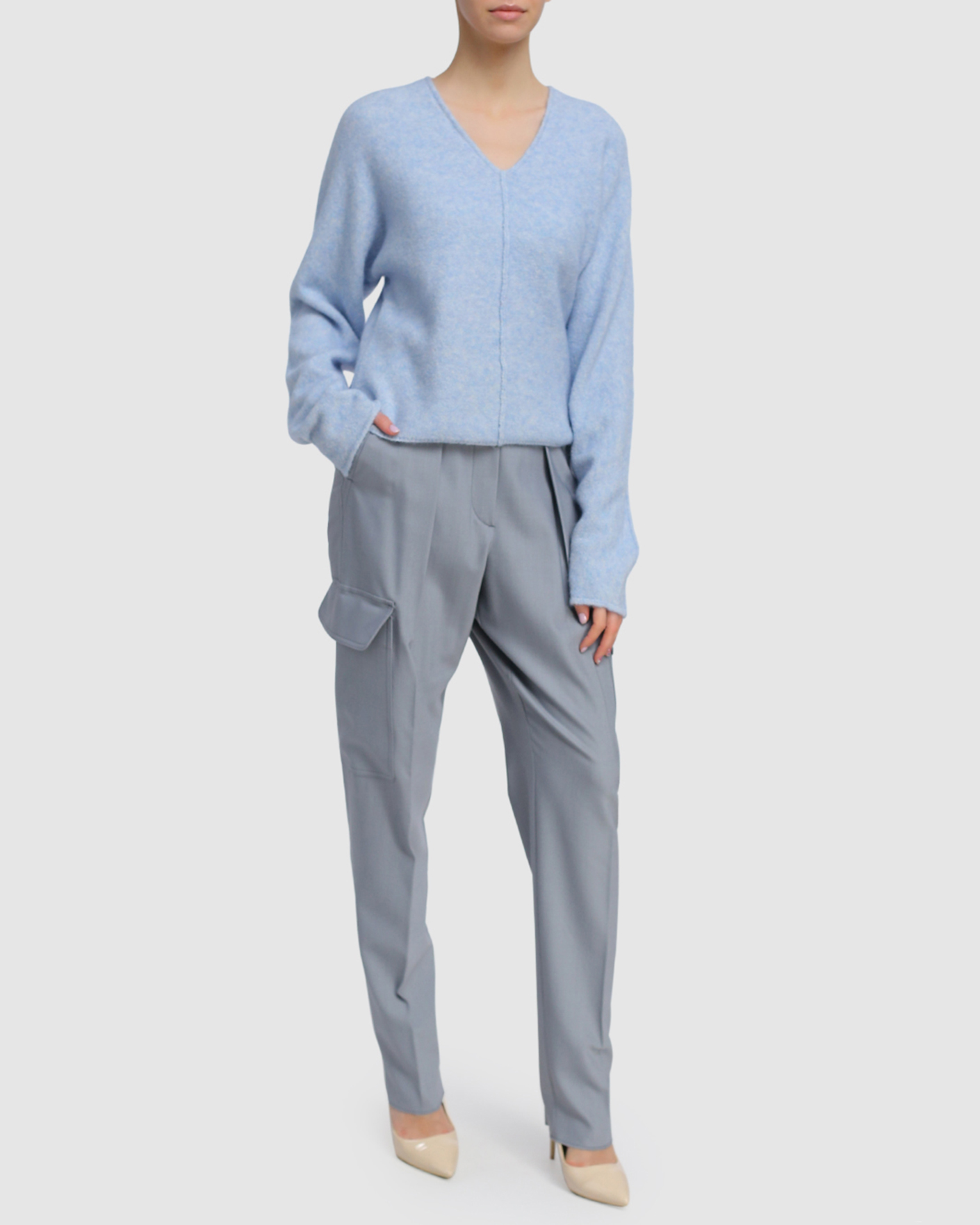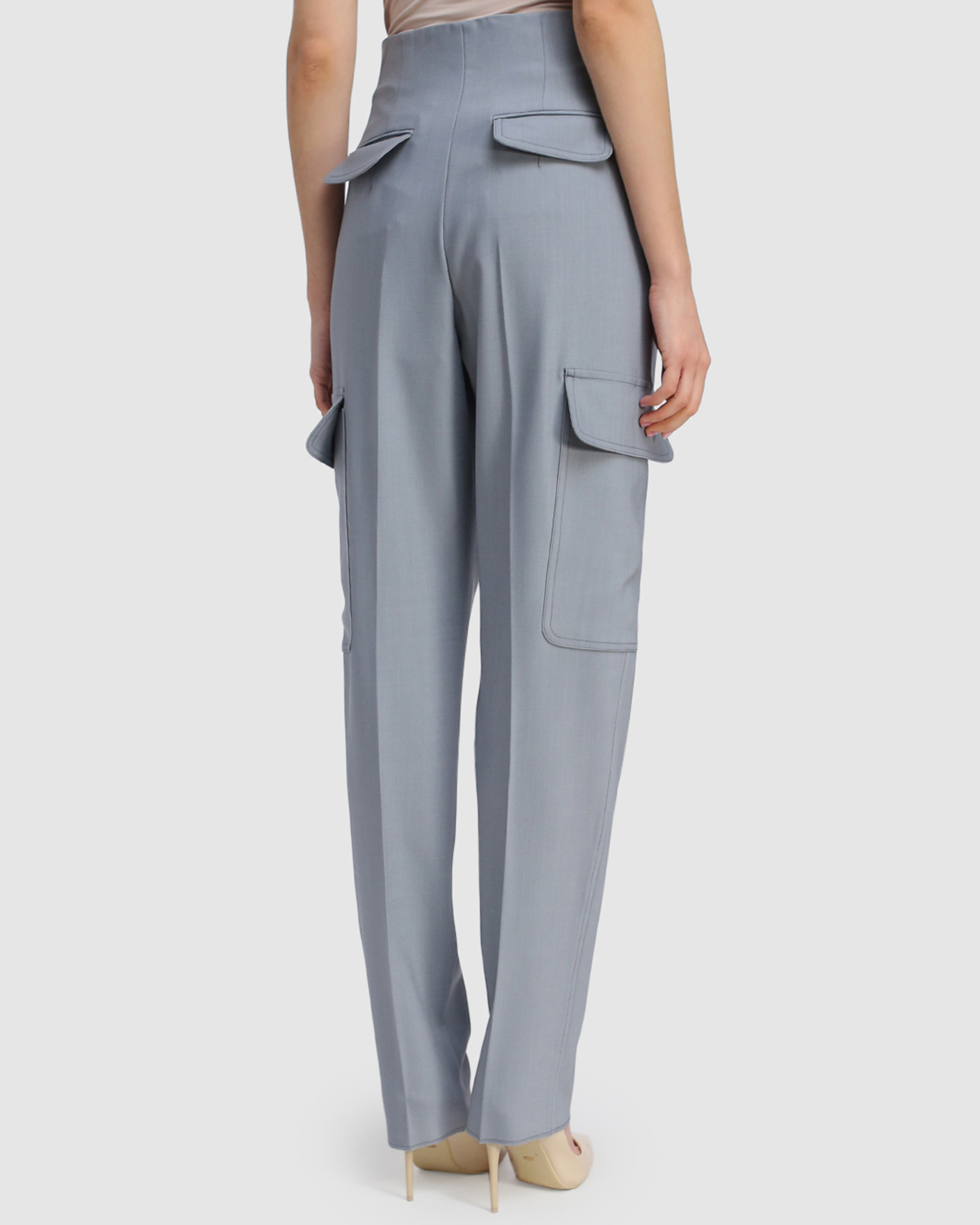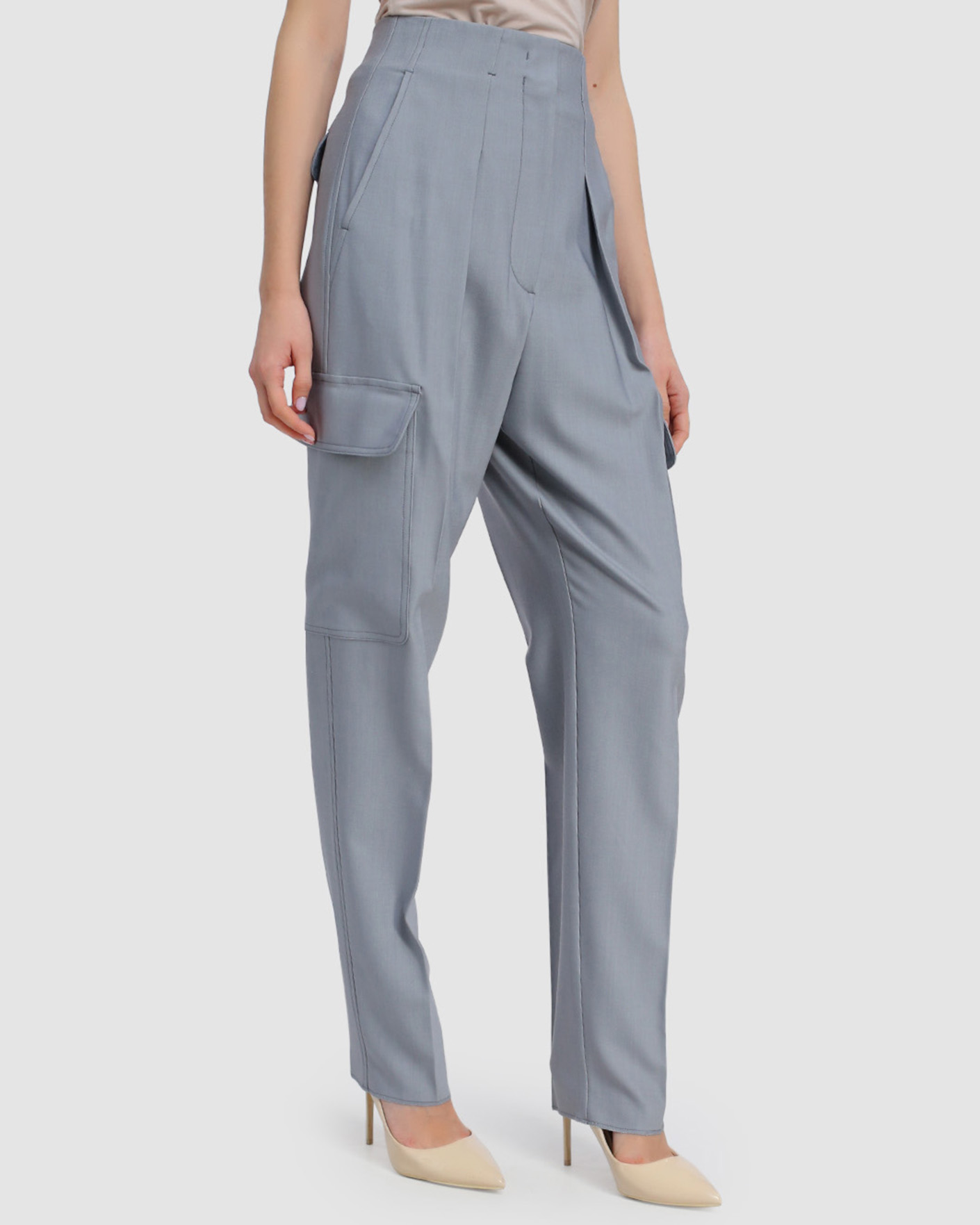 Зауженные брюки-карго Sportmax светло-серого цвета со складками. Завышенная талия обеспечивает идеальную посадку. Модель со стрелками спереди и сзади, имеются косые карманы по бокам, два накладных кармана с клапанами на бедрах, а также врезные карманы с клапанами сзади. Стильные брюки-карго отлично сочетаются с топом, футболкой, джемпером, блузой, рубашкой, жакетом.
