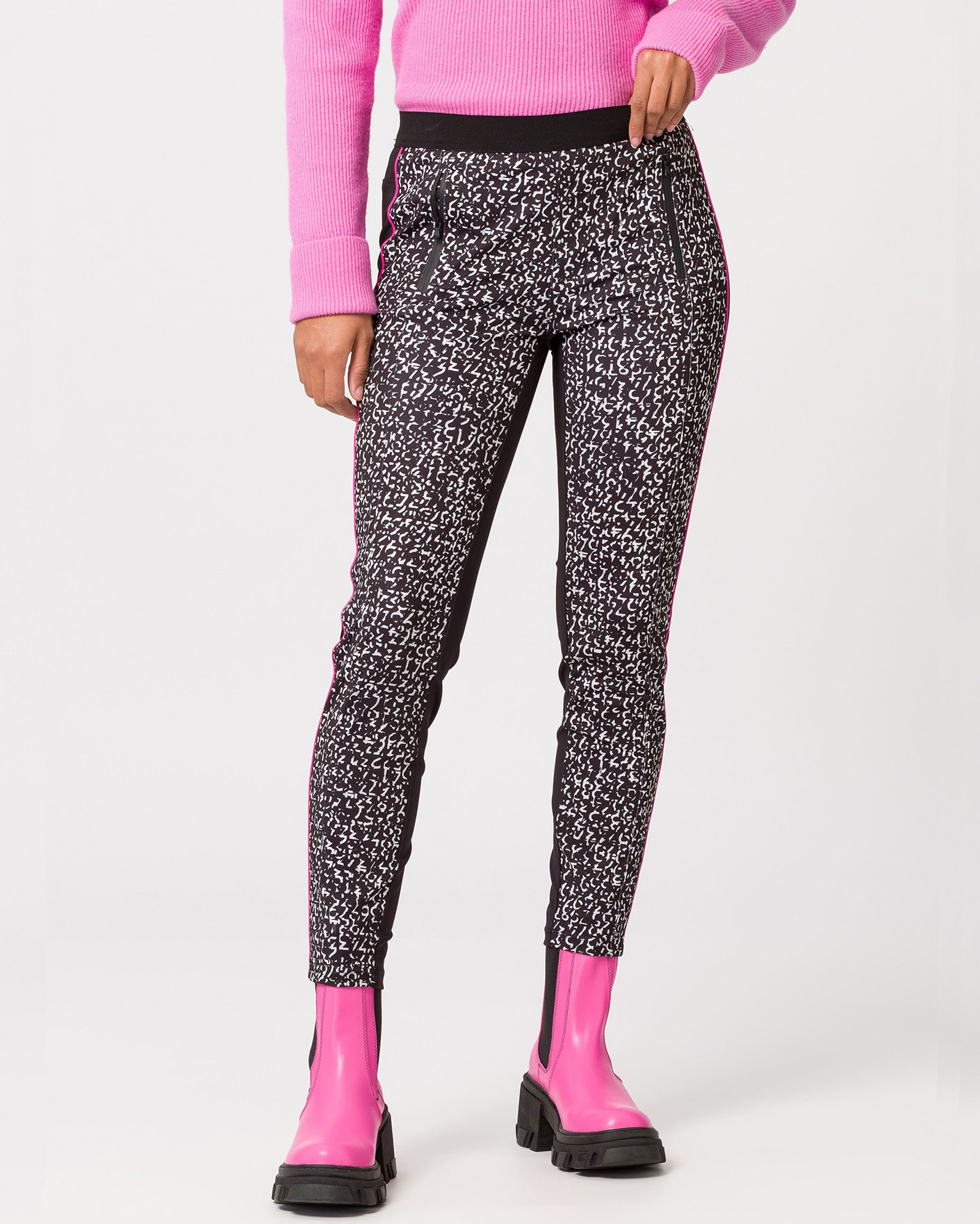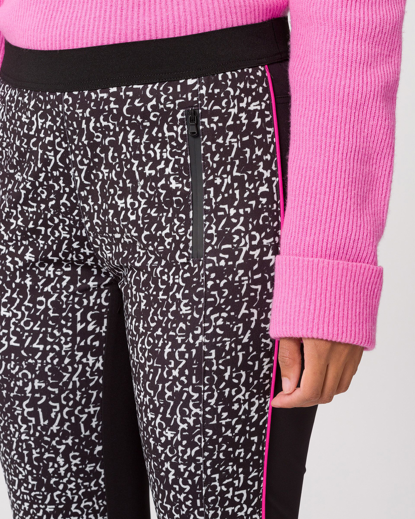 Леггинсы Tuzzi бело-черного цвета в абстрактный рисунок спереди. Модель на эластичном поясе, имеются яркая полоска лампас, боковые карманы на молнии. Леггинсы отлично впишутся в ваш гардероб.