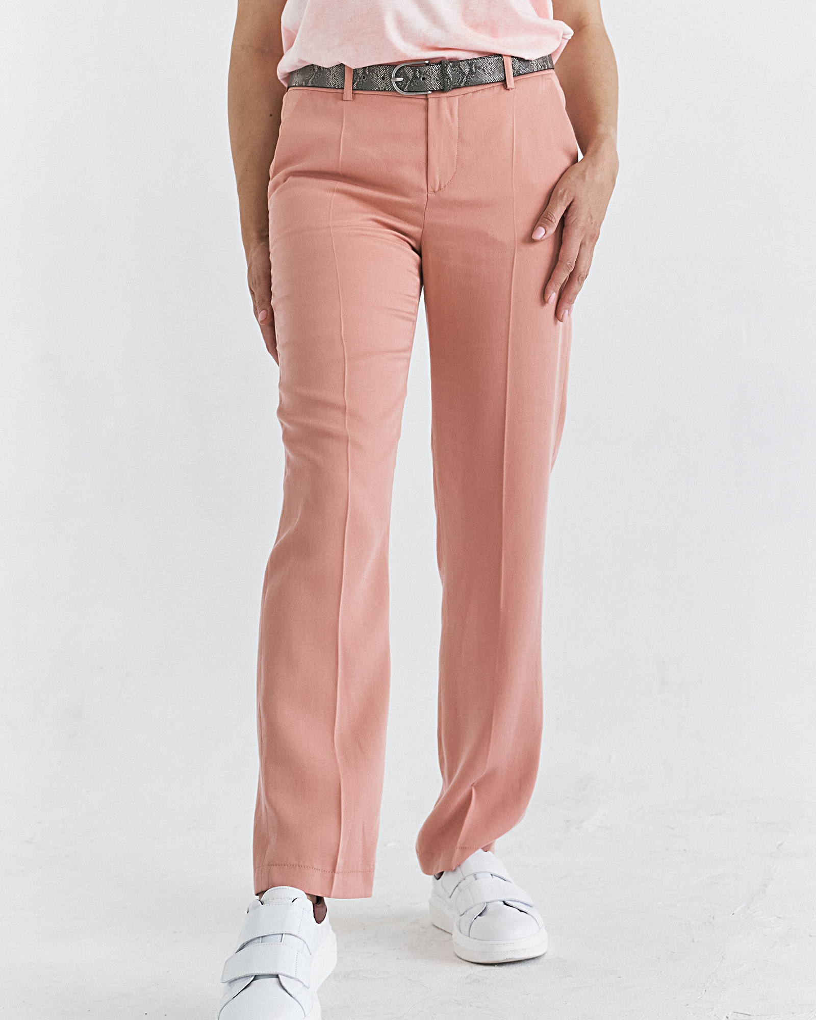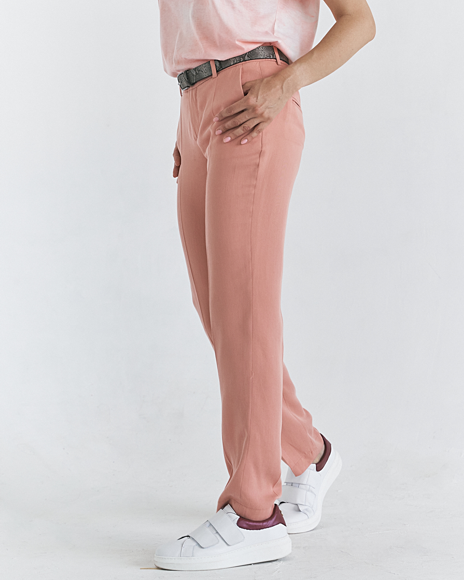 Серо-розовые зауженные брюки со стрелками. Застежка на пуговицу и молнию. Брюки можно сочетать с топом, футболкой, джемпером и рубашкой.