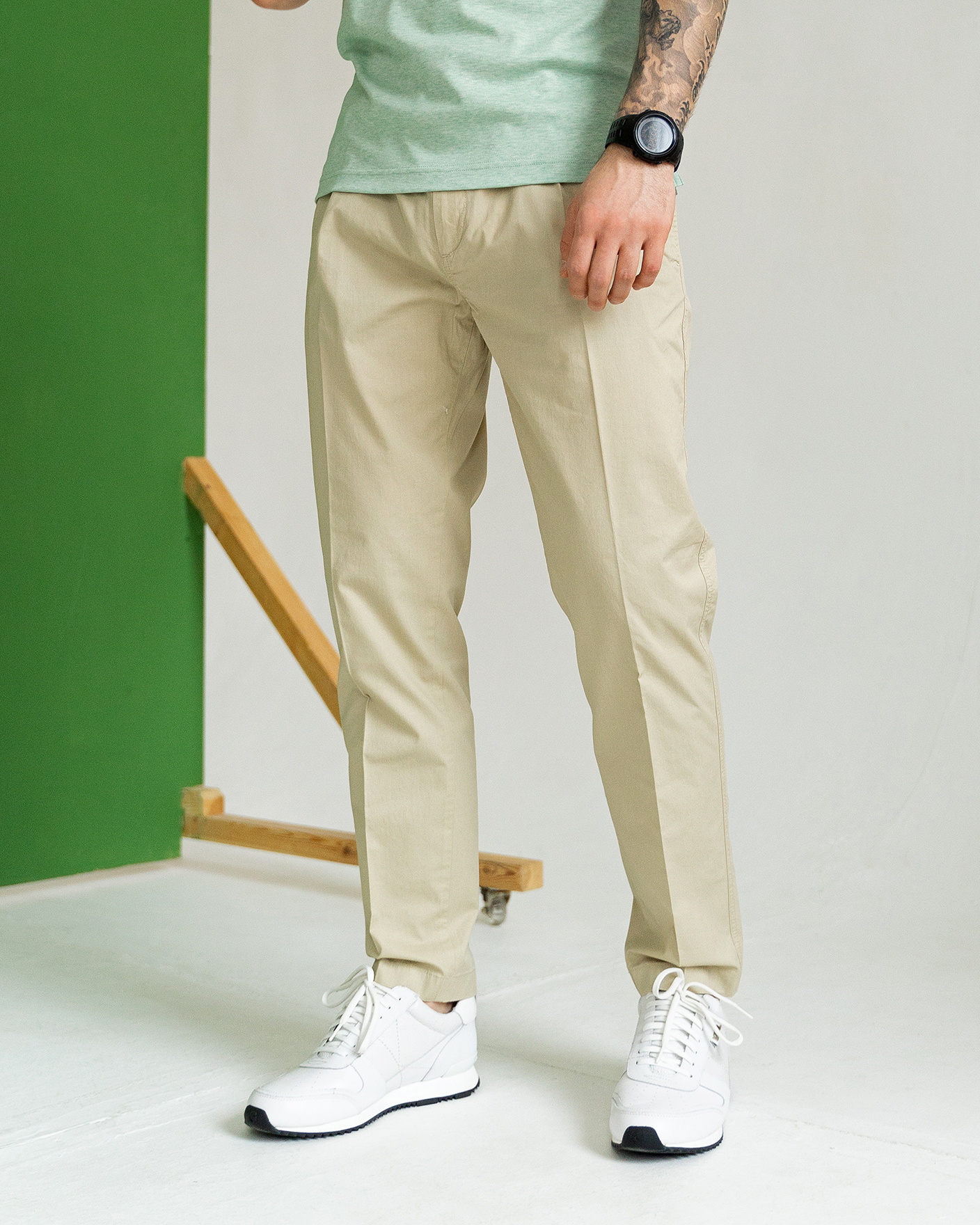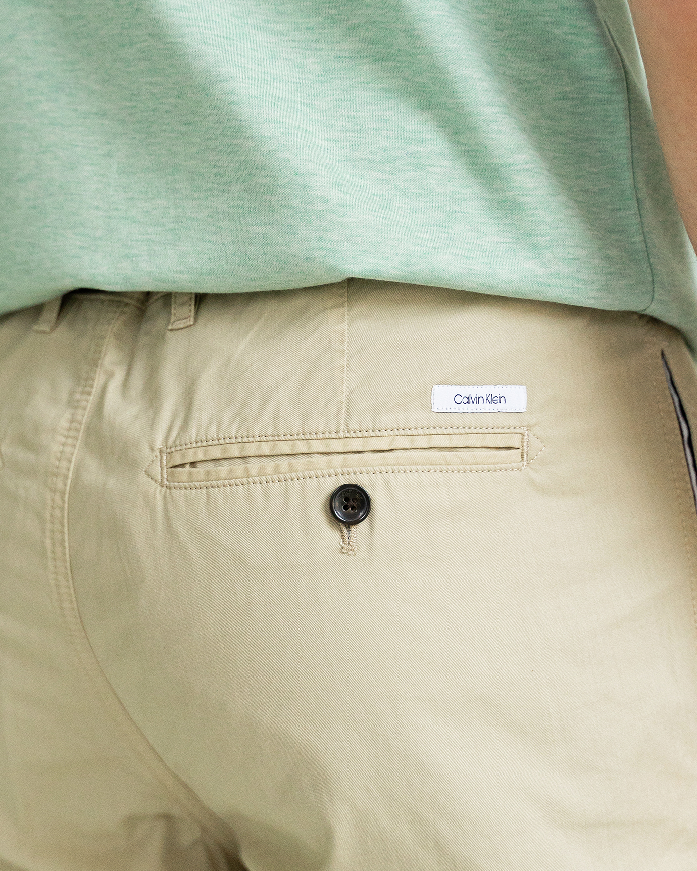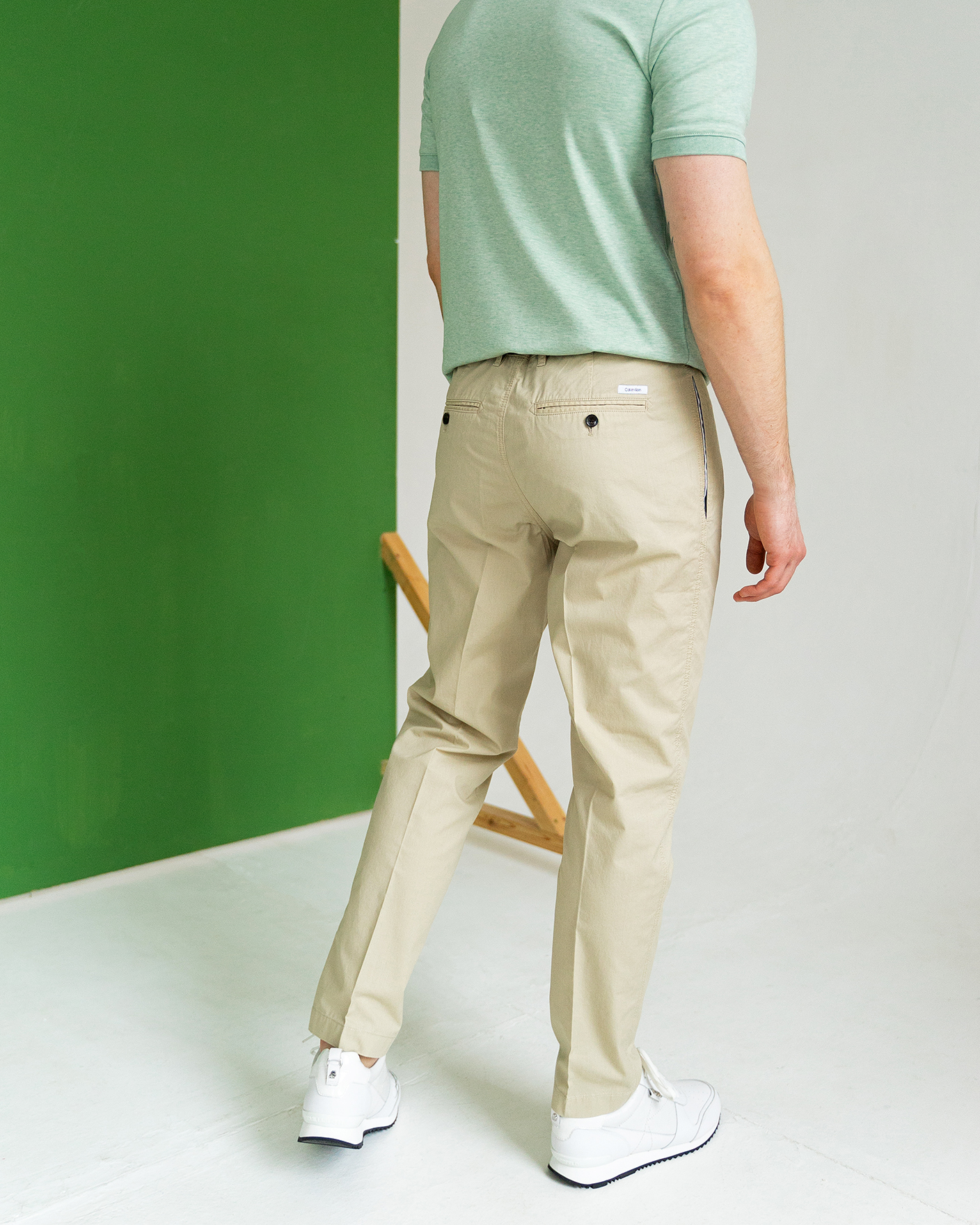 Брюки-слаксы Calvin Klein светло-бежевого цвета выполнены из 100% хлопка. Имеются косые боковые карманы и два врезных кармана на контрастной пуговице сзади. Стильные брюки отлично сочетаются с футболкой, поло, джемпером, водолазкой, кардиганом и пиджаком.