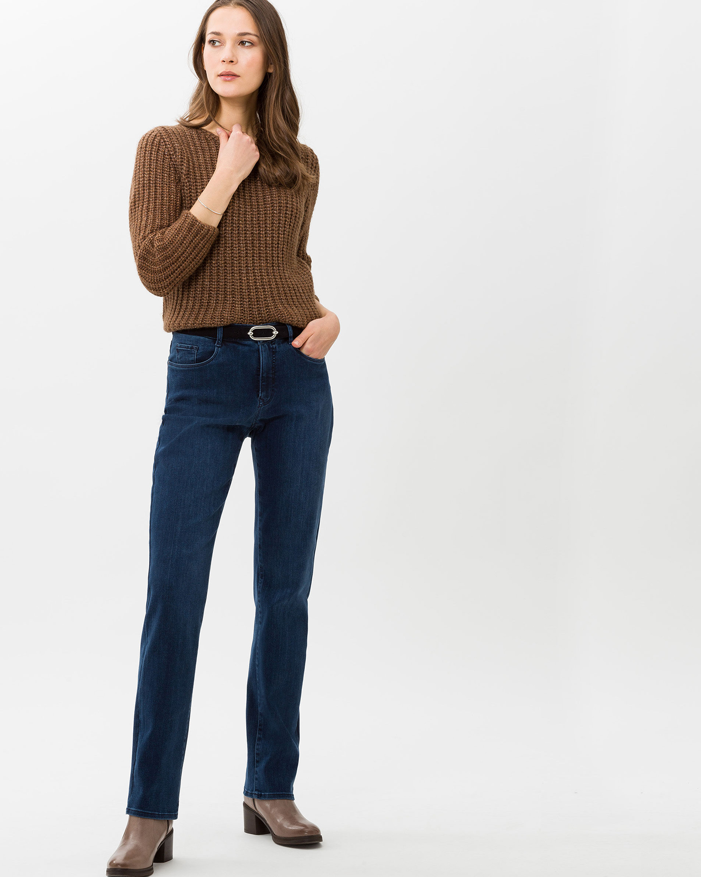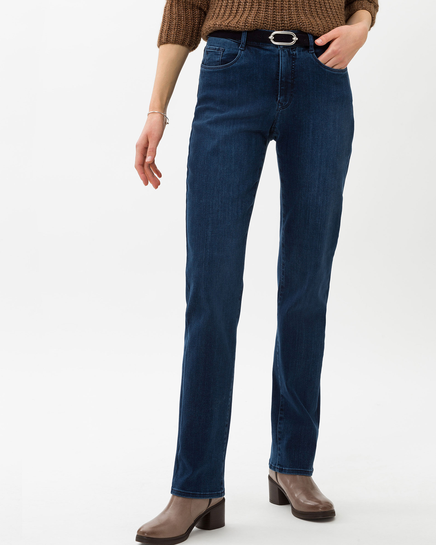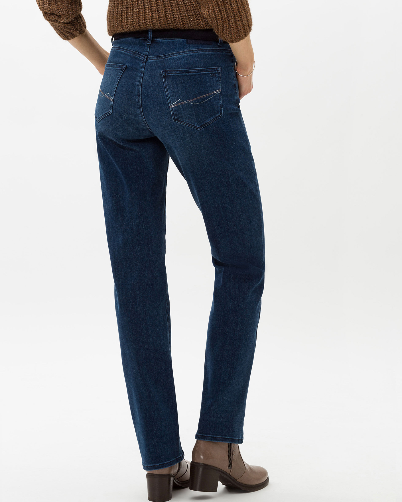 Джинсы Brax темно-синего цвета в строчный рисунок. Модель прямого кроя с завышенной талией, на стандартной застежке. Имеются карманы по бокам и накладные сзади с декром в виде страз. Джинсы - базовая вещь повседневного гардероба.