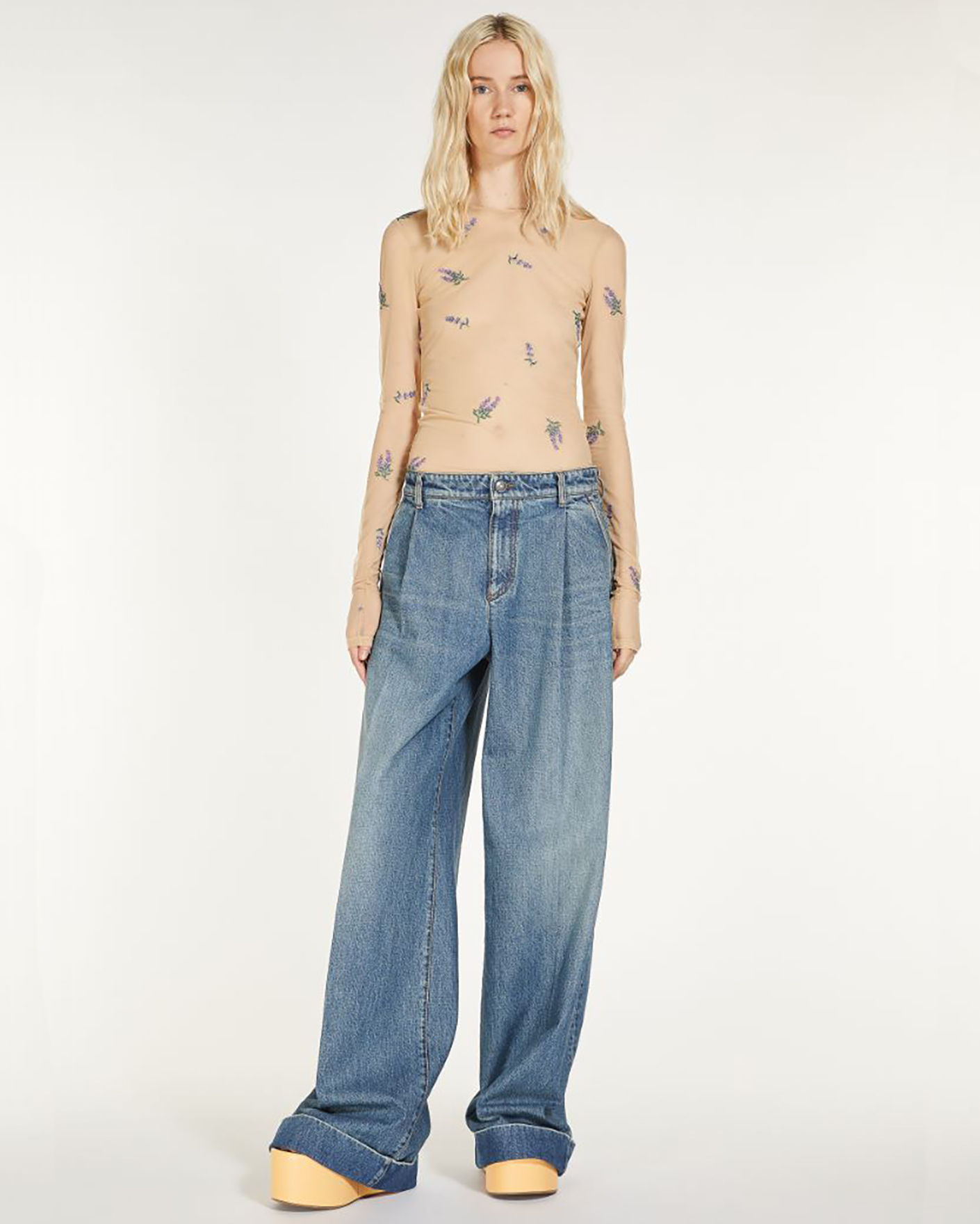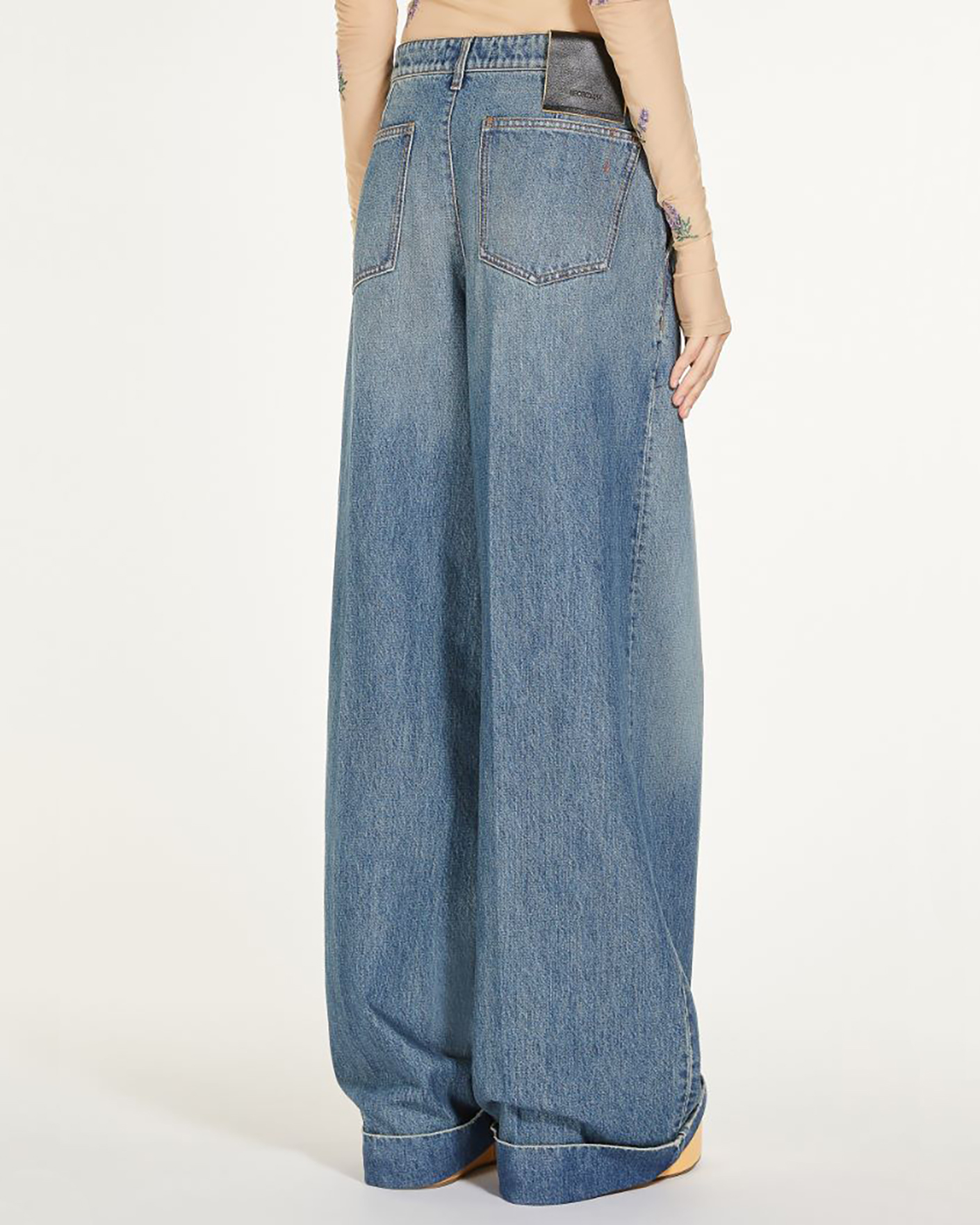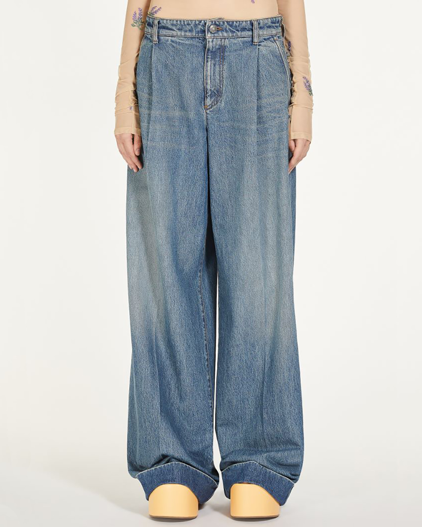 Широкие джинсы-кюлоты Sportmax голубого цвета с отбеленным эффектом. Модель из 100% хлопка, средняя посадка на защипах и на стандартной застежке. Имеются карманы по бокам и накладные сзади. Джинсы-кюлоты - актуальная вещь сезона.