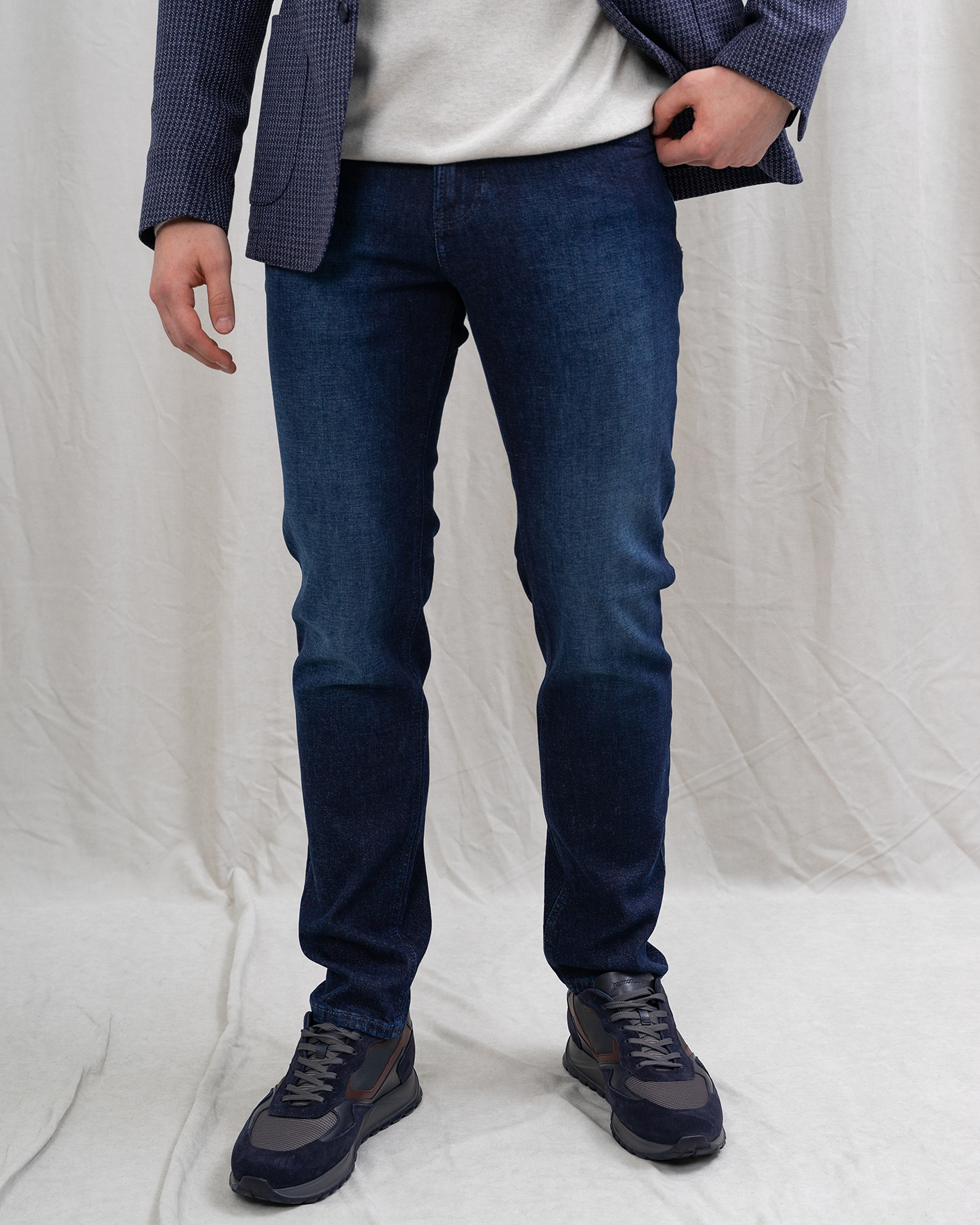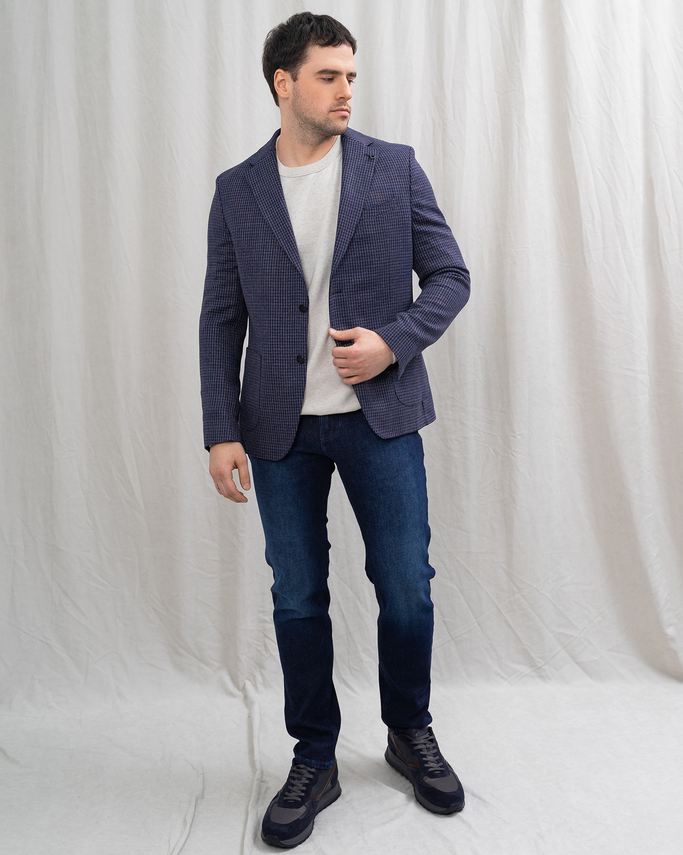 Джинсы Digel фиолетово-синего цвета в строчный рисунок. Модель на стандартной застежке, имеются карманы по бокам и накладные сзади. Джинсы - база вашего гардероба.