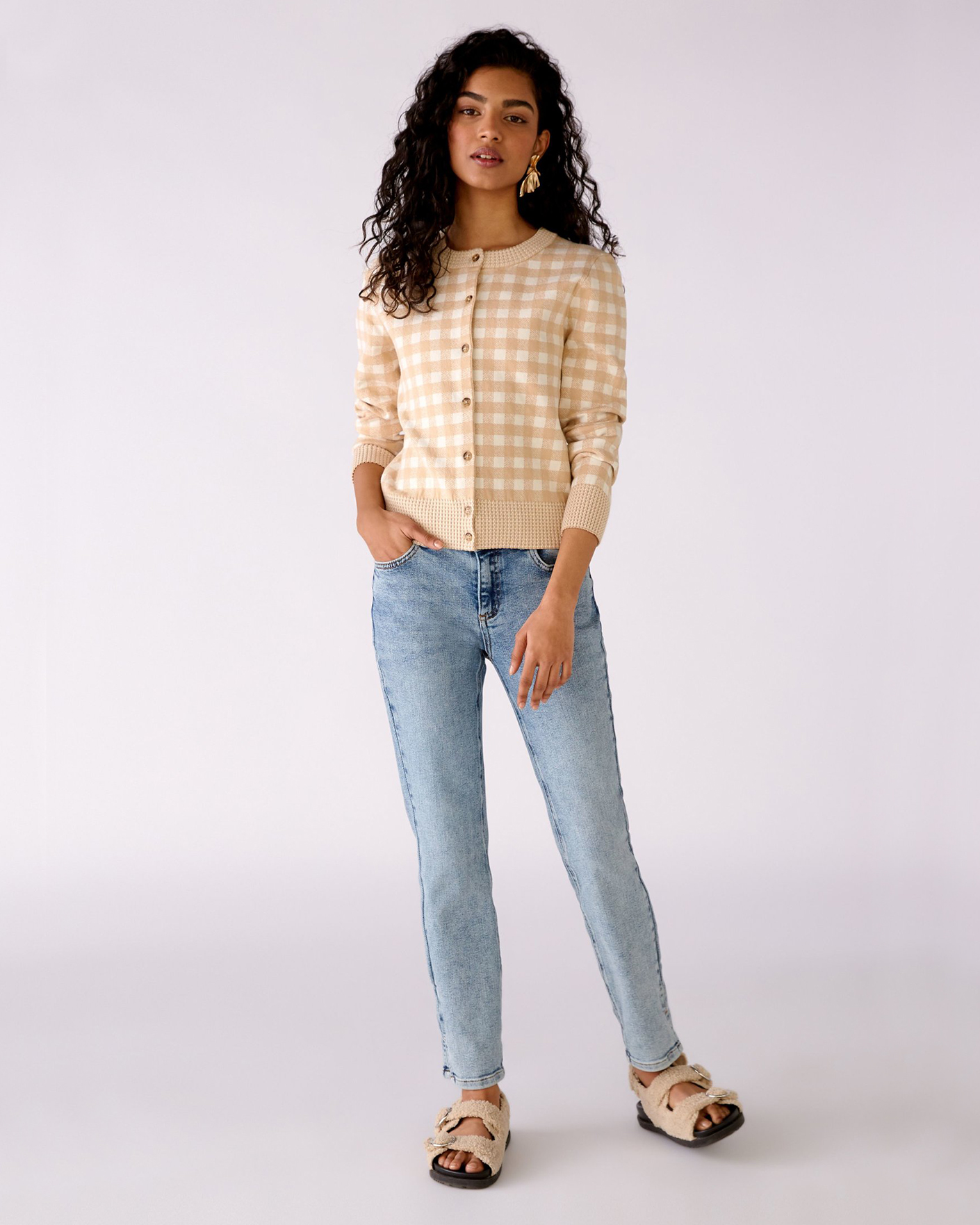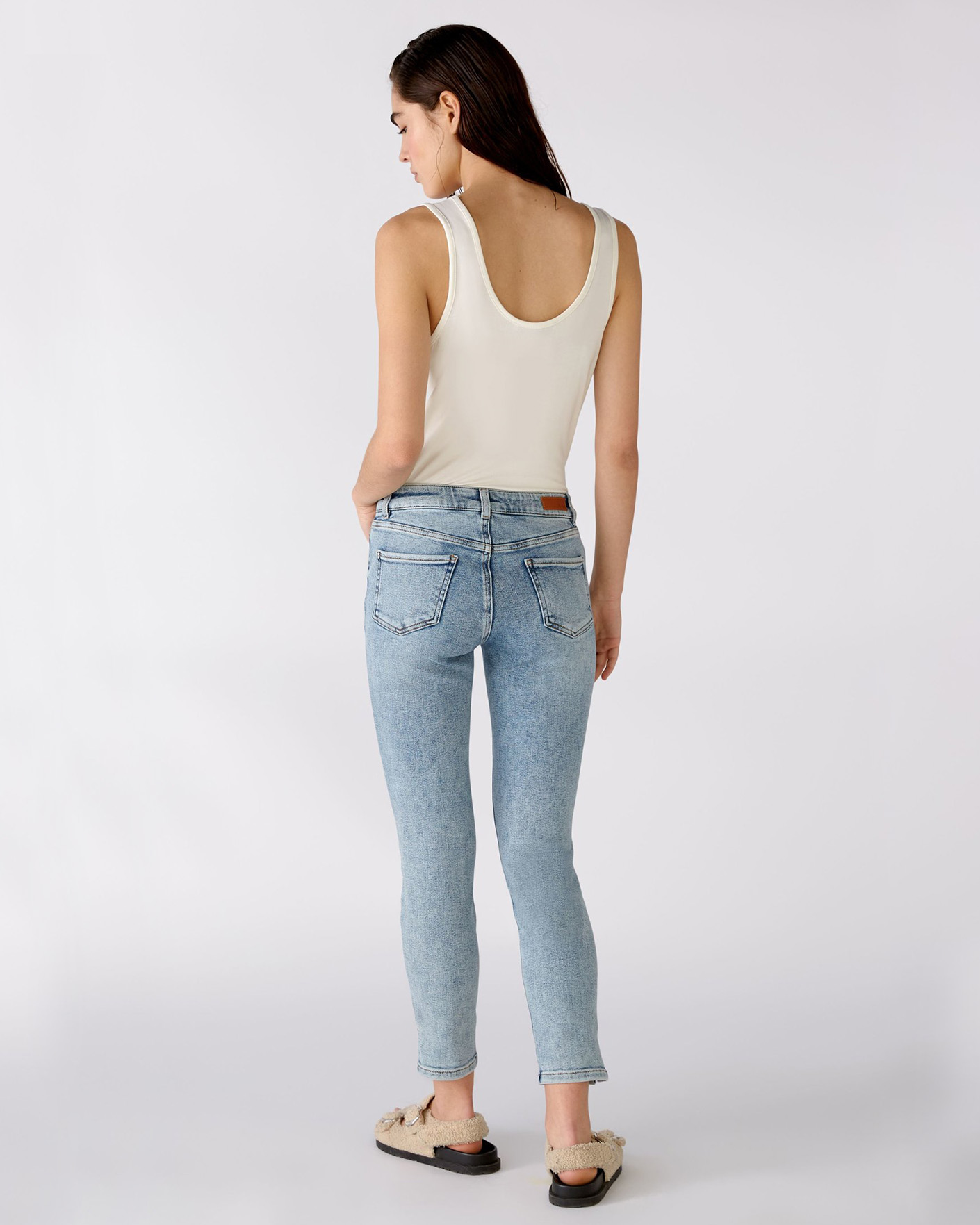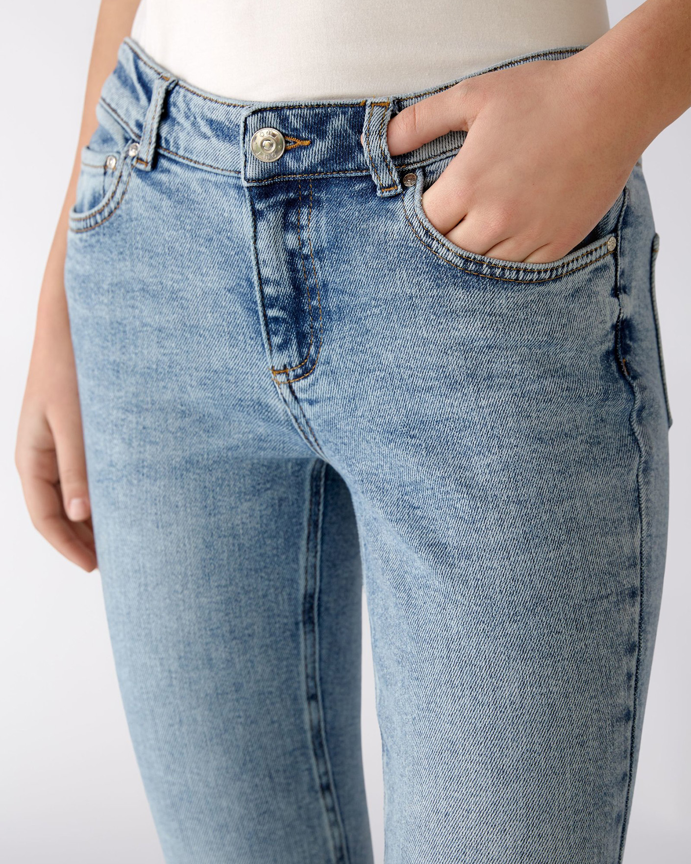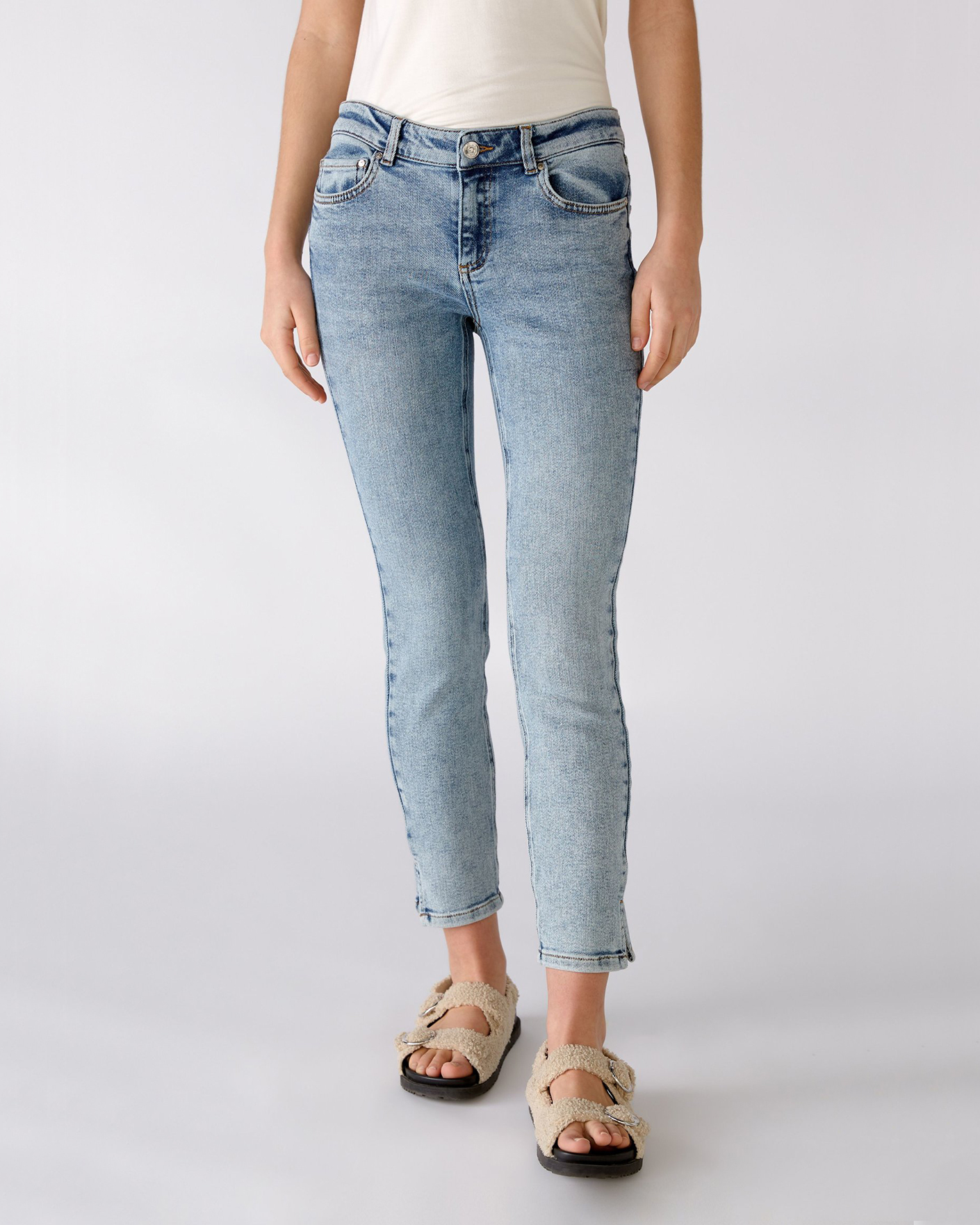 Зауженные джинсы OUI голубого цвета с эффектом потертости. Хлопковая модель на стандартной застежке, боковыми и задними карманами. Манжеты с небольшими разрезами по бокам. Джинсы - базовая и незаменимая вещь вашего гардероба.