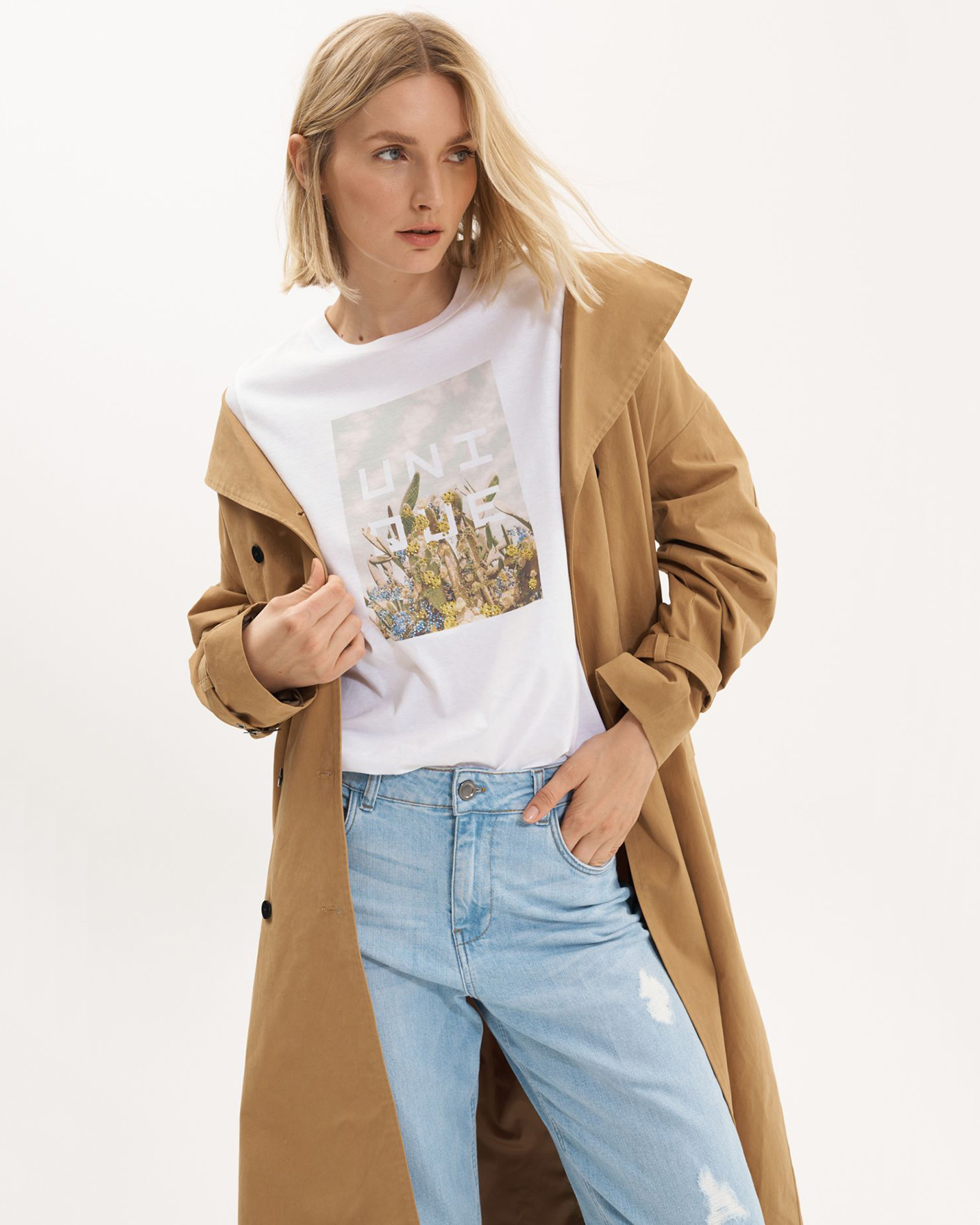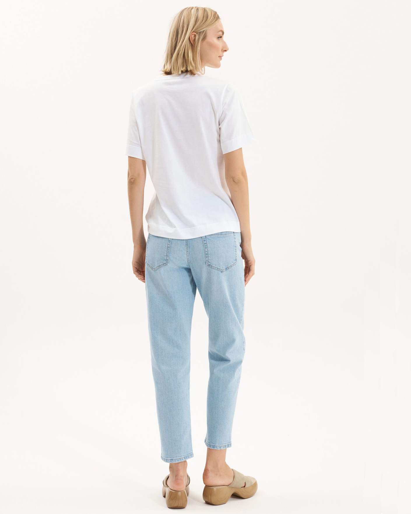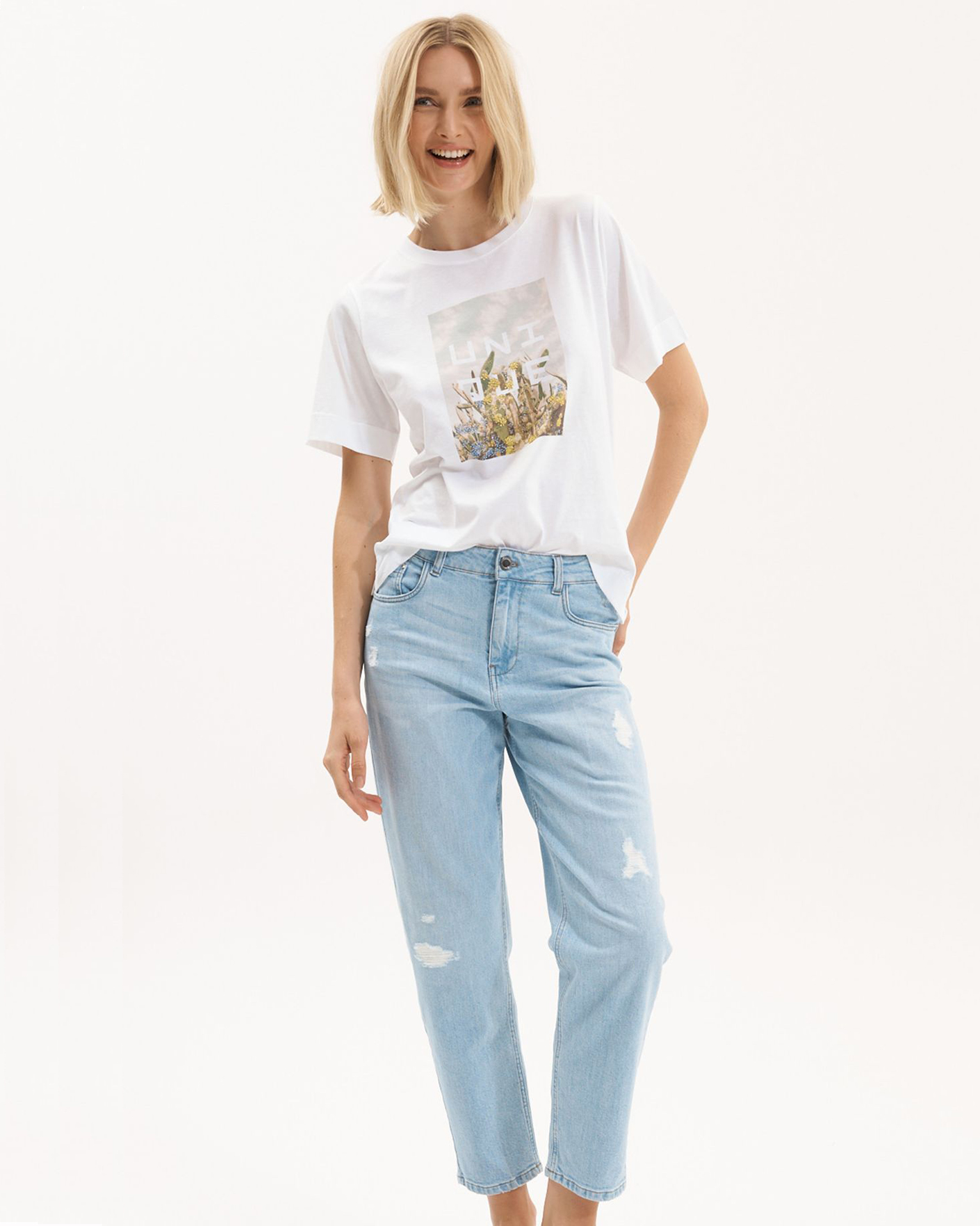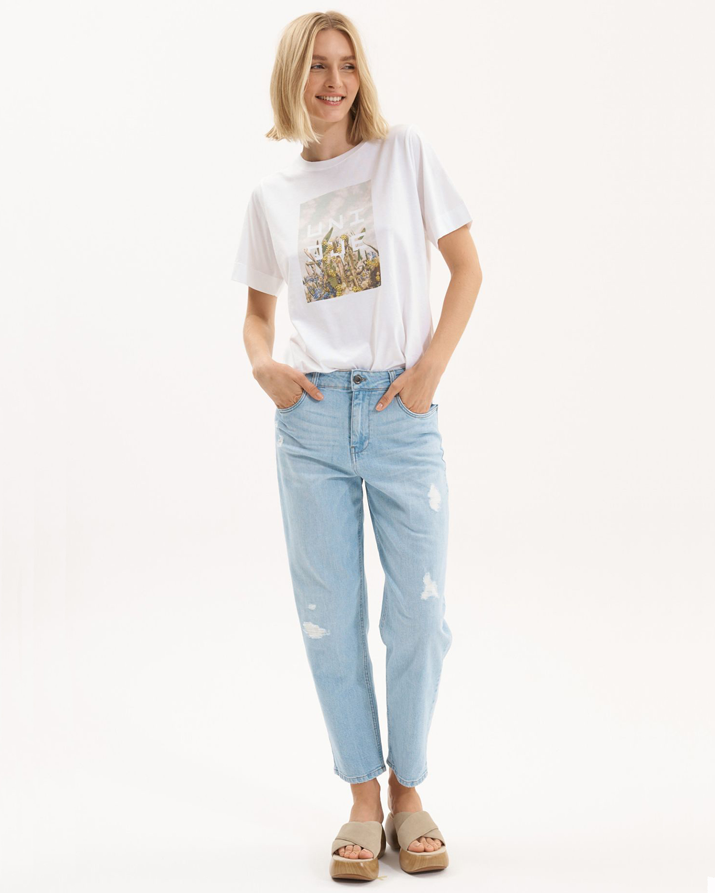 Идеальные джинсы UNQ голубого цвета с потертостями. Хлопковая модель с завышенной талией на стандартной застежке, имеются карманы по бокам и накладные сзади. Джинсы - база вашего гардероба.