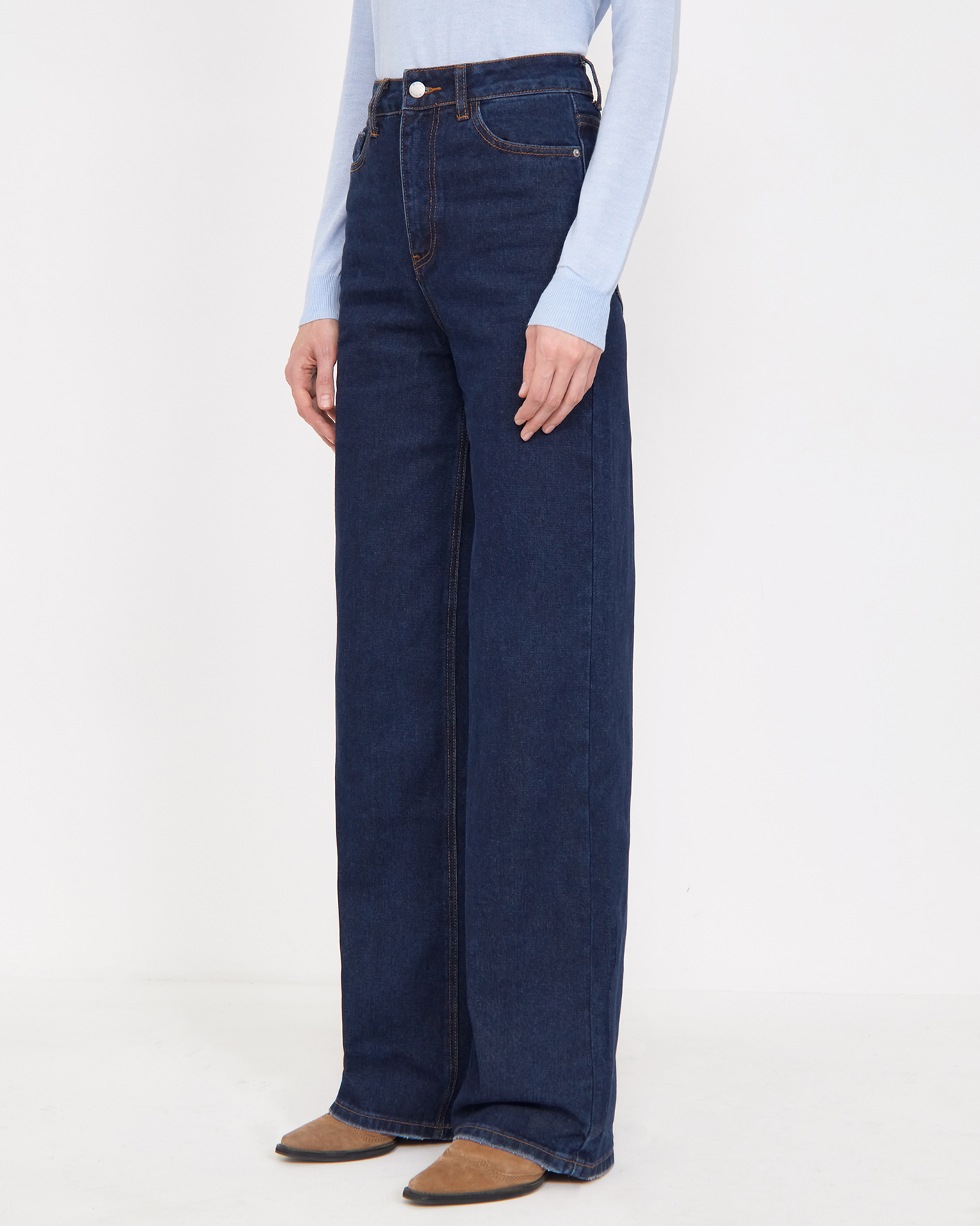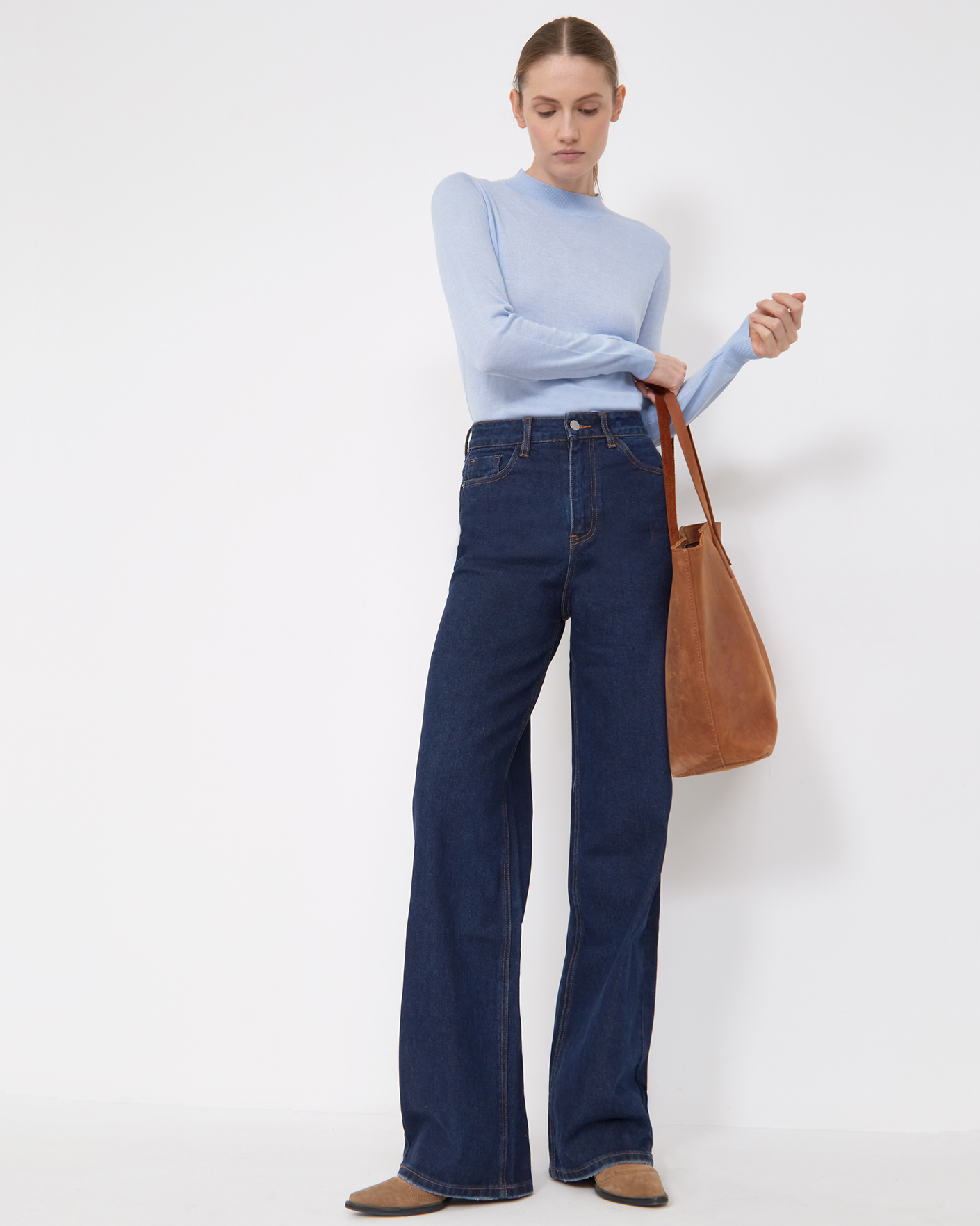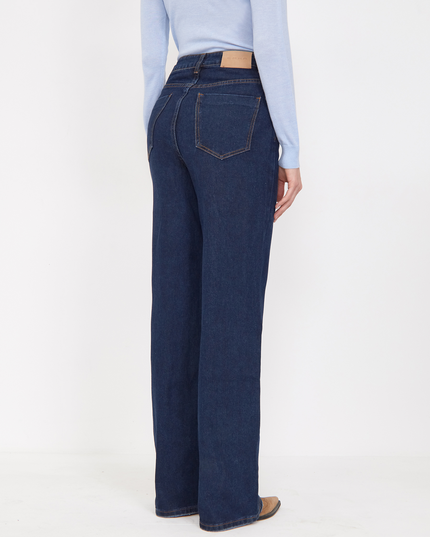 Широкие джинсы Emka фиолетово-синего цвета. Модель из 100% хлопка с завышенной талией на стандартной застежке. Имеются карманы по бокам и накладные сзади. Джинсы - универсальная вещь на каждый день.