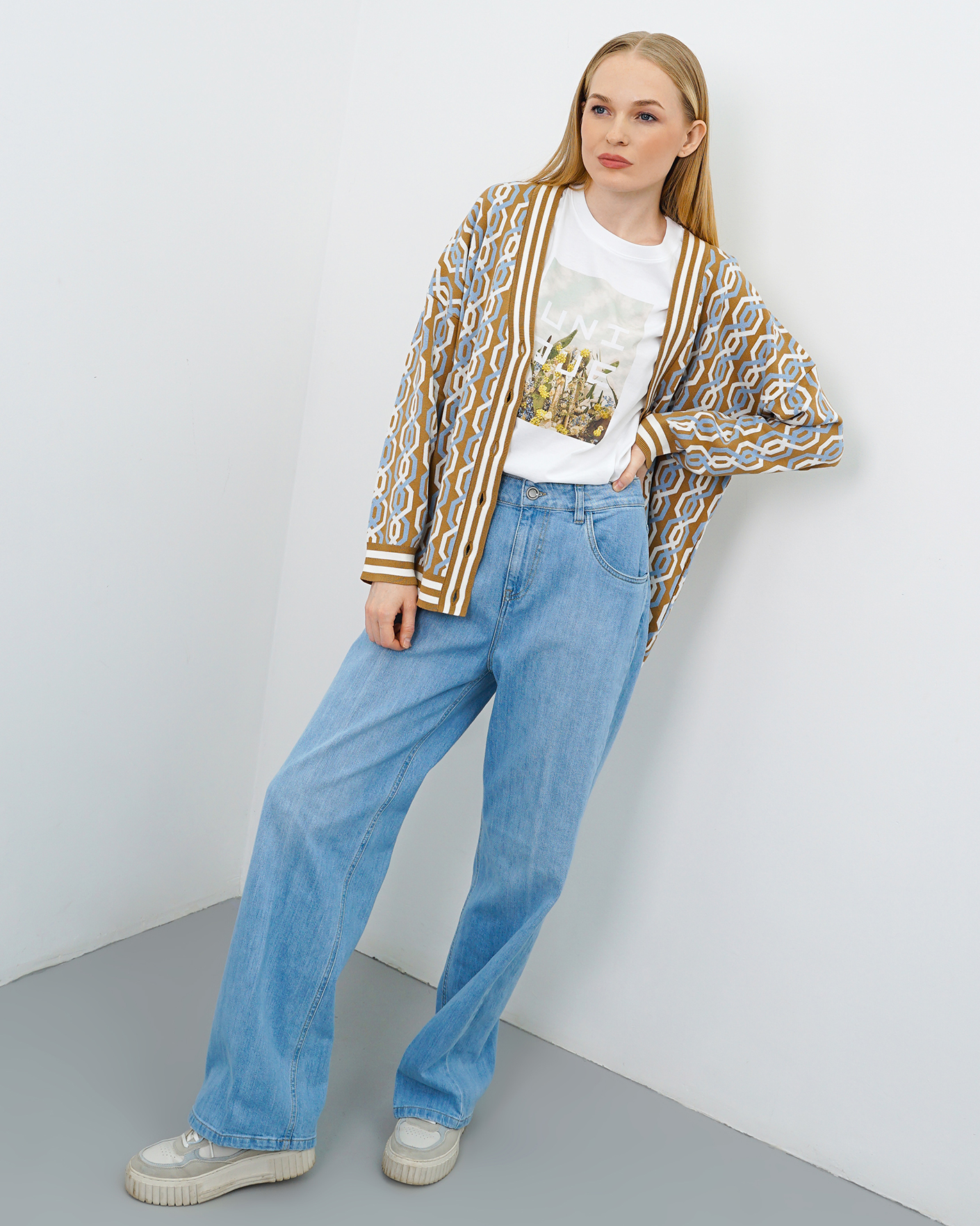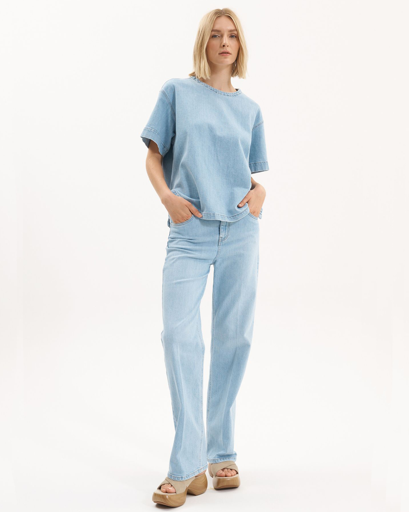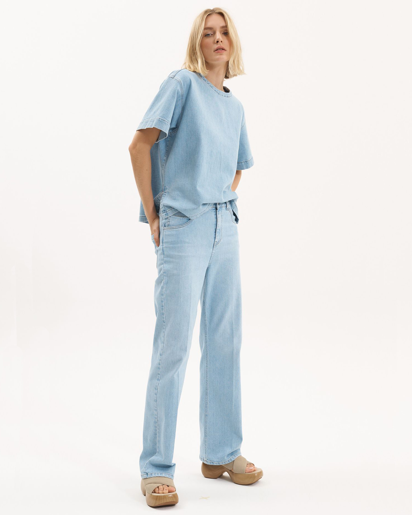 Широкие джинсы UNQ голубого цвета. Хлопковая модель с завышенной талией на стандартной застежке, имеются карманы по бокам и накладные сзади. Джинсы - база вашего гардероба.