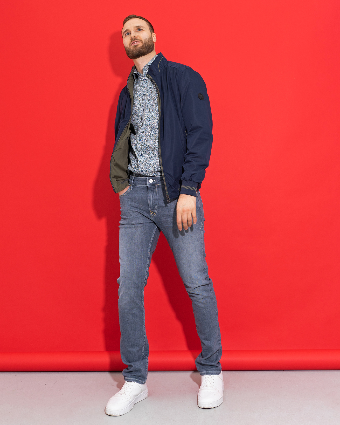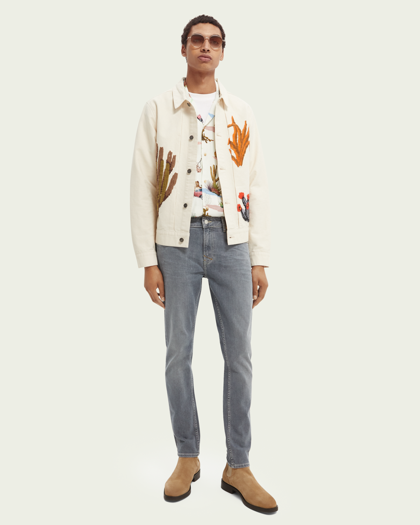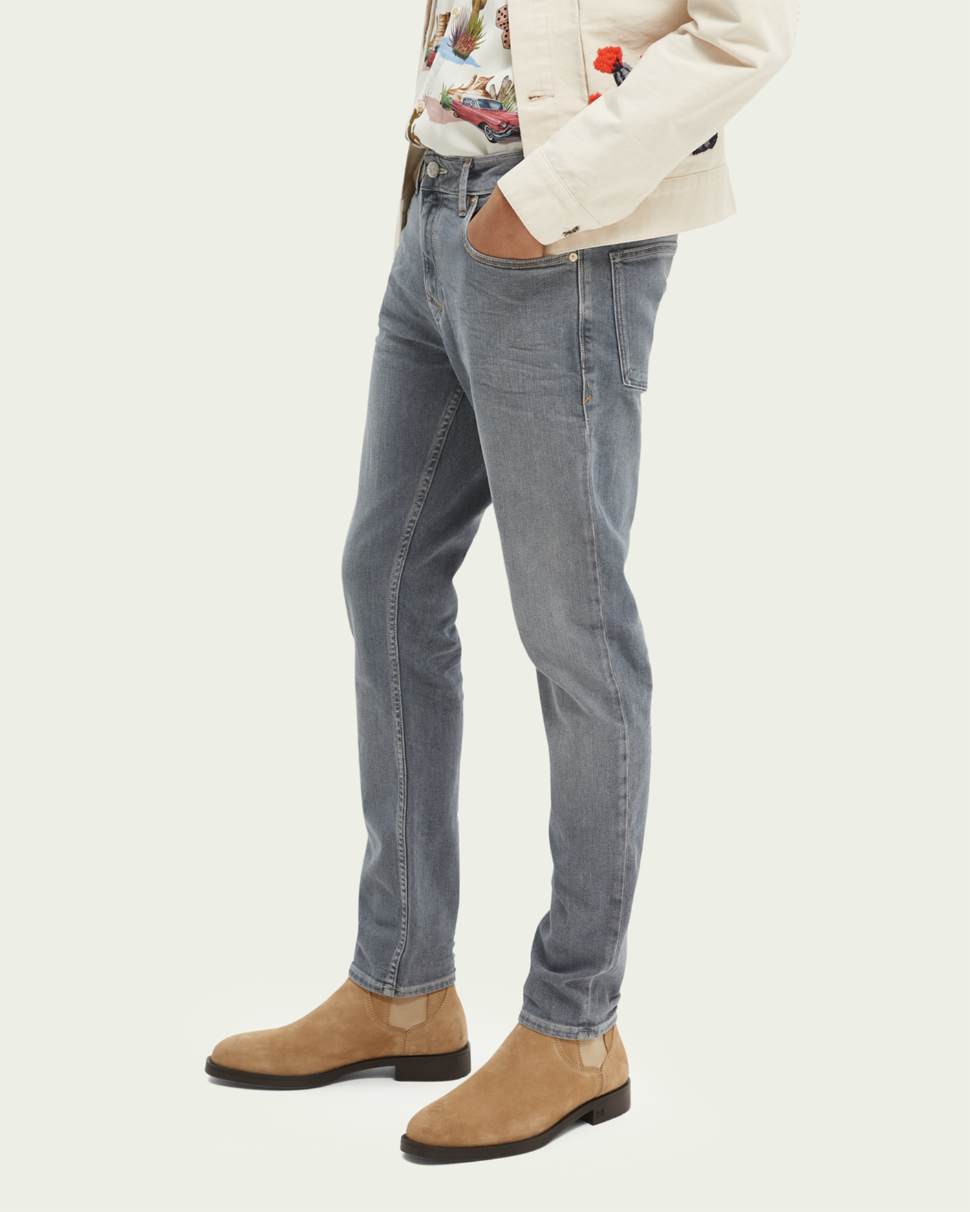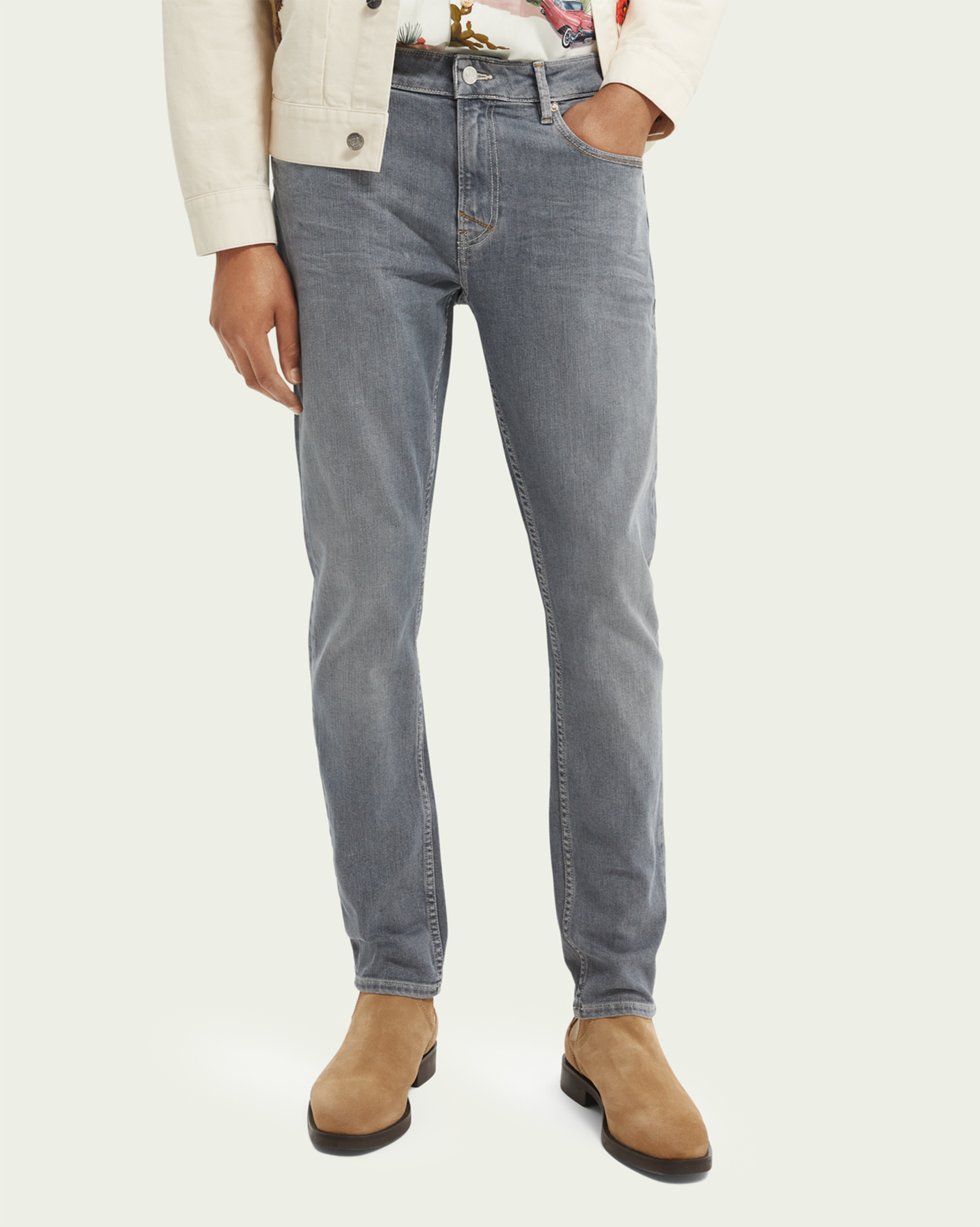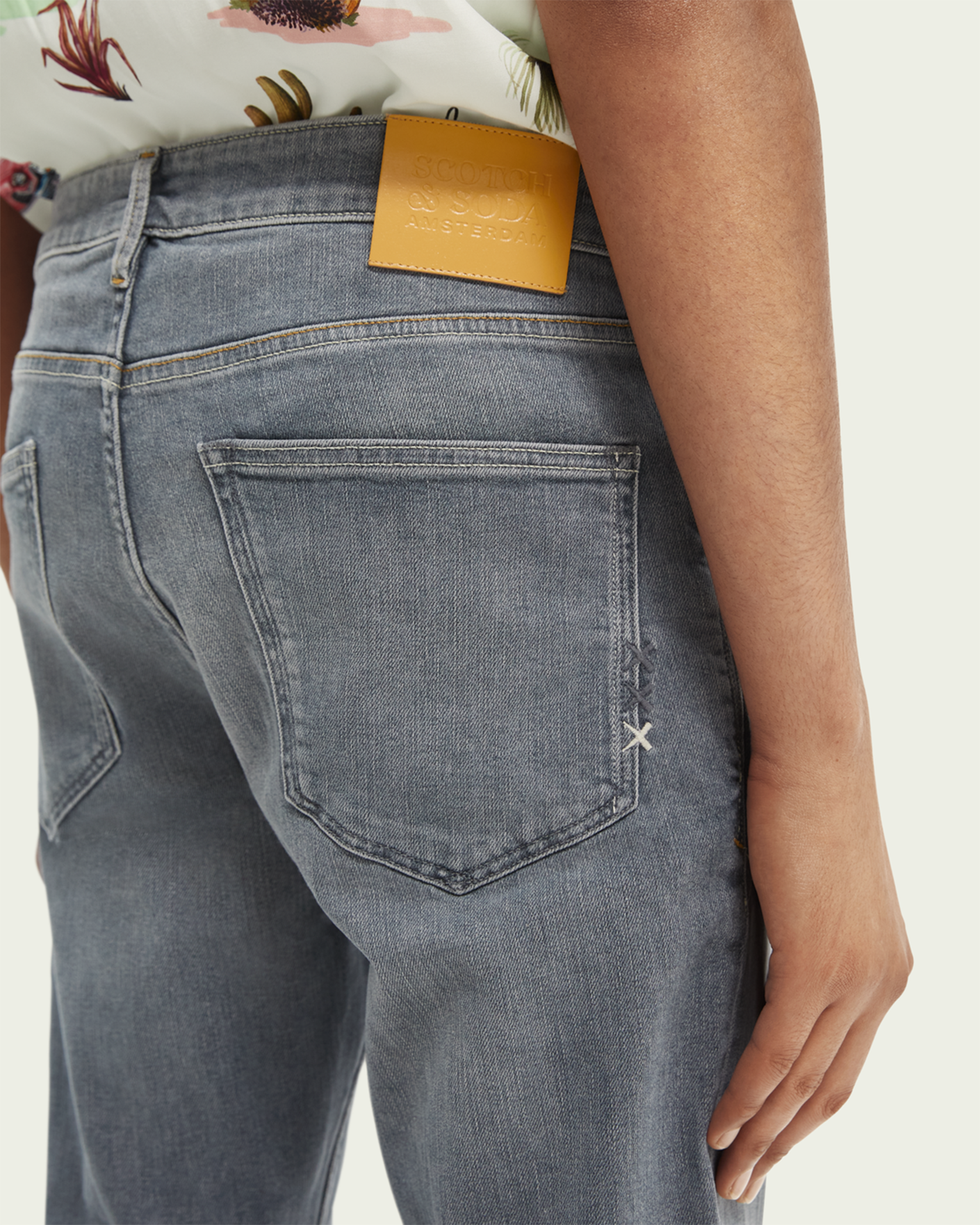 Джинсы Scotch&Soda серо-синего цвета в диагональную структуру. Хлопковая модель с застежкой на пуговицу и скрытую молнию, имеются боковые карманы и накладные карманы сзади. Джинсы - базовая вещь вашего градероба.