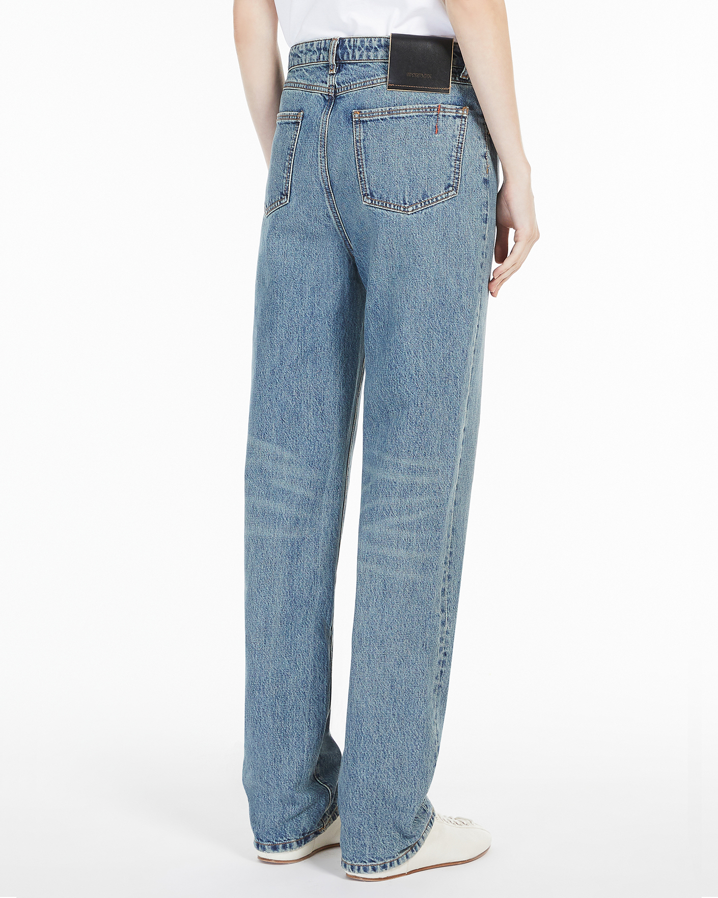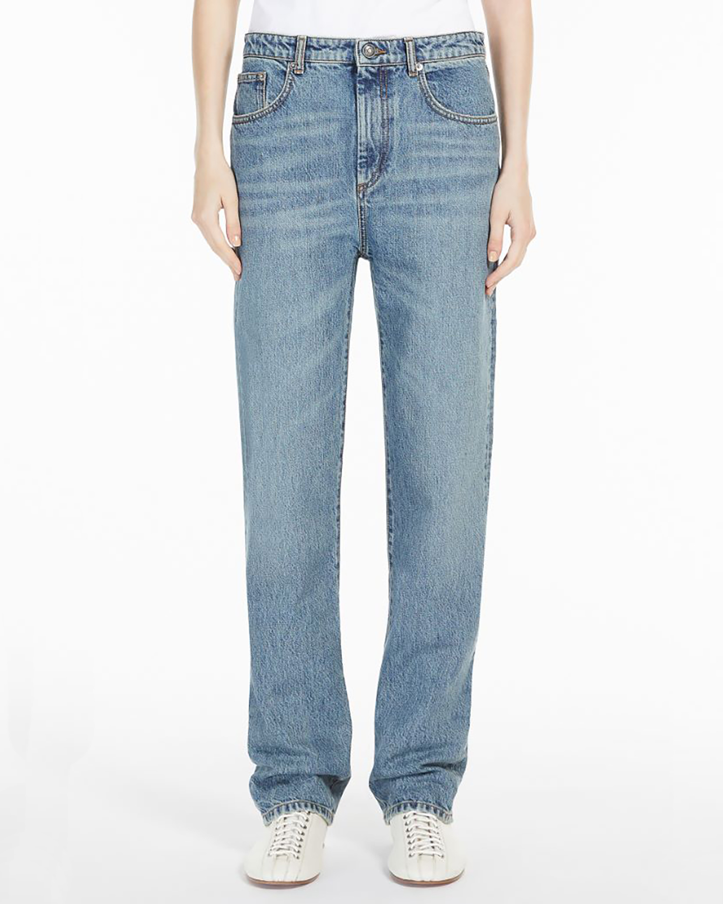 Джинсы Sportmax голубого цвета с отбеленным эффектом. Хлопковая модель с заниженной талией на стандартной застежке, имеются карманы по бокам и накладные сзади. Джинсы - универсальная вещь на каждый день.