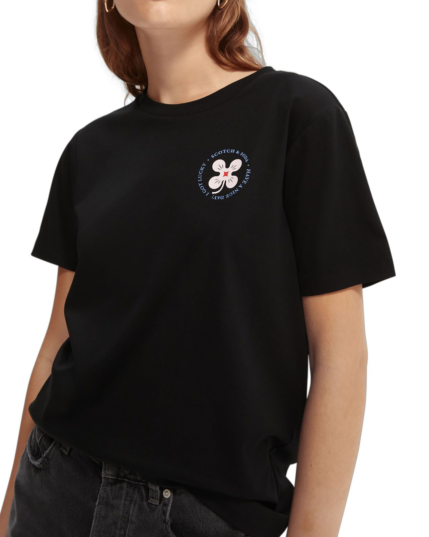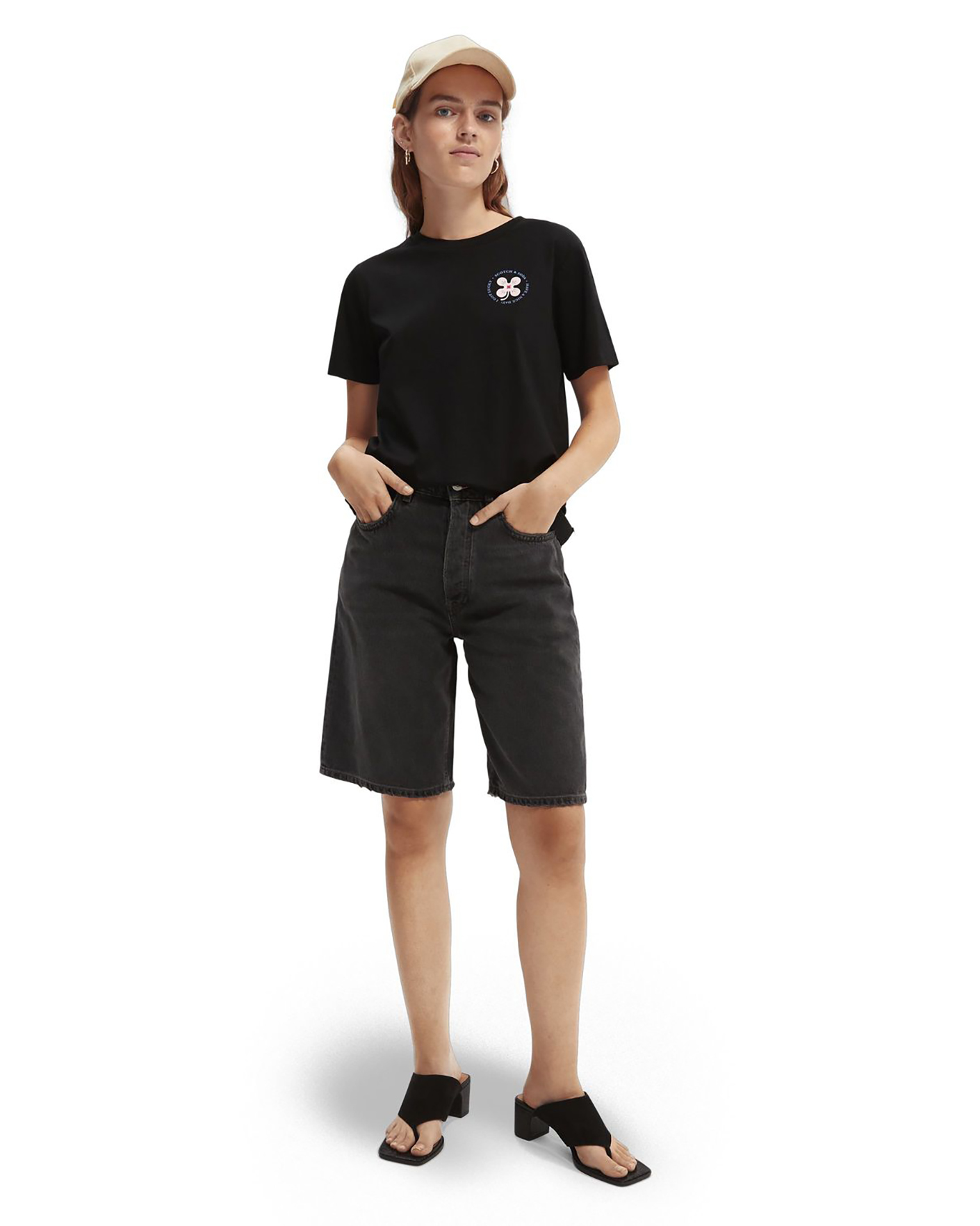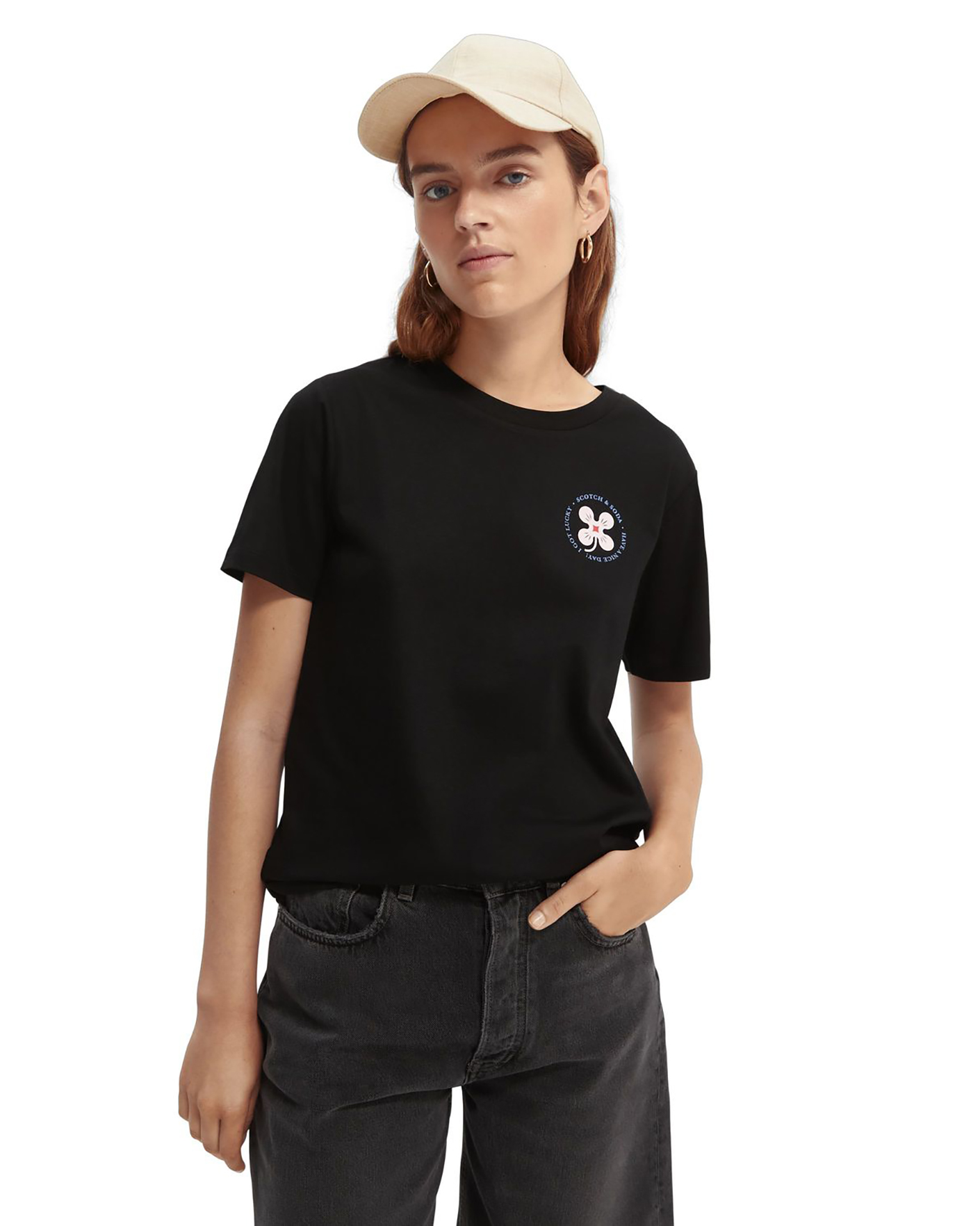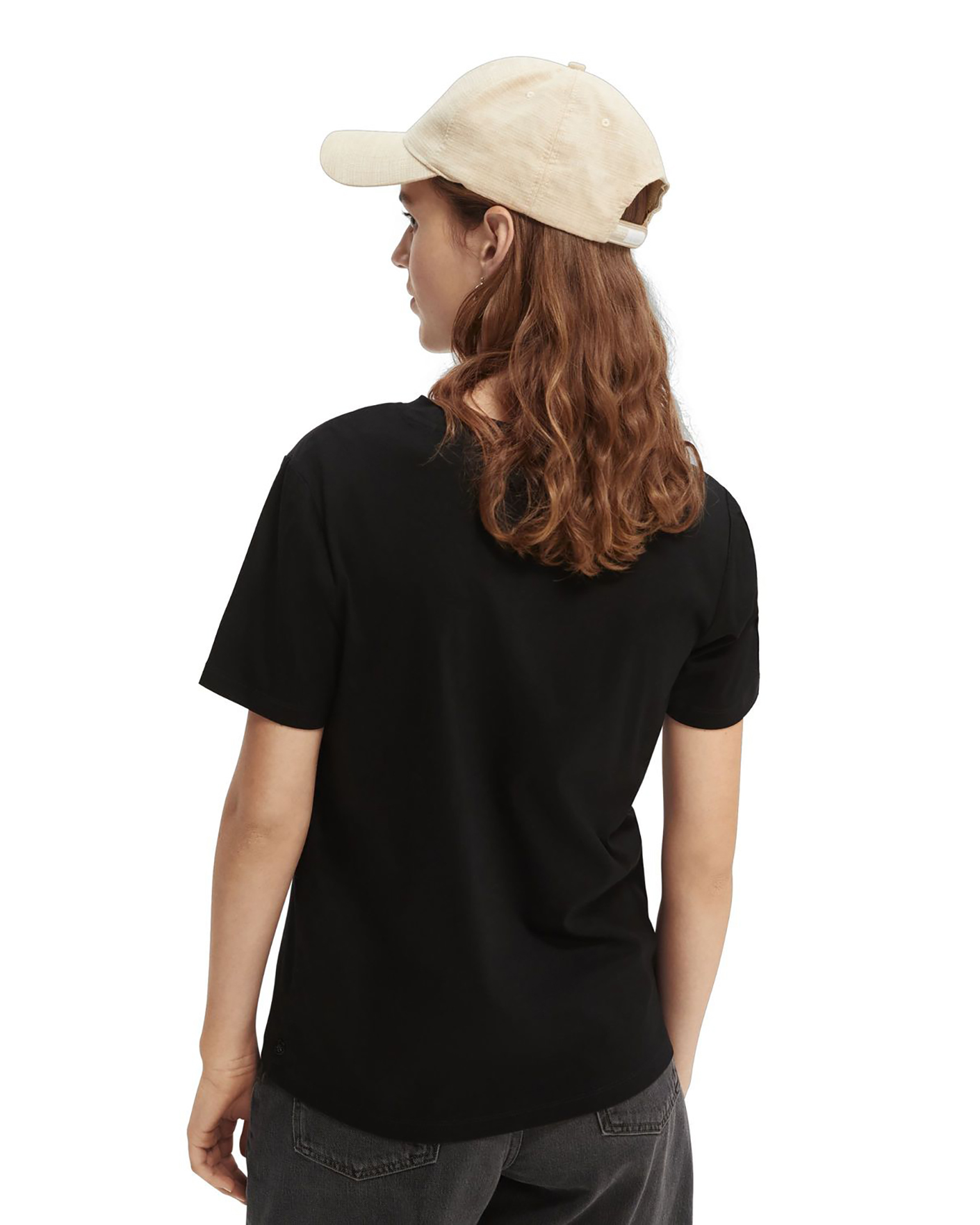 Футболка Scotch&Soda черного цвета с небольшим нагрудным принтом. Модель прямого кроя с круглым вырезом и широкими рукавами. Футболка станет незаменимой вещью повседневного гардероба.