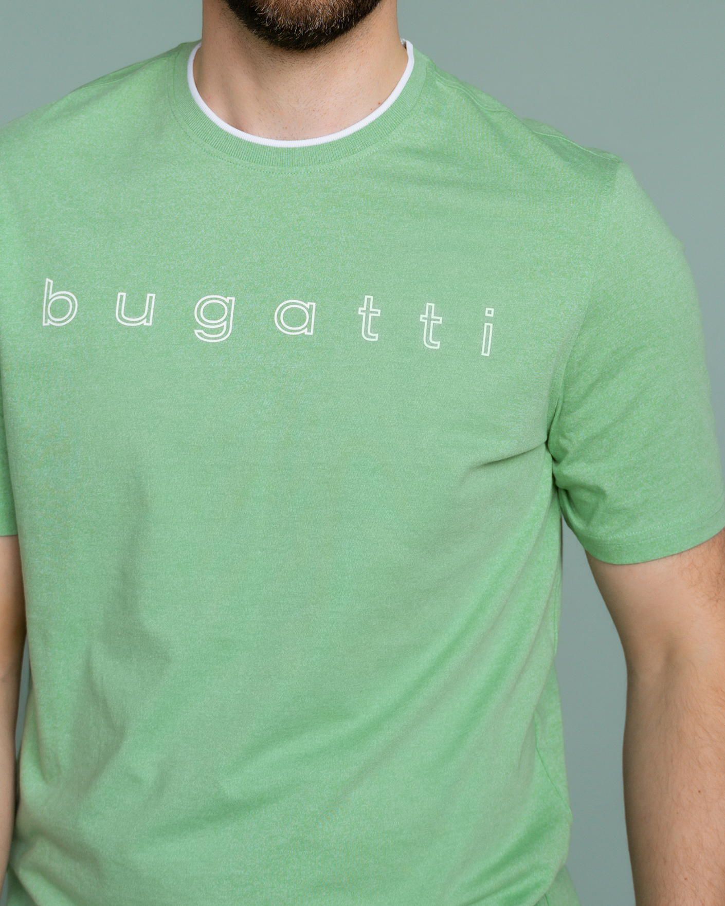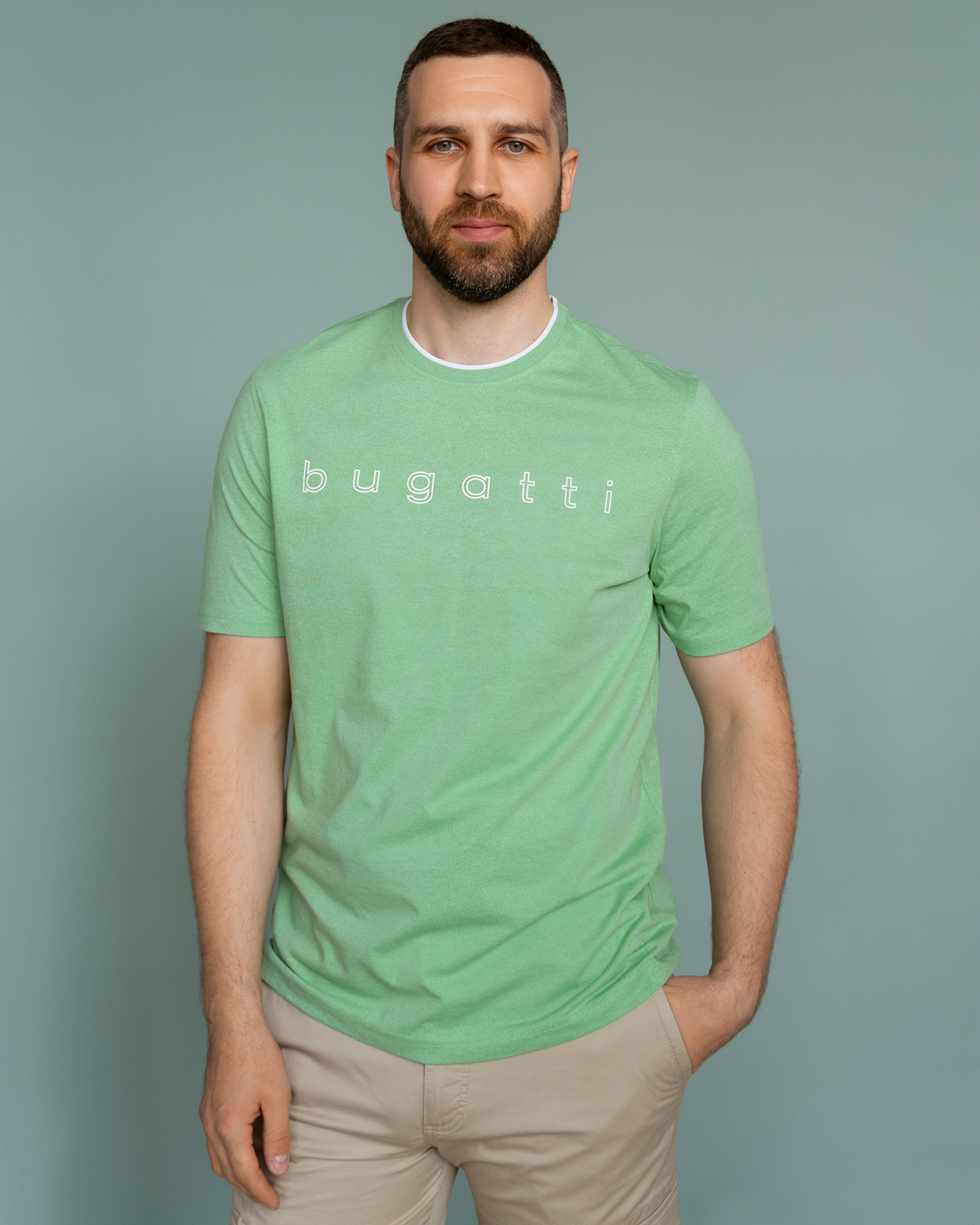 Футболка Bugatti светло-зеленого цвета в строчный рисунок. Модель с крупным нагрудным принтом в виде логотипа. Круглый вырез на тонкой резинке с контрастной полосой по краю. Футболка станет незаменимой вещью вашего гардероба.