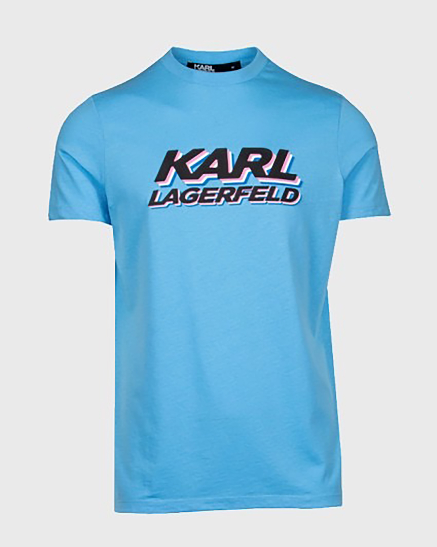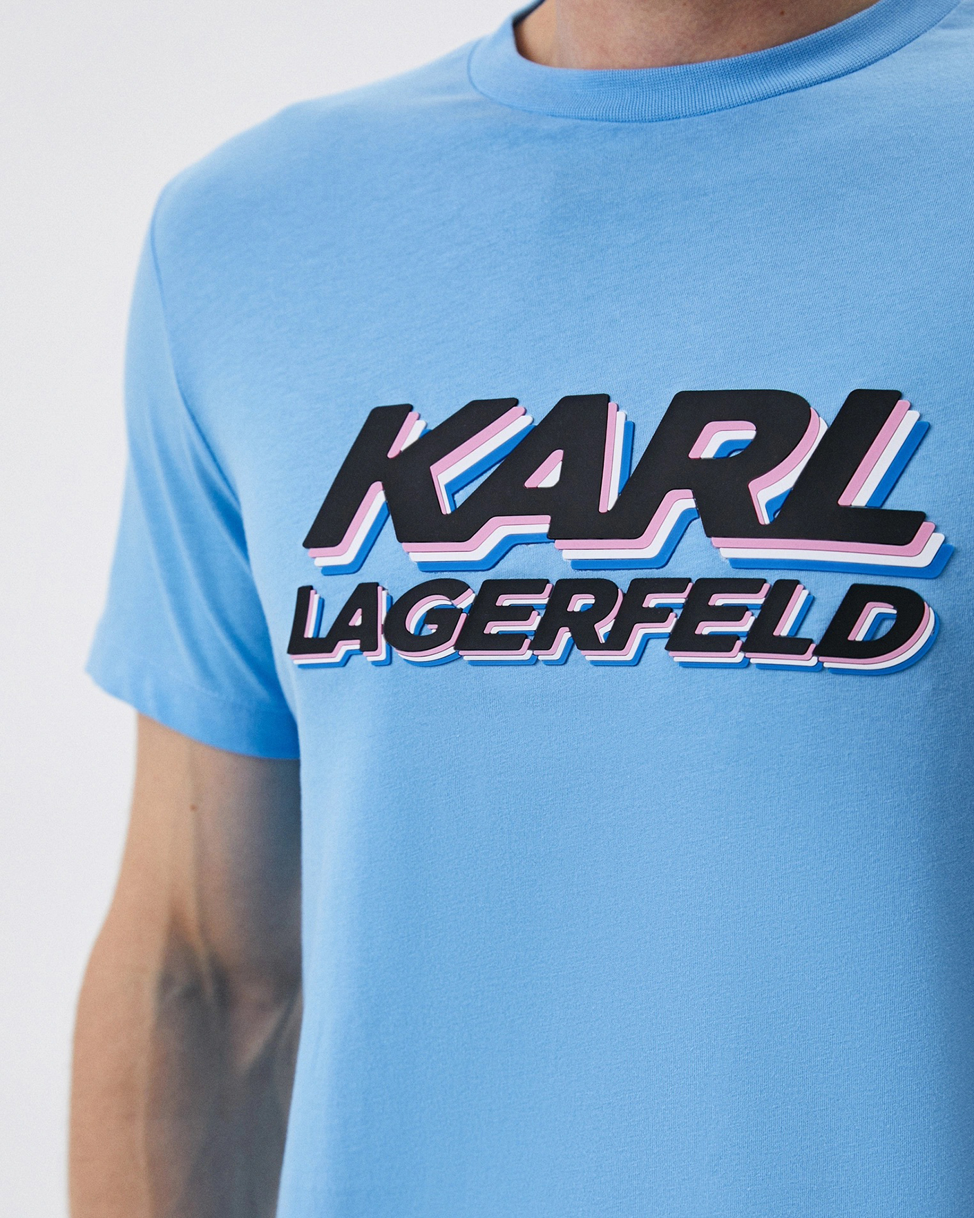 Футболка Karl Lagerfeld голубого цвета с крупным нагрудным логотипом. Модель прямого кроя с круглым вырезом и короткими рукавами. Футболка отлично впишется в ваш повседневный гардероб.