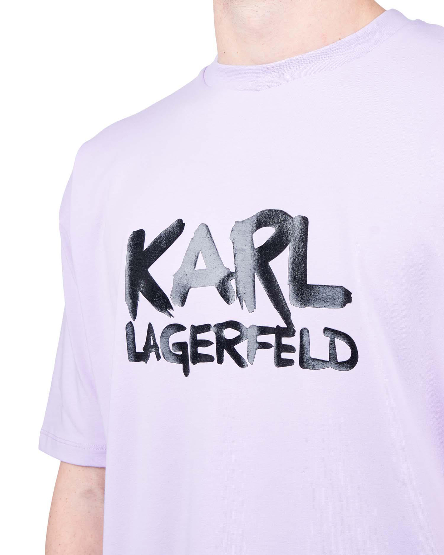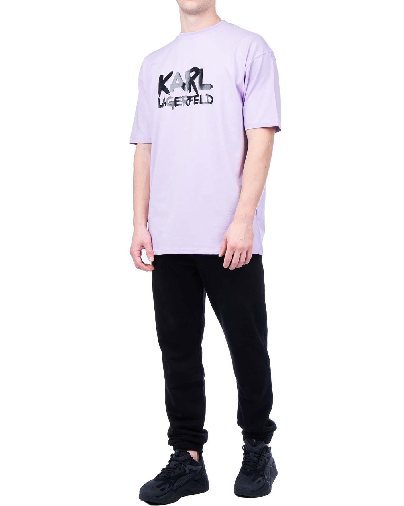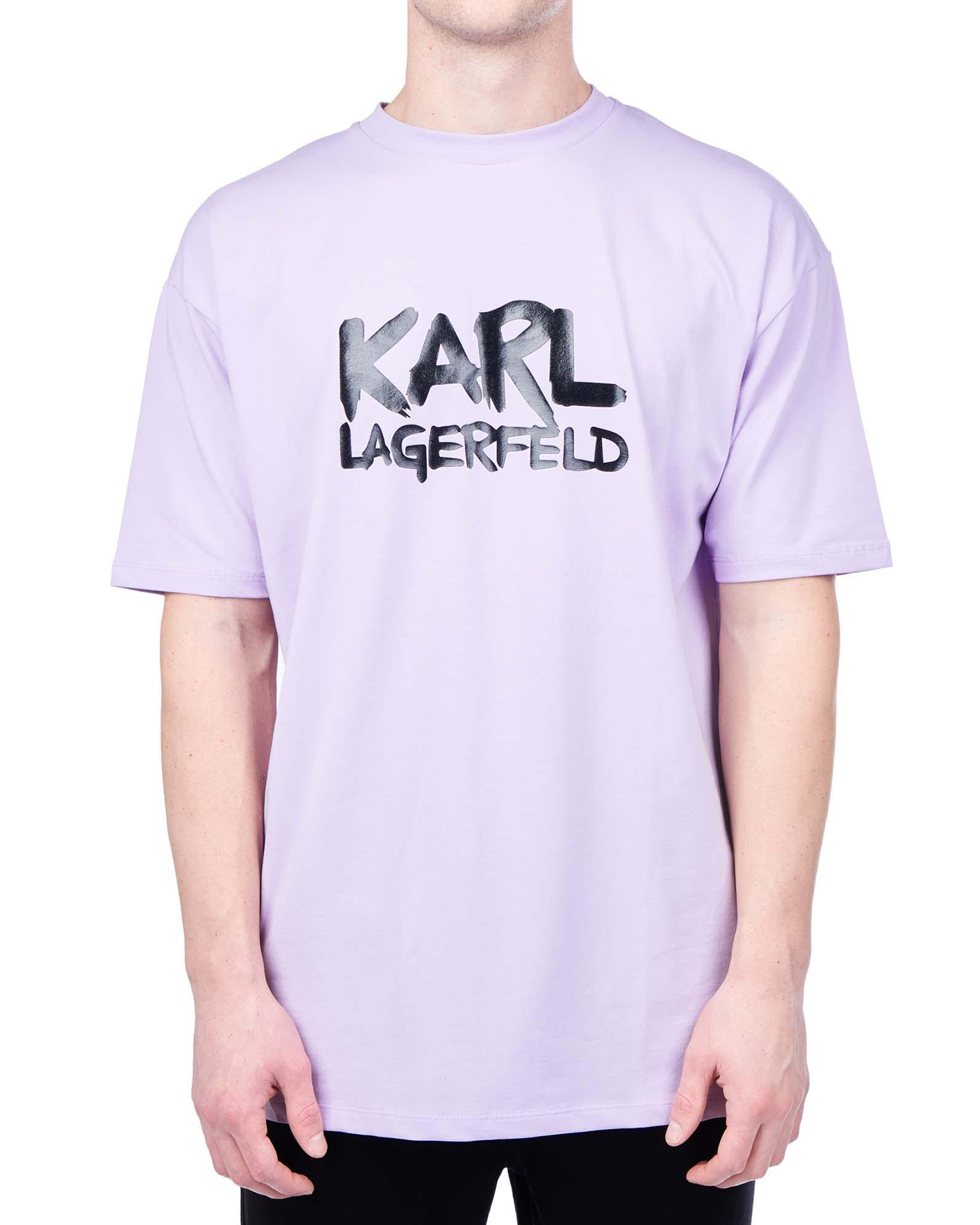 Футболка Karl Lagerfeld сиреневого цвета с крупным логотипом по центру. Модель прямого кроя с круглым вырезом и короткими рукавами. Футболка отлично впишется в ваш гардероб.