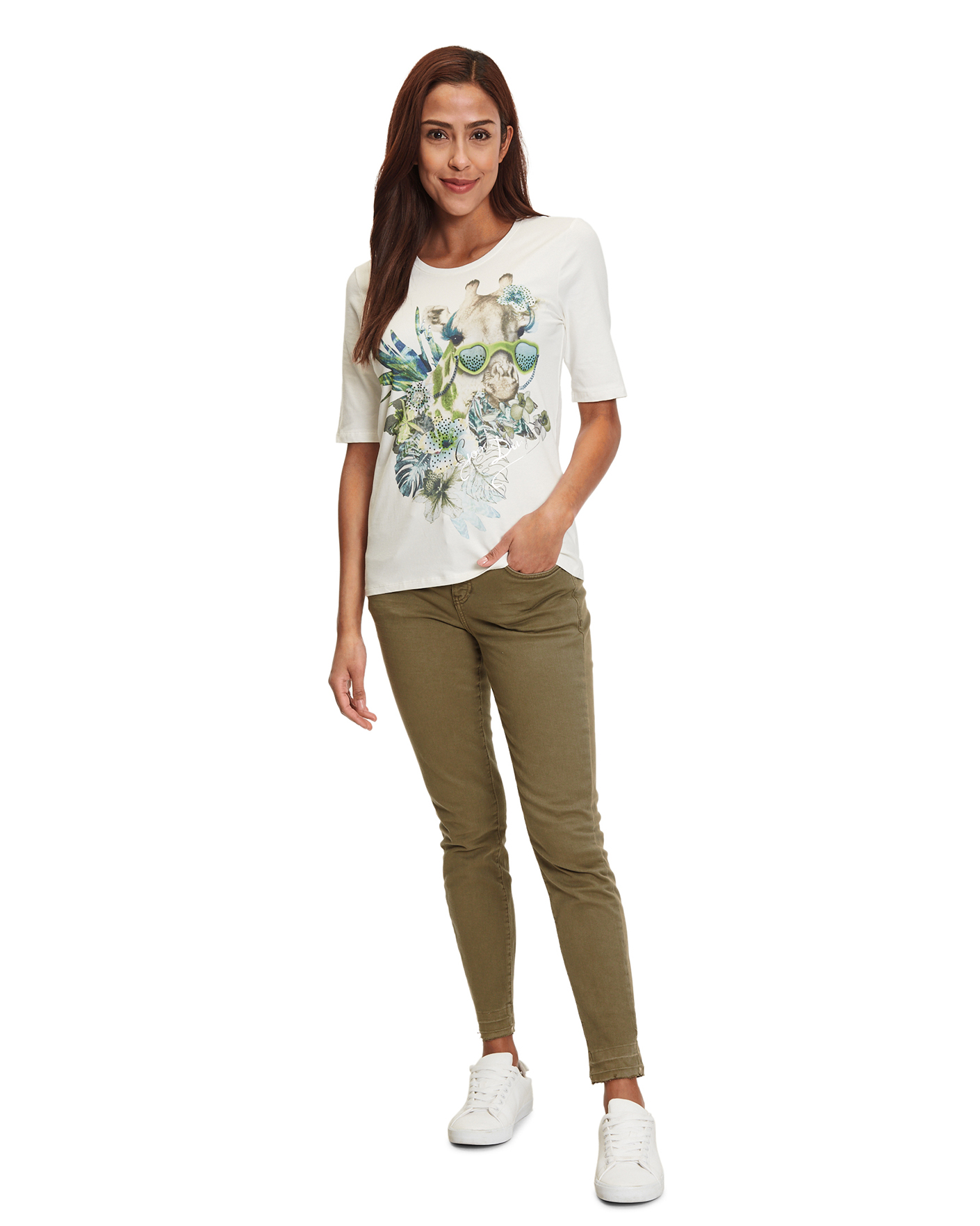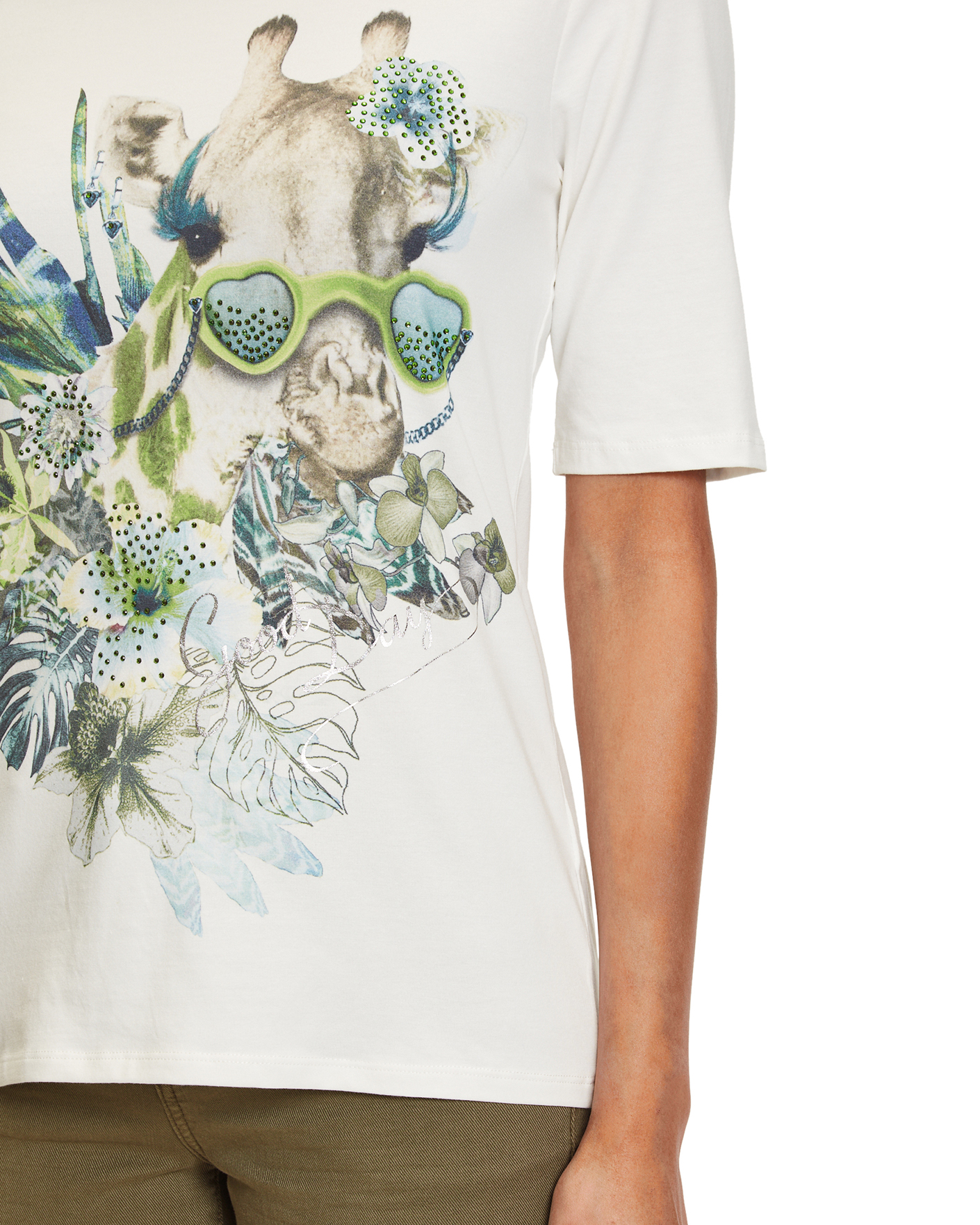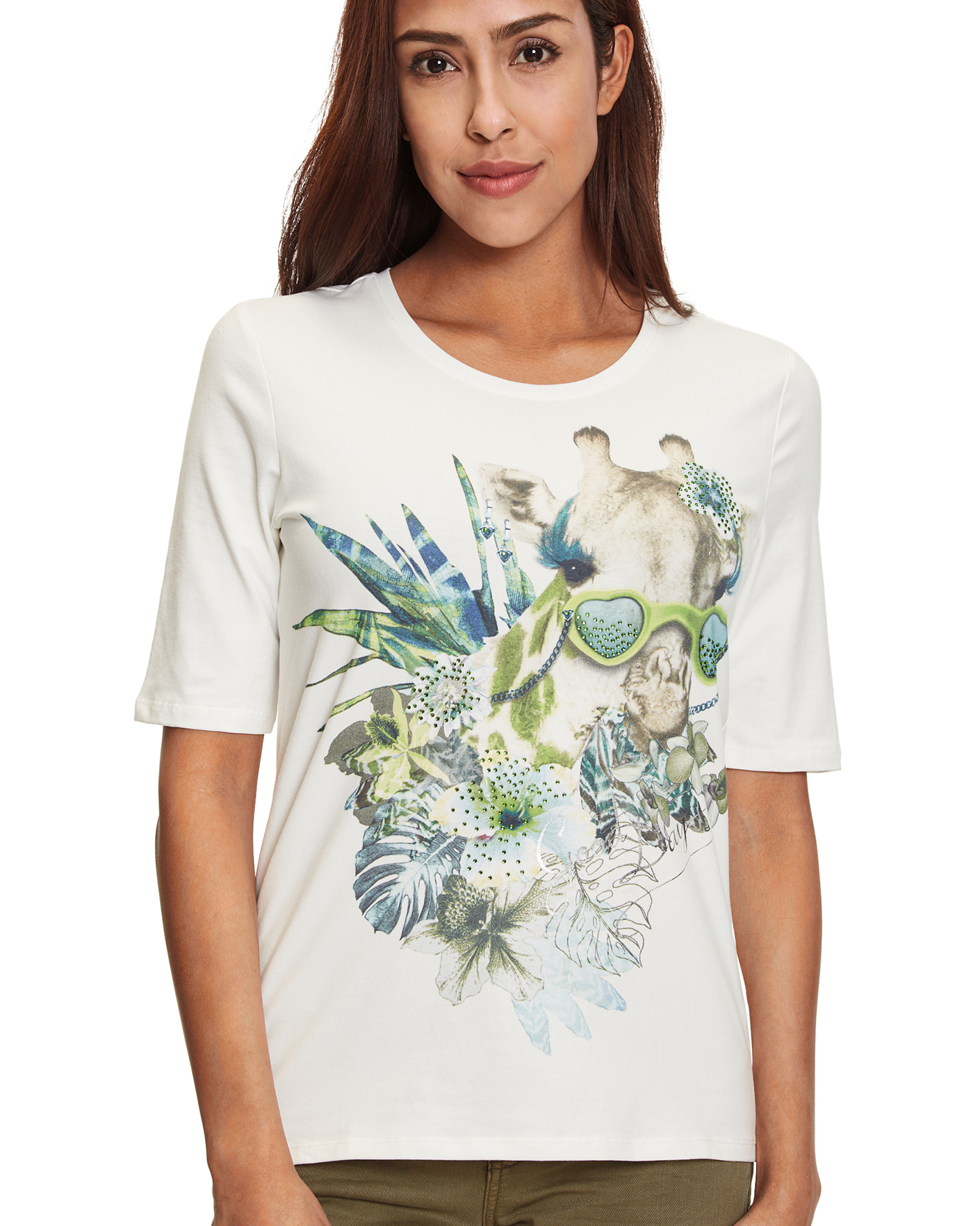 Полуприталенная футболка Betty Barclay белого цвета с принтом в виде жирафа и цветов, декорированных стразами. Хлопковая модель с круглым вырезом и короткими рукавами. Футболка - универсальная вещь на каждый день.