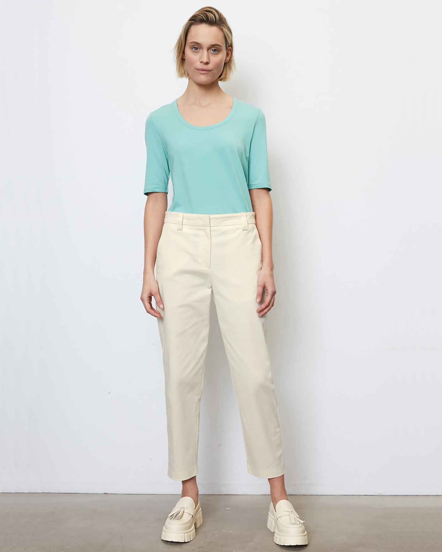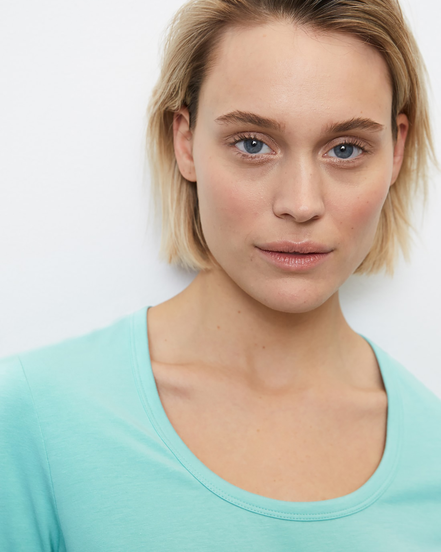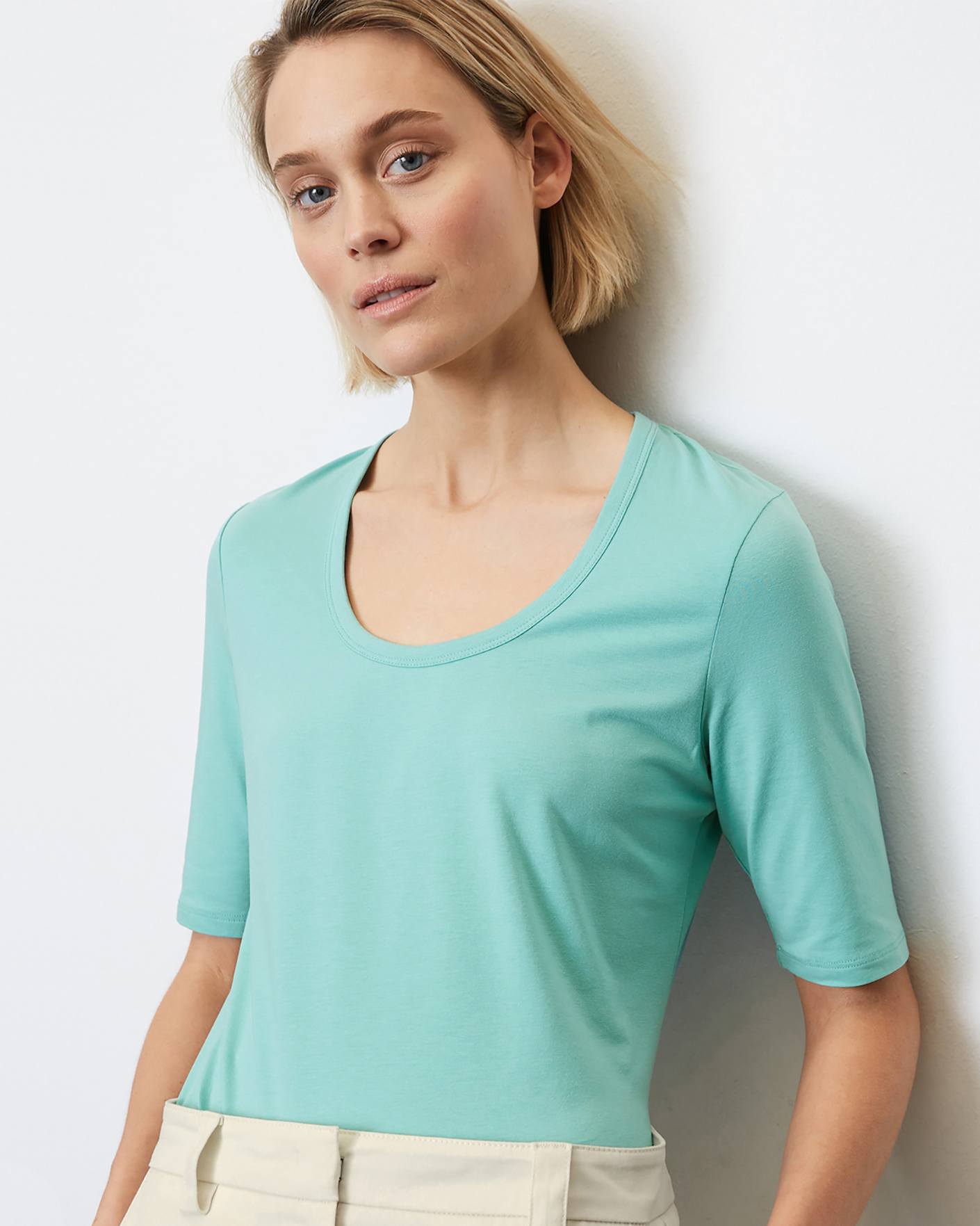 Полуприталенная футболка Marc O'Polo голубого цвета. Модель с глубоким круглым вырезом и короткими рукавами. Футболка - незаменимая вещь на каждый день.