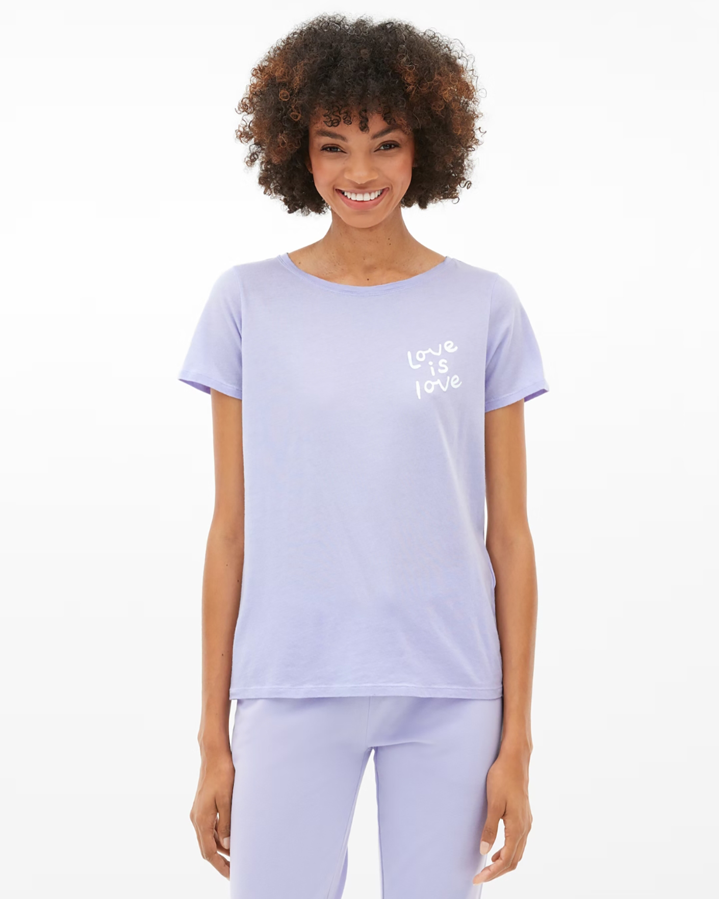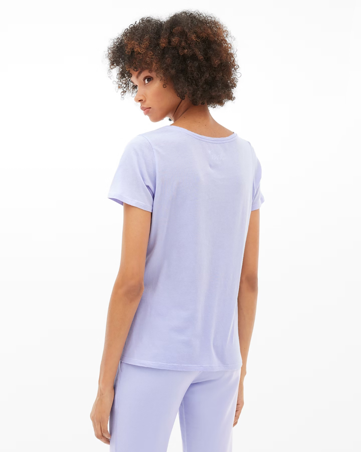 Полуприталенная футболка Juvia светло-сиреневого цвета с нагрудным принтом. Модель с круглым вырезом и  короткими рукавами выполнена из 100% хлопка. Футболка станет незаменимой вещью на каждый день.