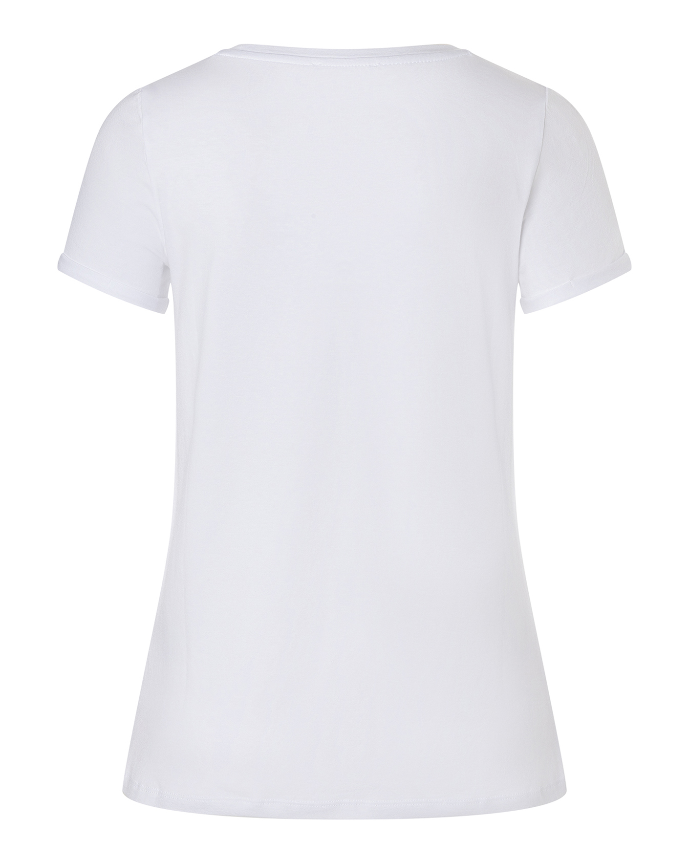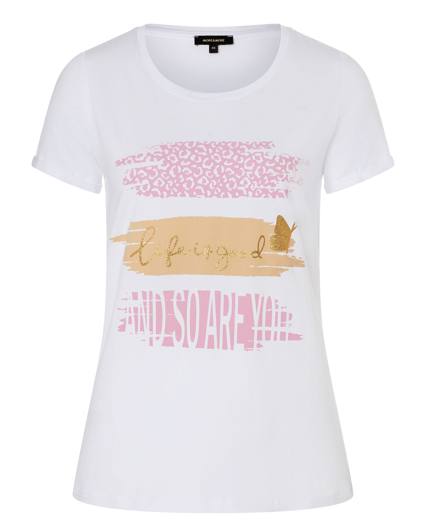 Полуприталенная футболка More&More белого цвета с принтом и слоганом по центру. Модель из 100% хлопка с короткими рукавами и круглым вырезом. Футболка - незаменимая вещь вашего гардероба.