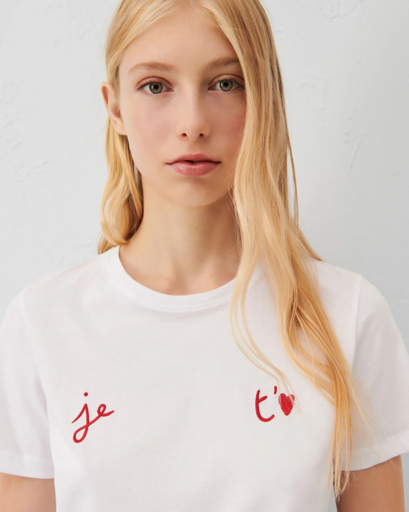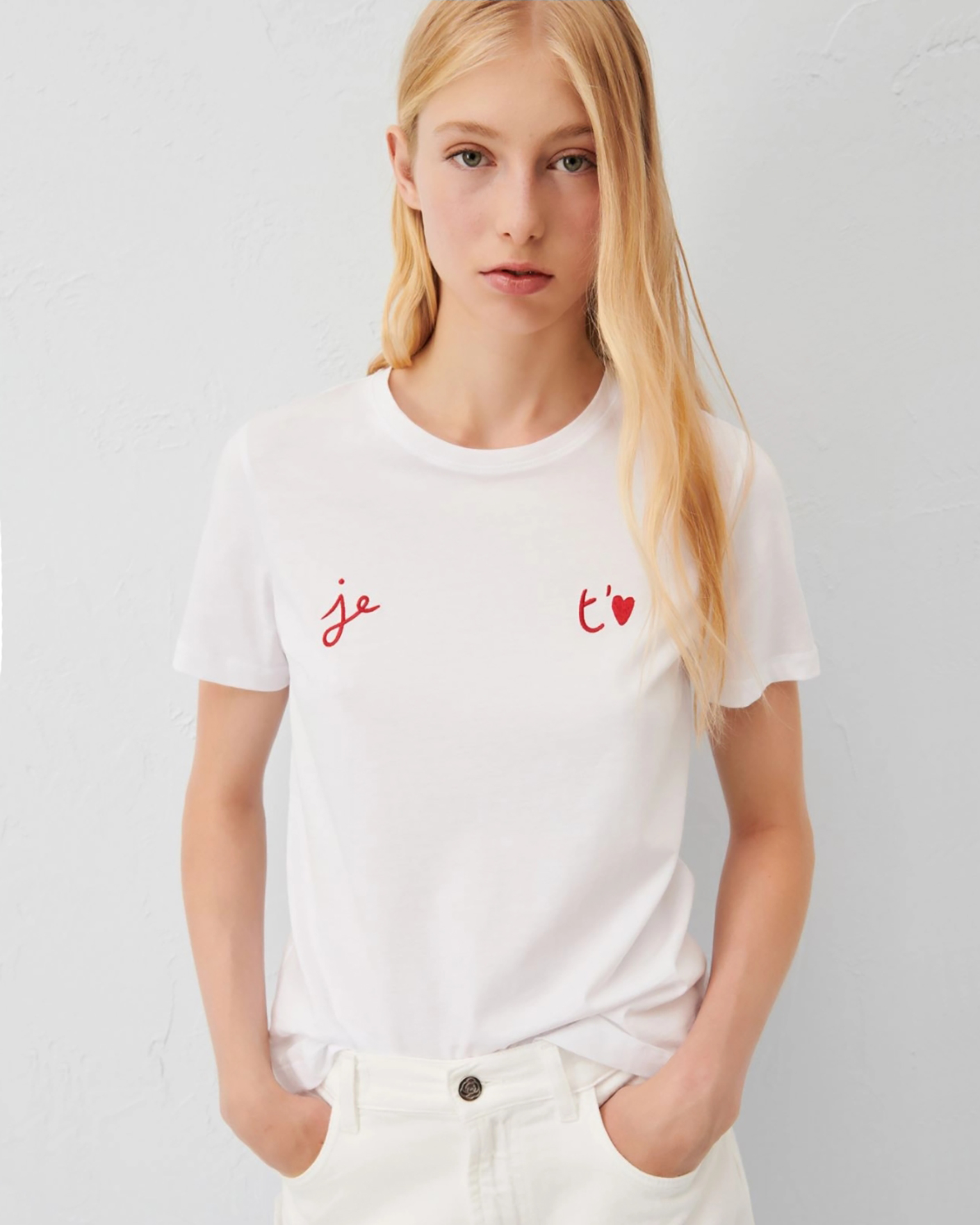 Полуприталенная футболка Marella белого цвета с аккуратными вышивками на груди. Модель из 100% хлопка, прямой крой, круглый вырез, короткие рукава. Футболка - база вашего гардероба.