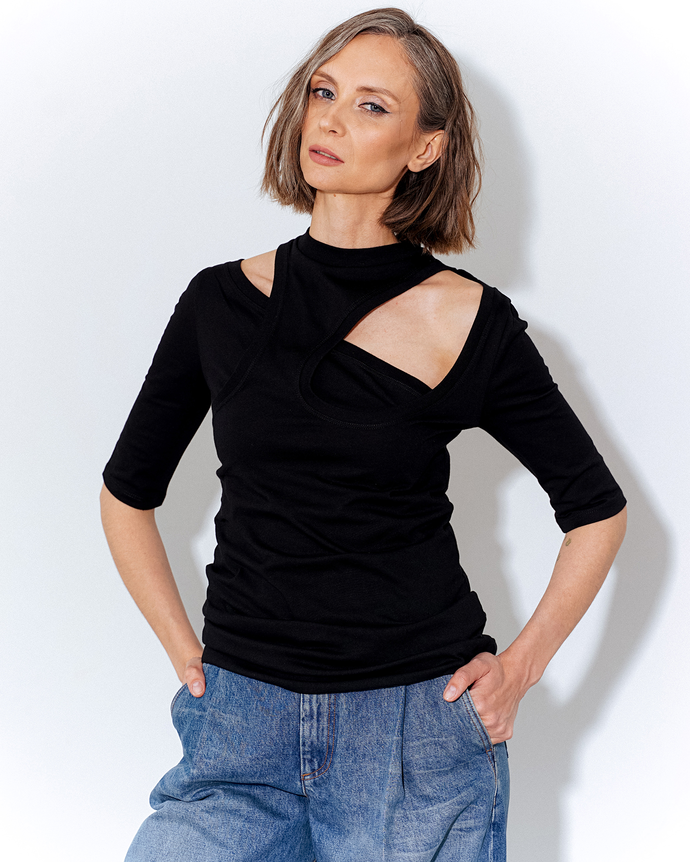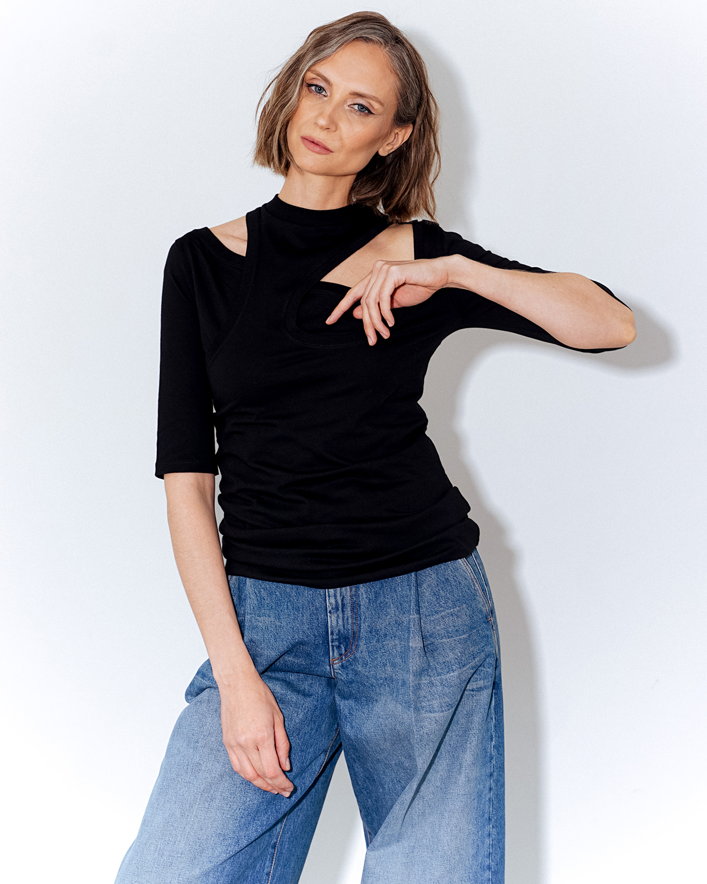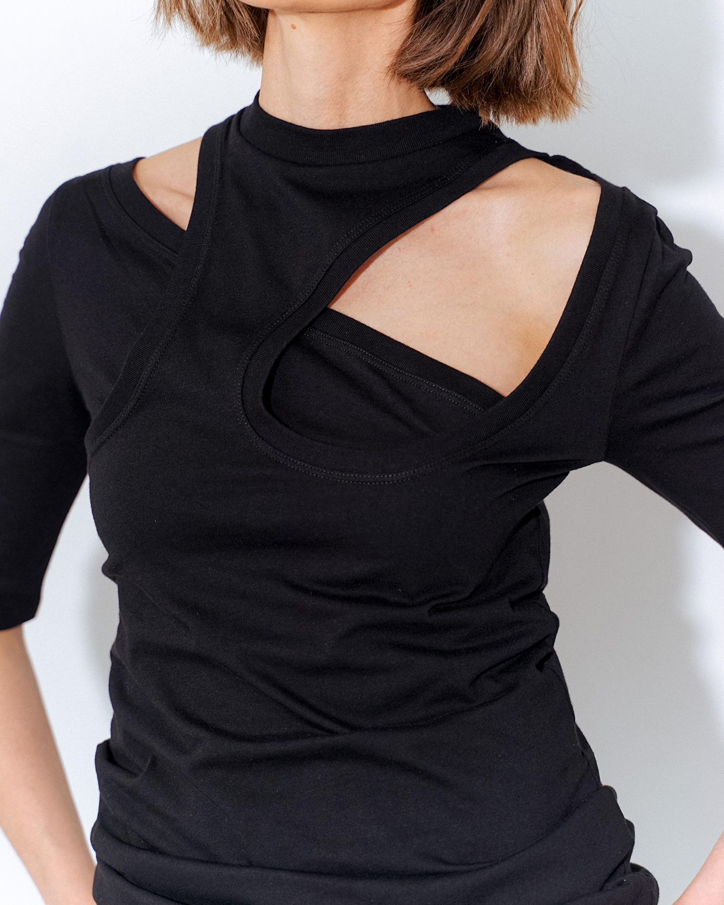 Приталенная футболка Sportmax черного цвета. Модель двойным ассиметричным вырезом. Круглым вырез и короткие рукава. Стильная футболка отлично впишется в ваш гардероб.