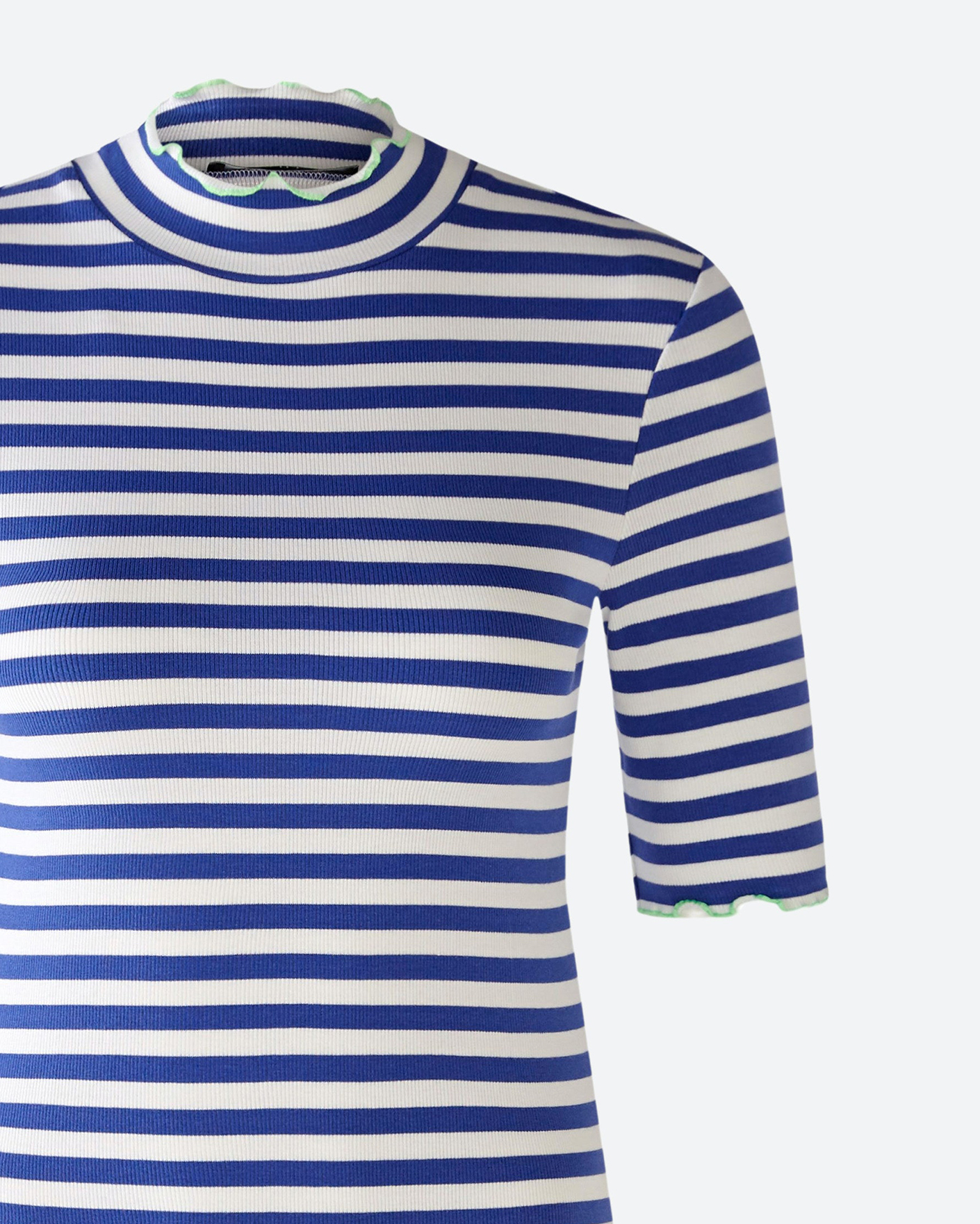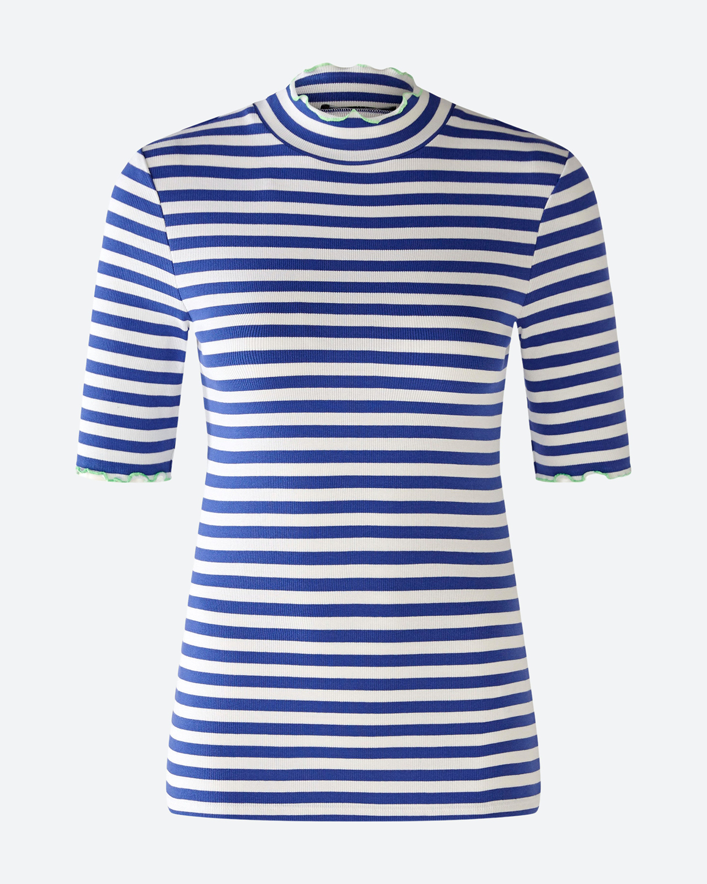 Приталенная футболка OUI бело-синего цвета в вертикальный строчный рисунок и горизонтальную полосу. Хлопковая модель с воротником-стойка и короткими рукавами с контрастной отделкой волнами. Футболу можно сочетать с рубашкой, джемпером, жилетом, жакетом, кардиганом, юбкой и брюками.