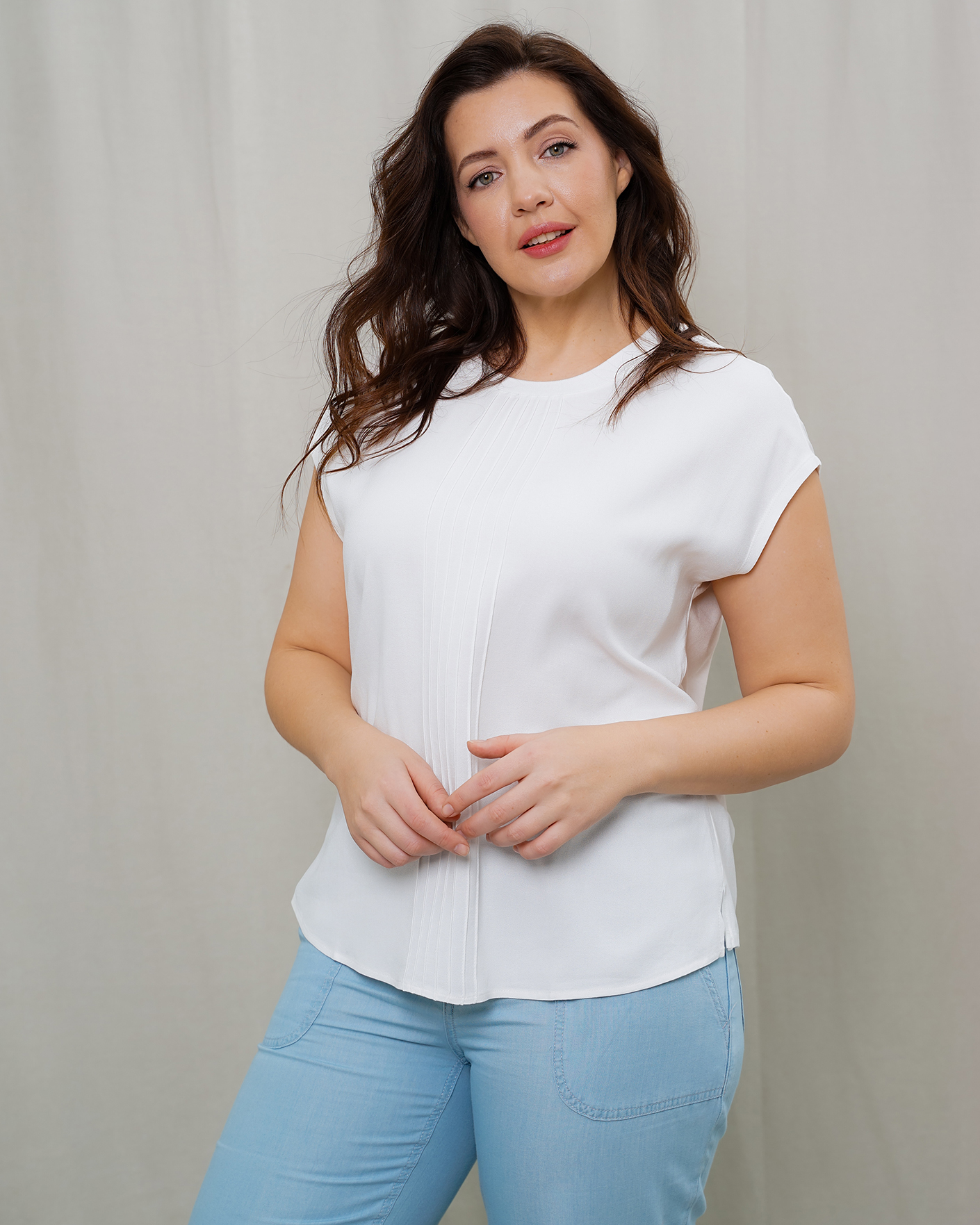 Приталенная футболка Barbara Lebek белого цвета. Модель с круглым вырезом, спущенная линия плеча без рукавов, декоративные вертикальные складки по центру. Футболка отлично впишется в базовый гардероб.