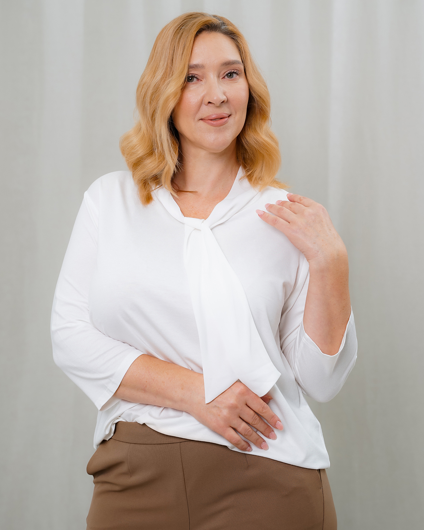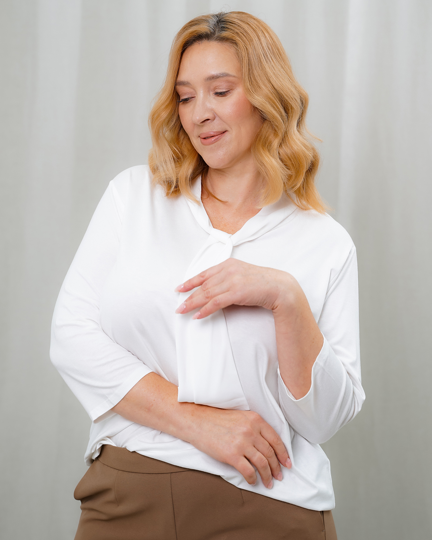 Стильная футболка Frank Walder белого цвета в строчный рисунок. Модель с длинными рукавами, с V-образным вырезом с эффектным женственным бантом из гладкого шифона, который можно стильно завязать. Футболка отлично впишется в ваш гардероб.
