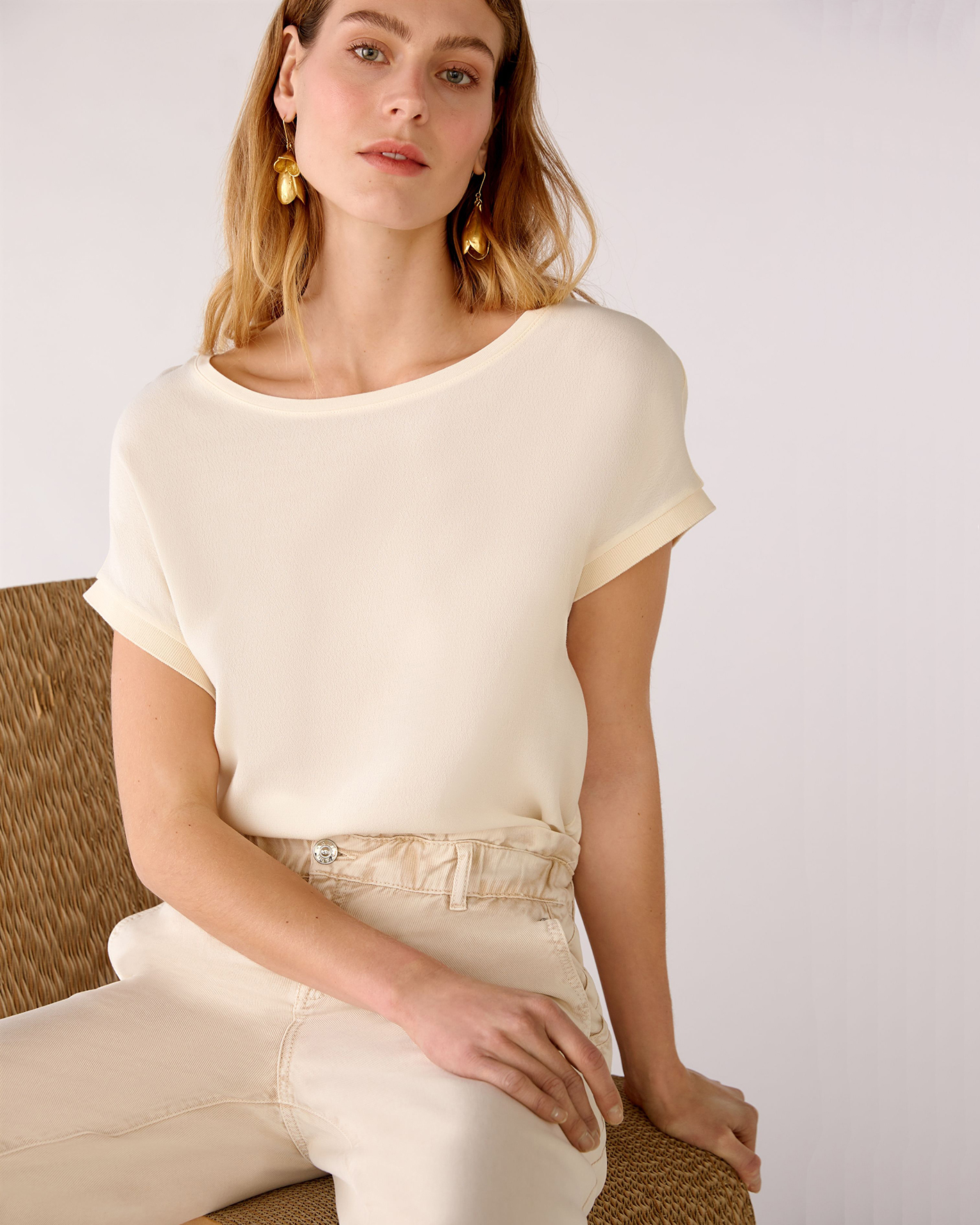 Свободная футболка OUI цвета шампань. Модель с круглым вырезом, спущенной линией плеча с короткими рукавами. Футболку можно сочетать с любым гардеробом.