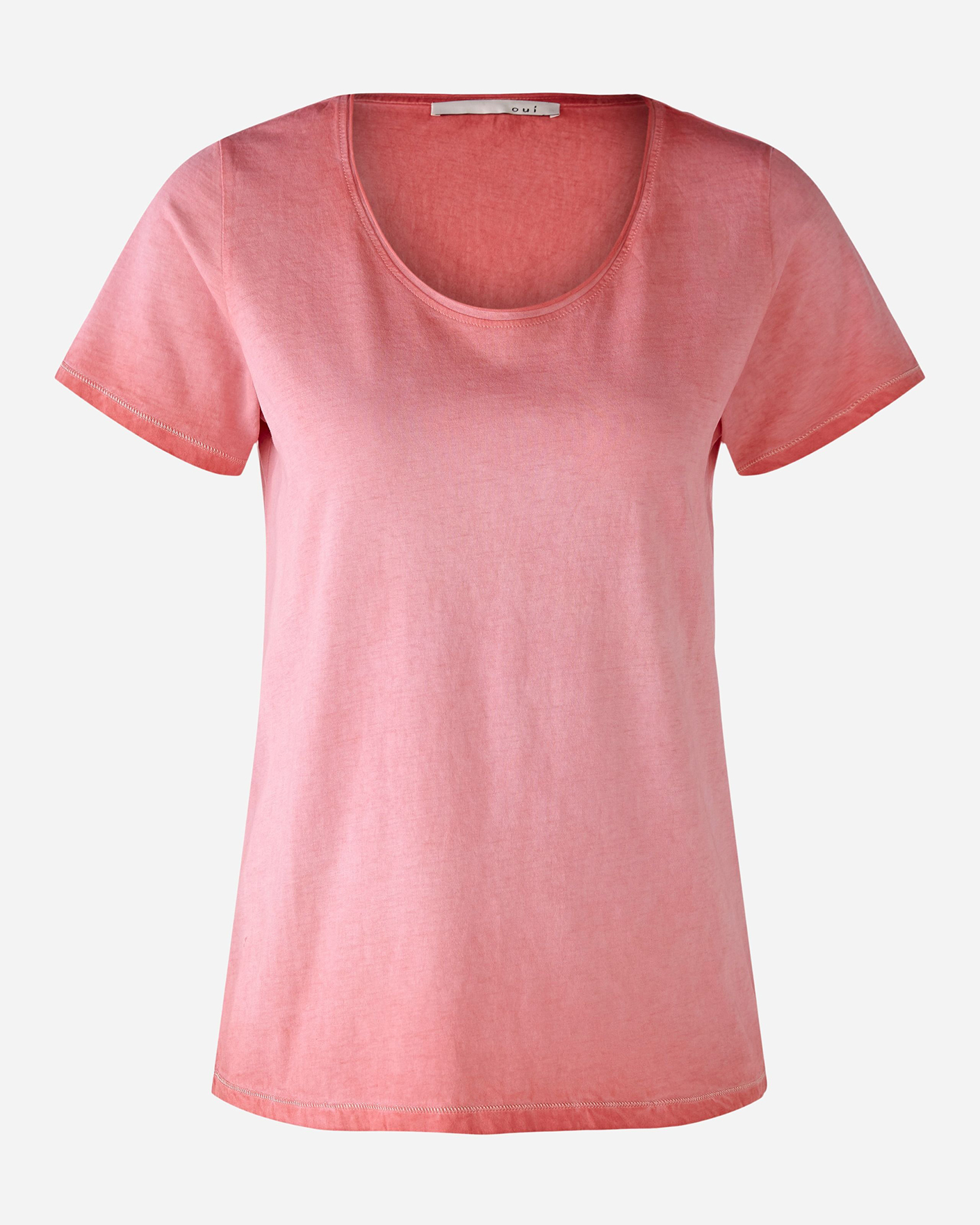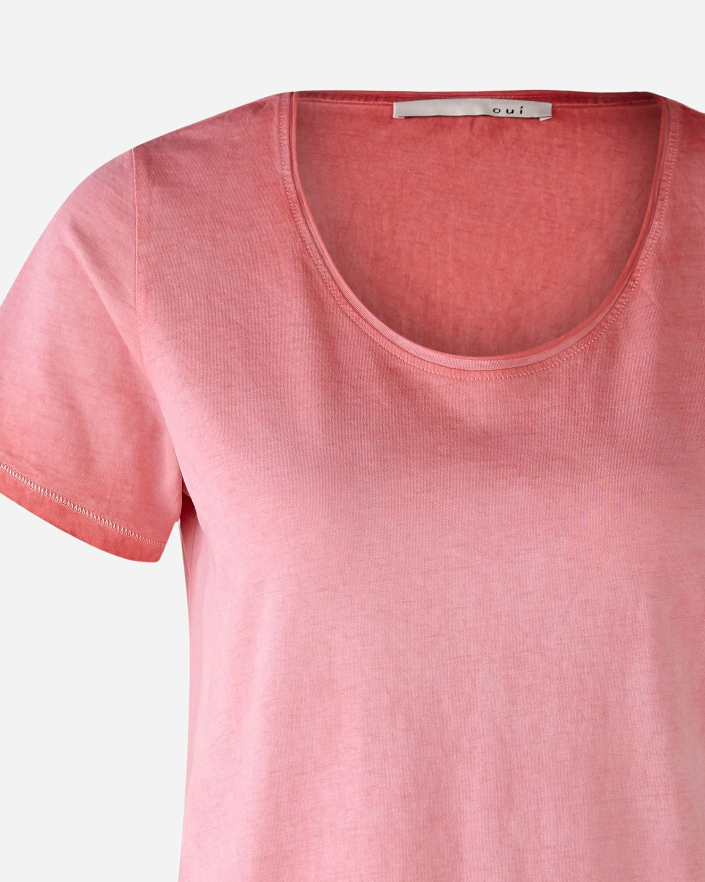 Свободная футболка OUI малинового цвета с отбеленным эффектом. Модель из 100% хлопка с глубоким круглым вырезом и короткими рукавами. Футболка - незаменимая вещь на каждый день.