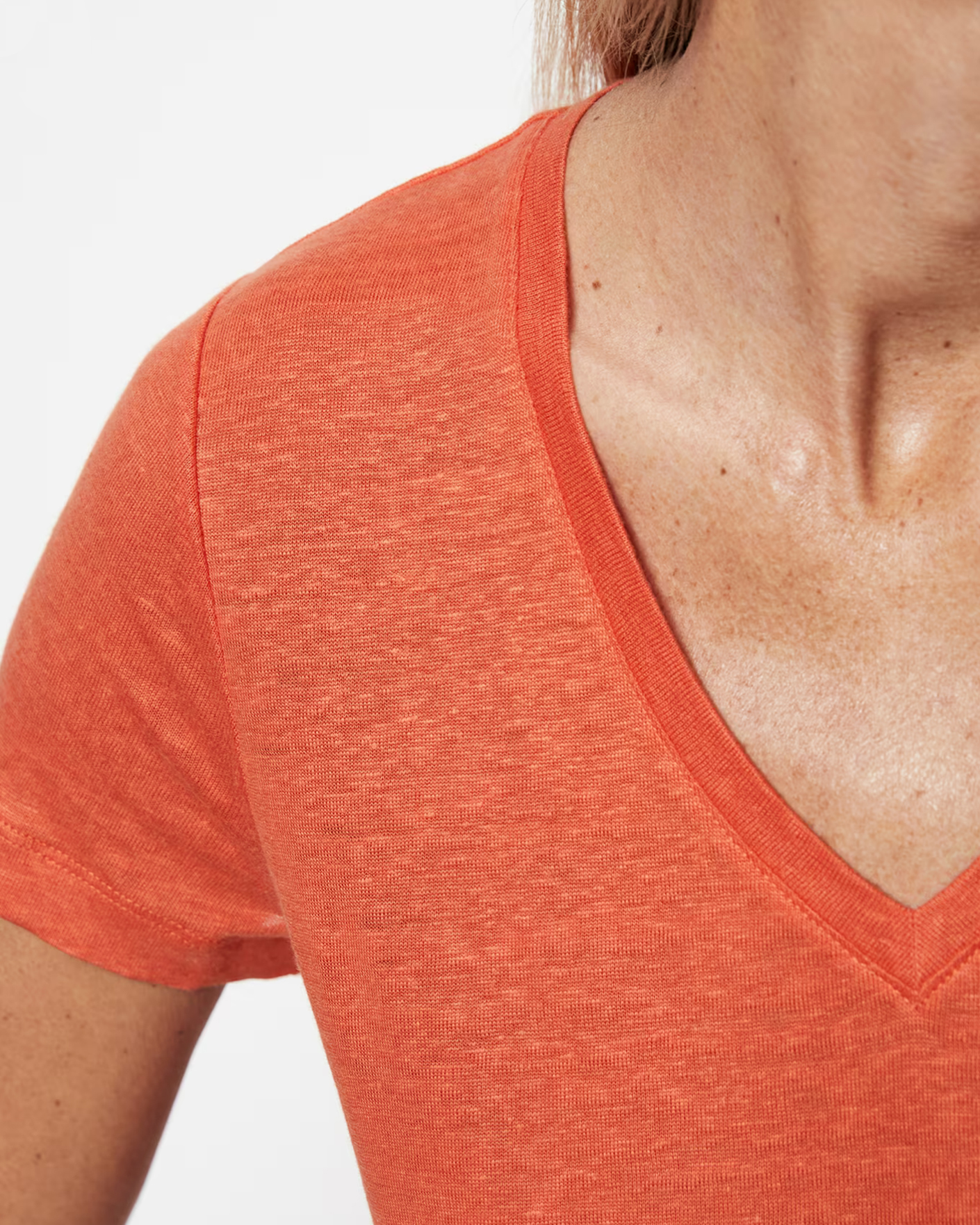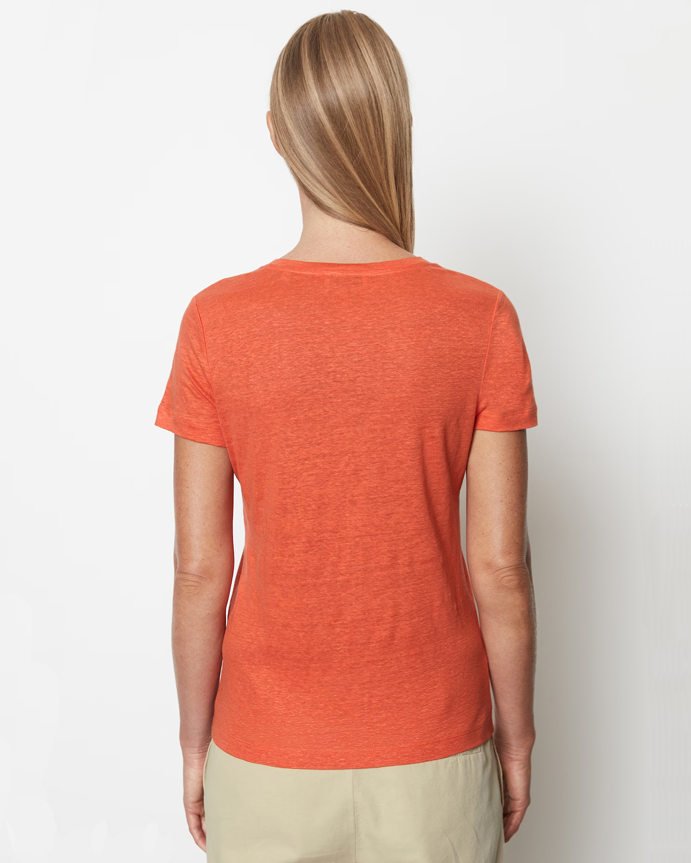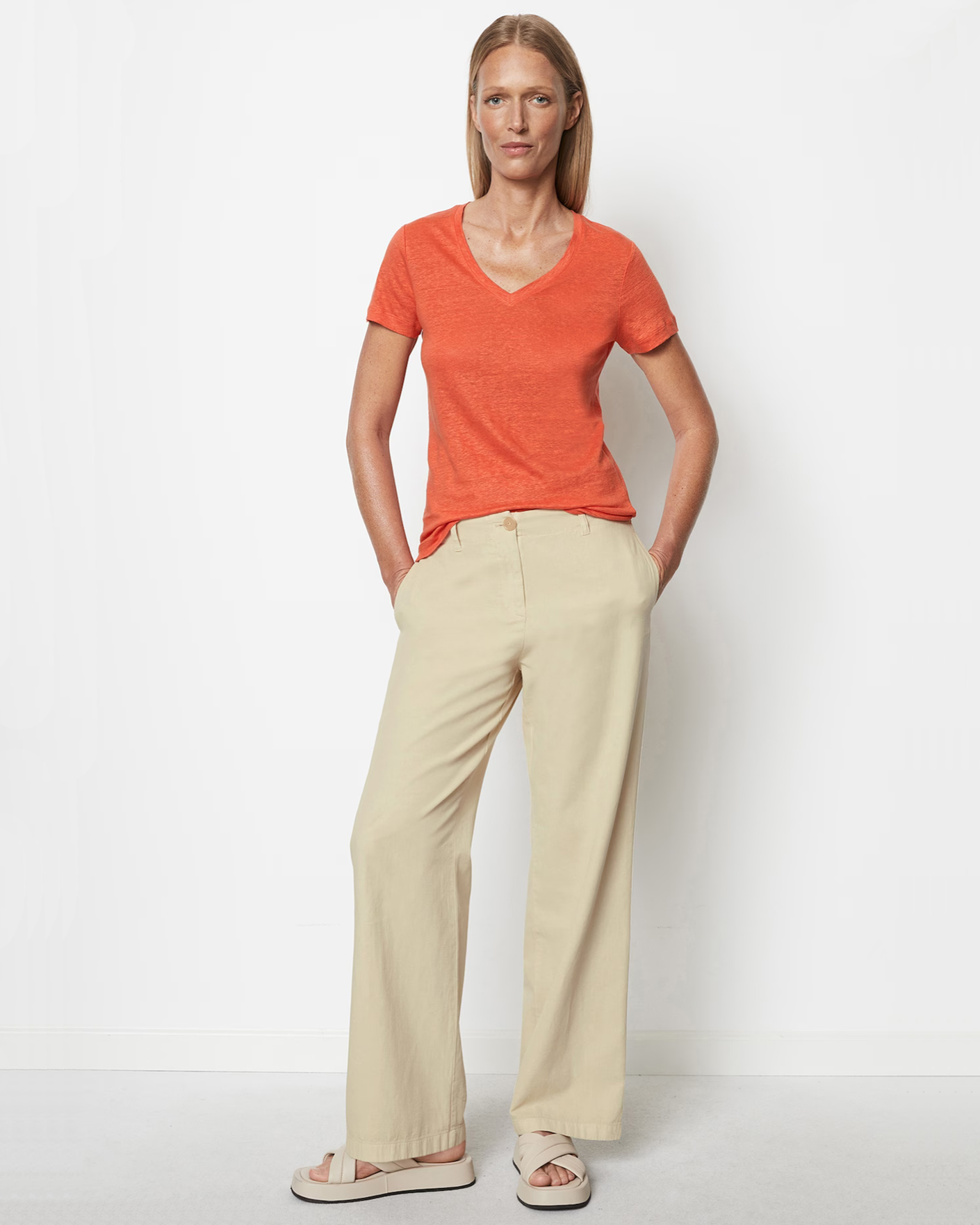 Свободная футболка Marc O'Polo оранжевого цвета в строчный рисунок. Модель из 100% льна с V-образным вырезом и короткими рукавами. Футболка - универсальная вещь на каждый день.