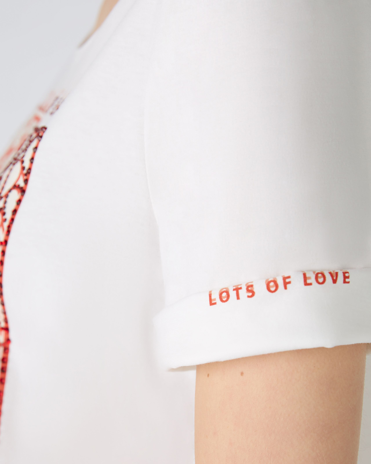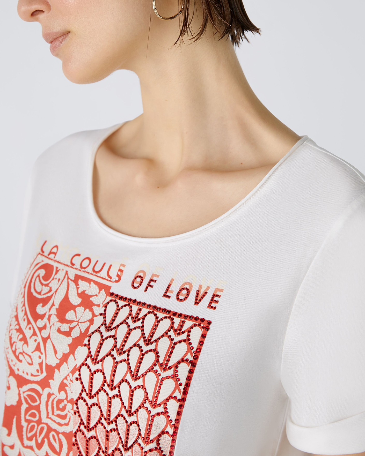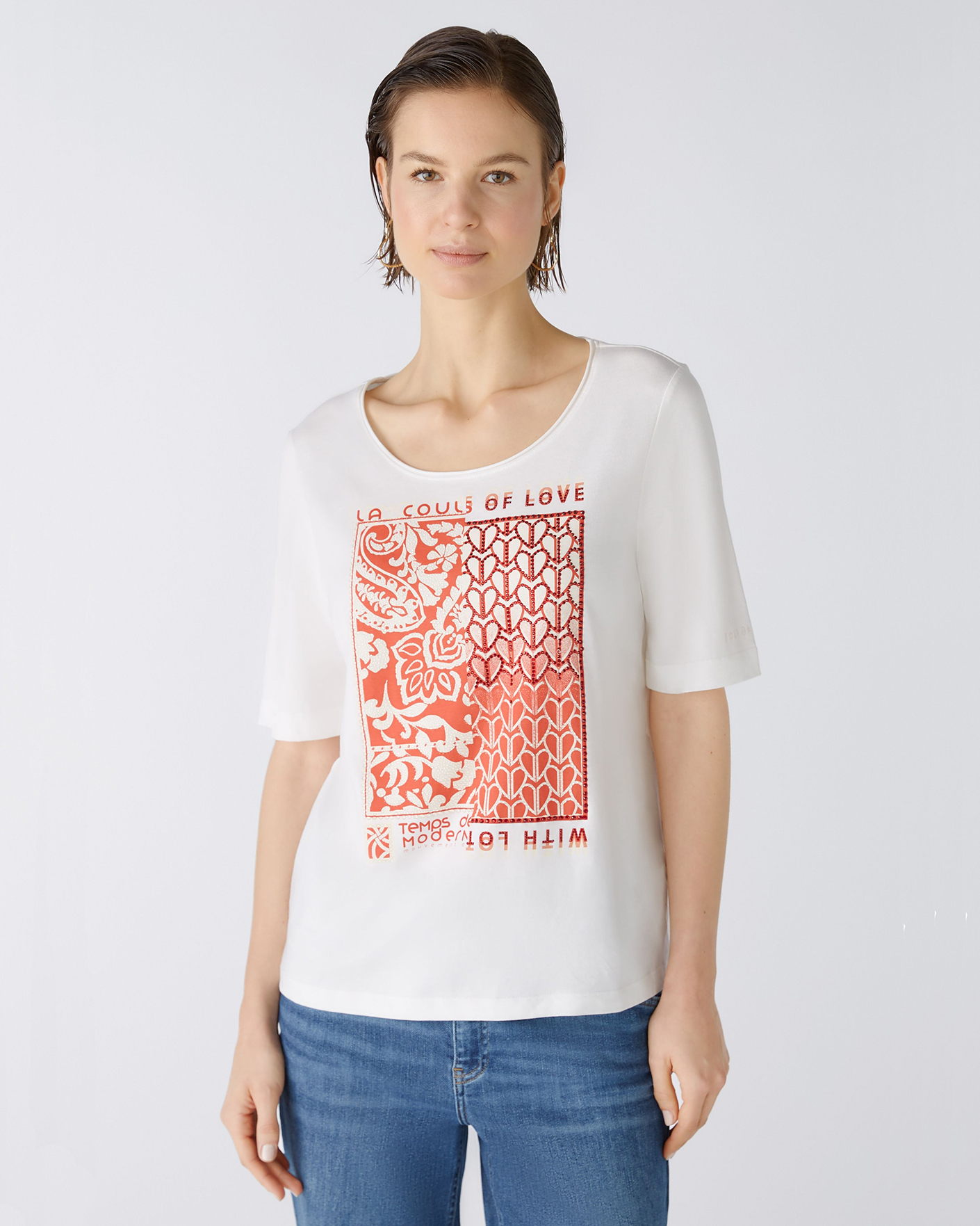 Свободная футболка OUI белого цвета с нагрудным принтом и декором в виде страз. Модель из 100% хлопка с круглым вырезом и короткими рукавами. Футболка - универсальная вещщь на каждый день.