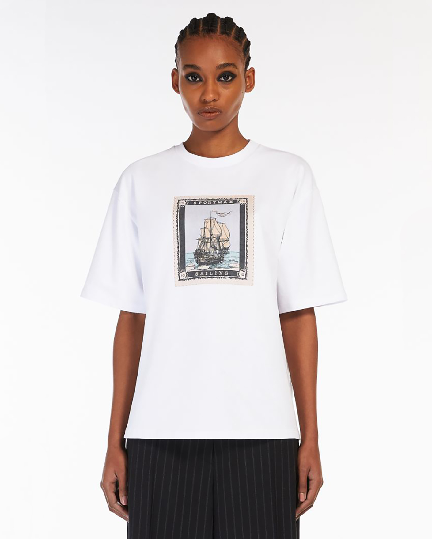 Свободная футболка Sportmax белого цвета с нагрудным принтом в виде корабля. Модель с круглым вырезом, спущенной линией плеча и короткими рукавами выполнена из 100% хлопка. Футболка - незаменимая вещь на каждый день.
