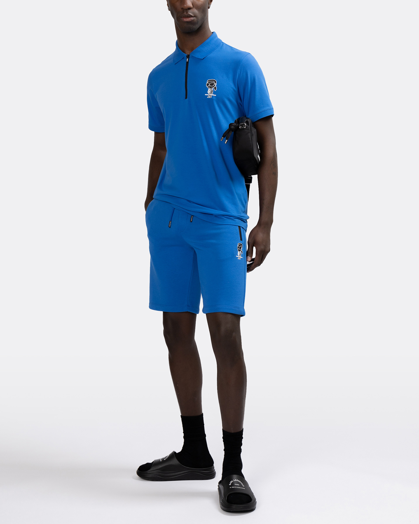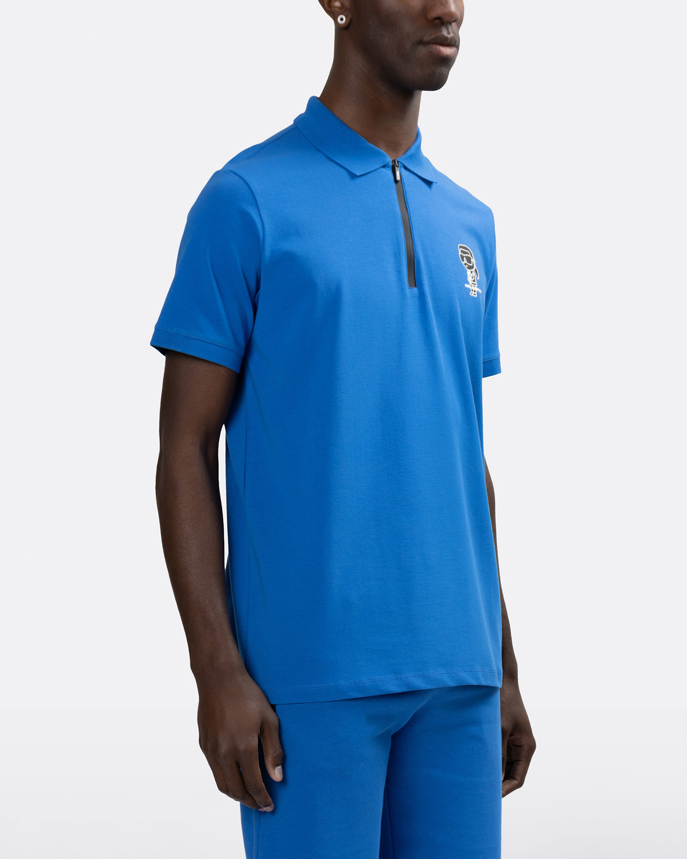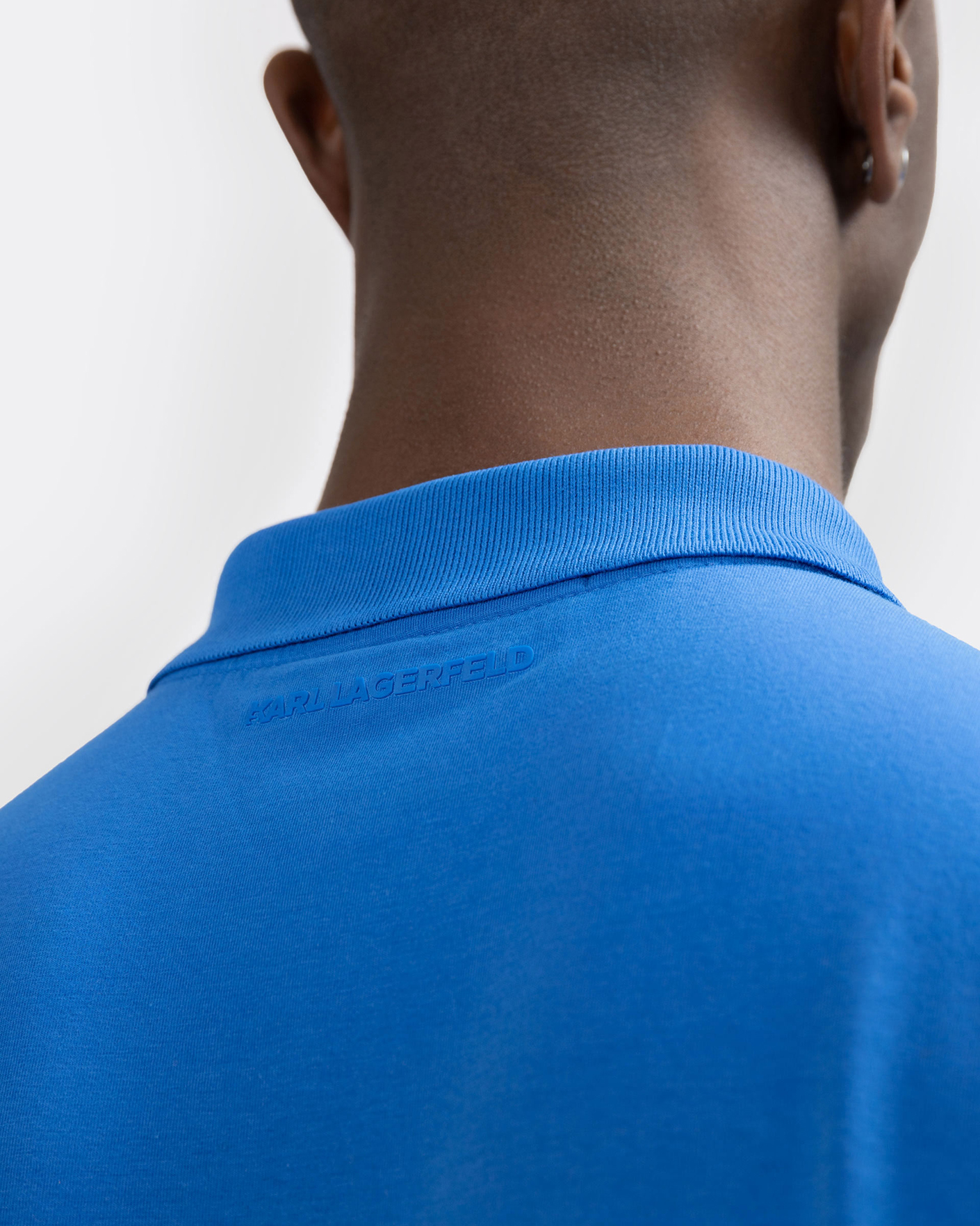 Футболка-поло Karl Lagerfeld синего цвета с небольшим узнаваемым логотипом на груди. Модель с отложным воротником в ребристый рисунок и планкой на молнии. Футболка-поло станет незаменимой частью вашего гардероба.
