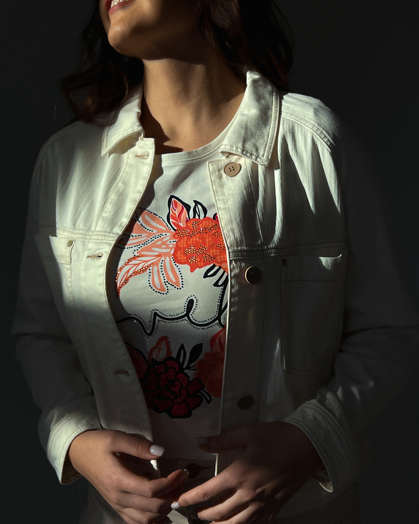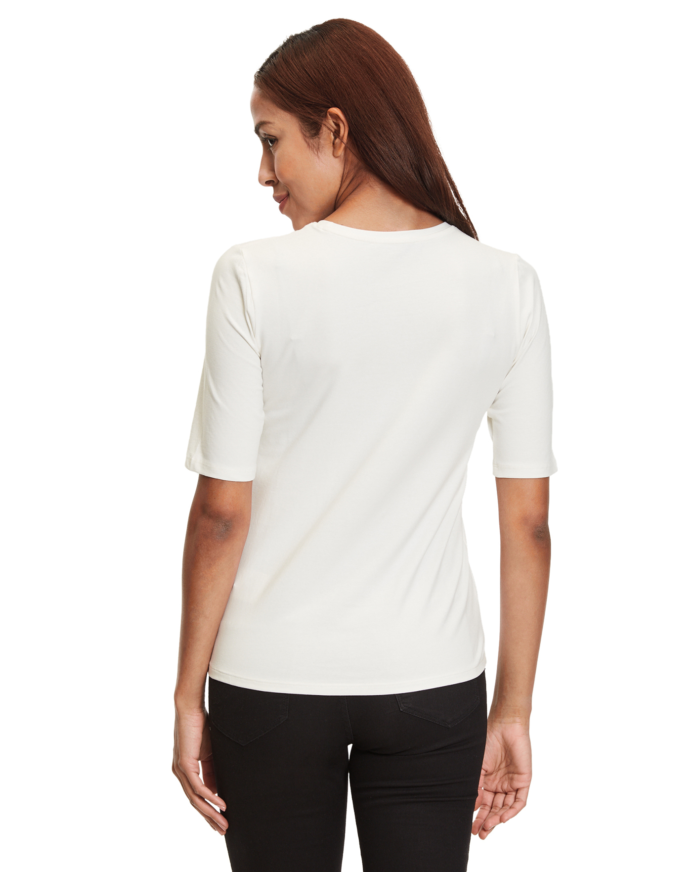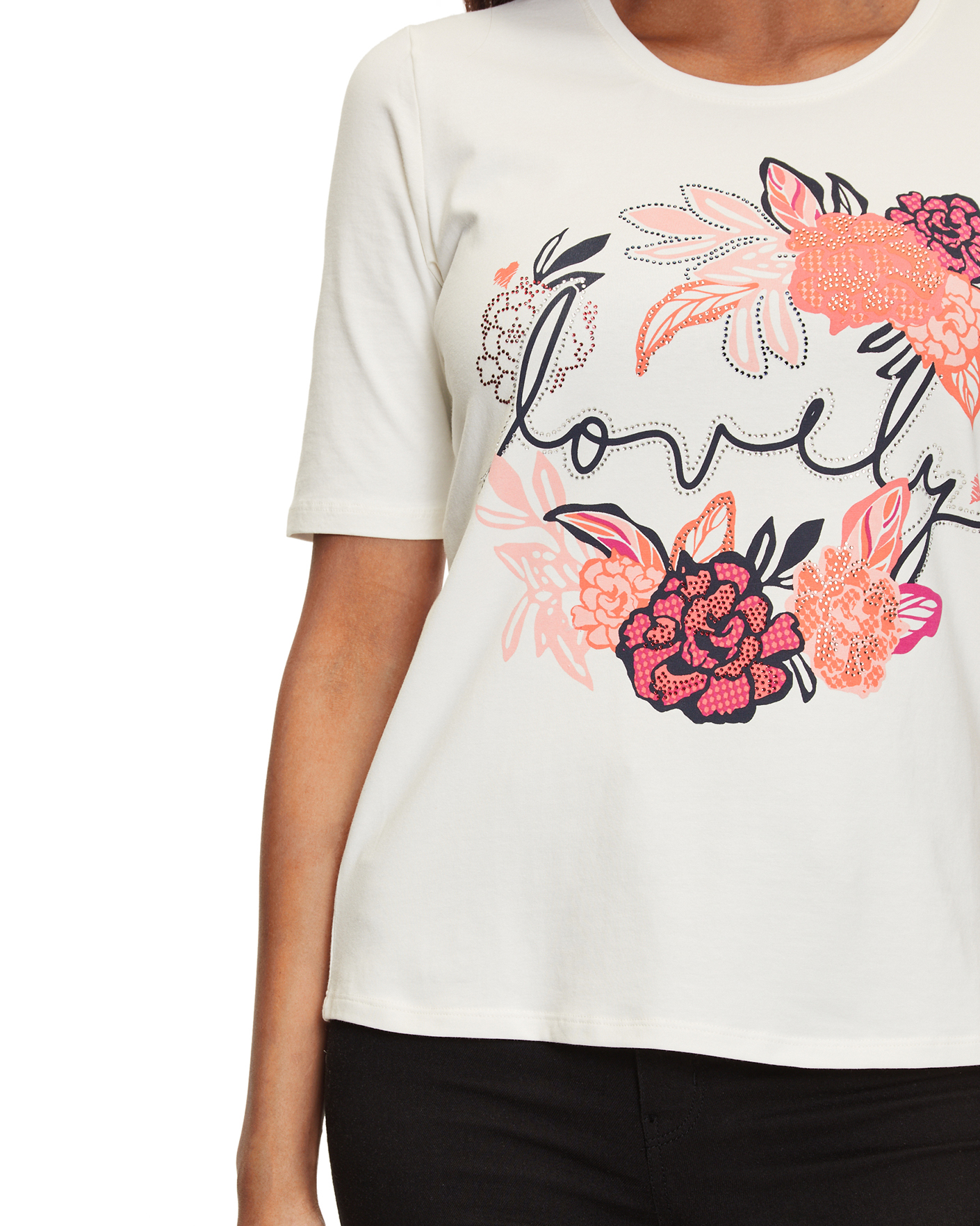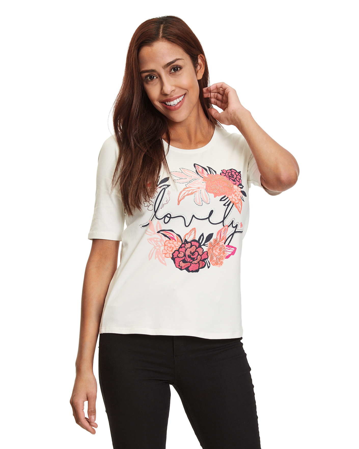 Полуприталенная футболка Betty Barclay белого цвета в цветочным принтом с надписью и декором страз по центру. Хлопковая модель с круглым вырезом и короткими рукавами. Футболка - базовая вещь на каждый день.
