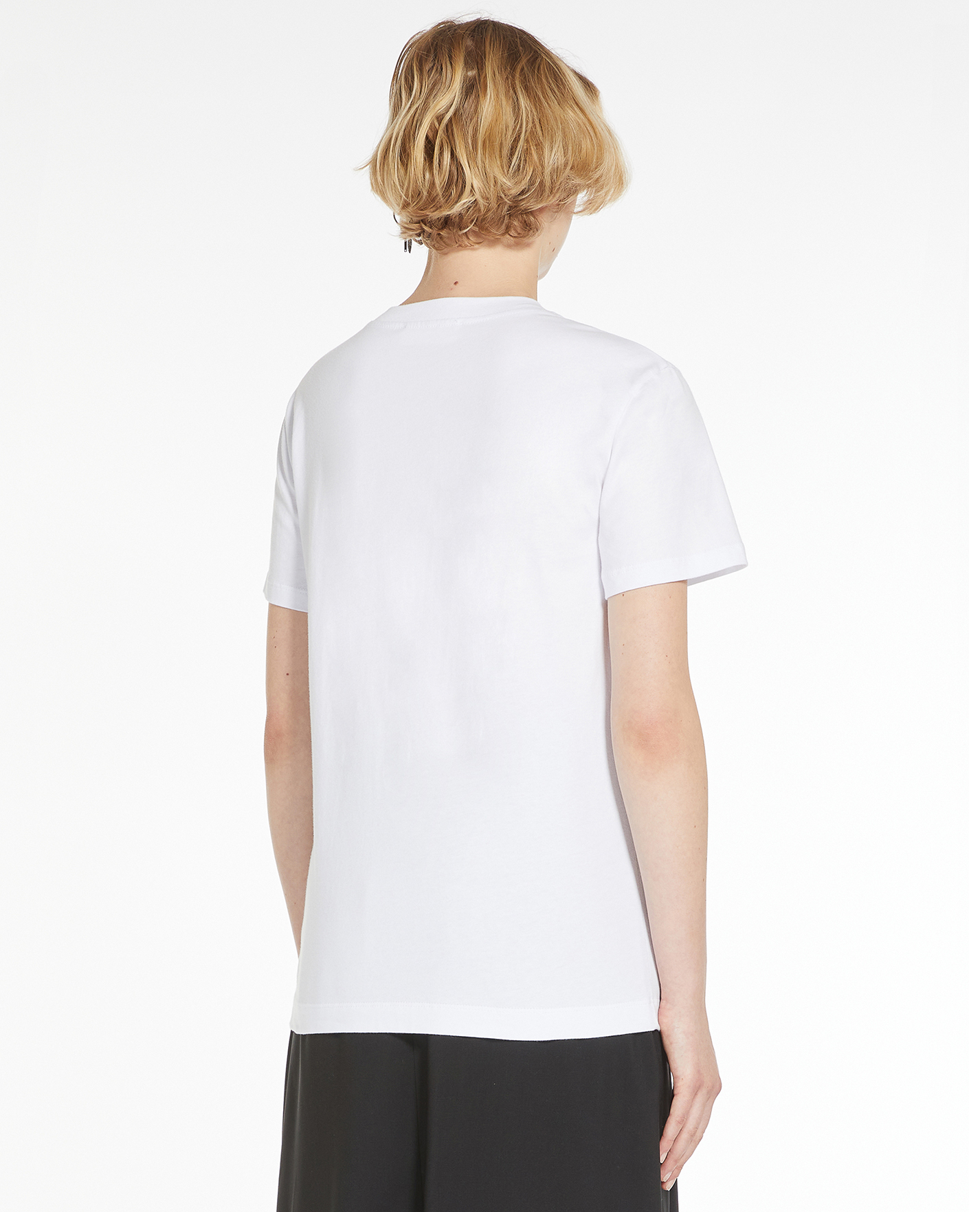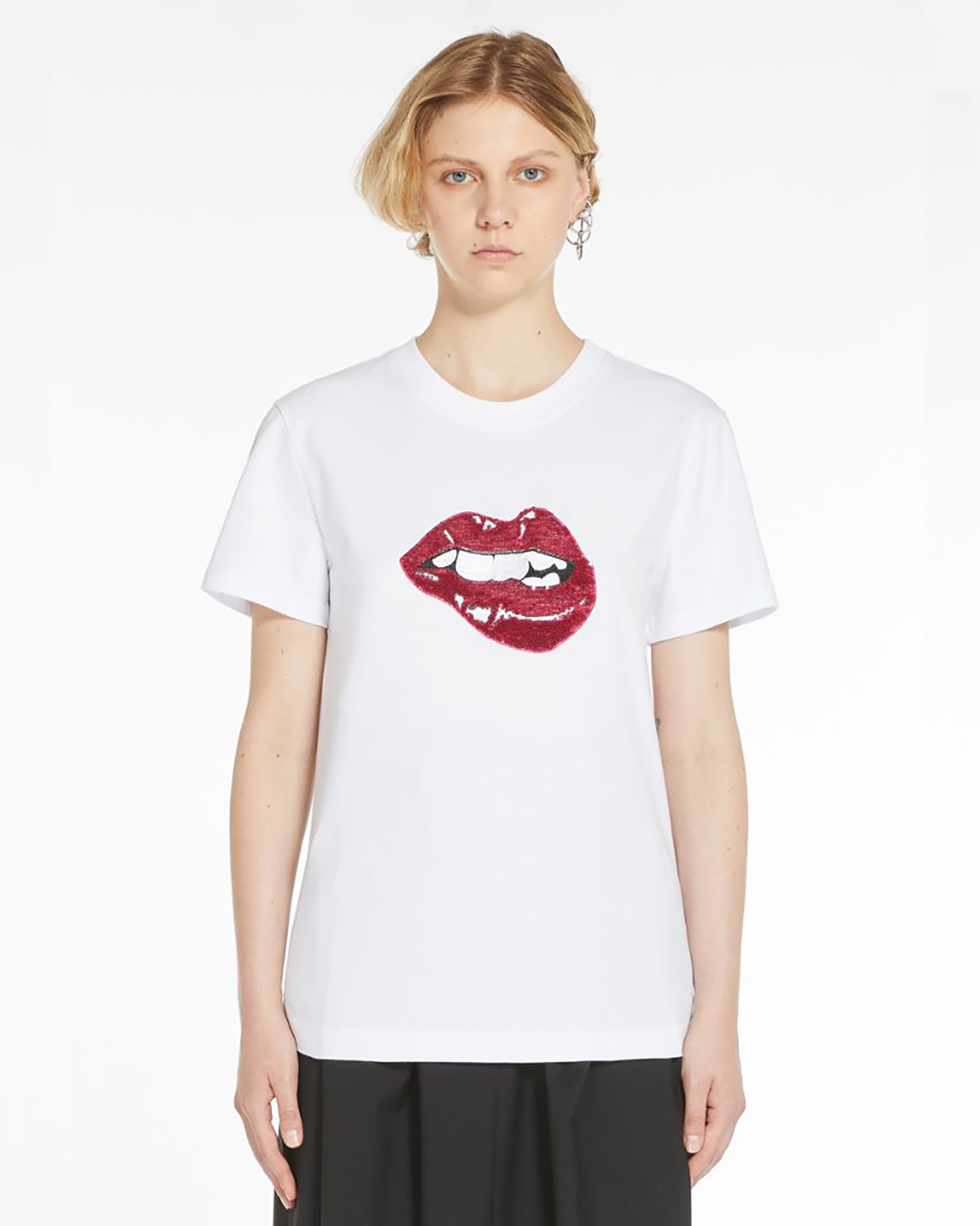 Свободная футболка Sportmax белого цвета выполнена из 100% хлопка. Модель с узорной вышивкой губ пайетками и пряжей в разных техниках по центру. Круглый вырез и короткие рукава. Футболка отлично впишется в ваш гардероб.